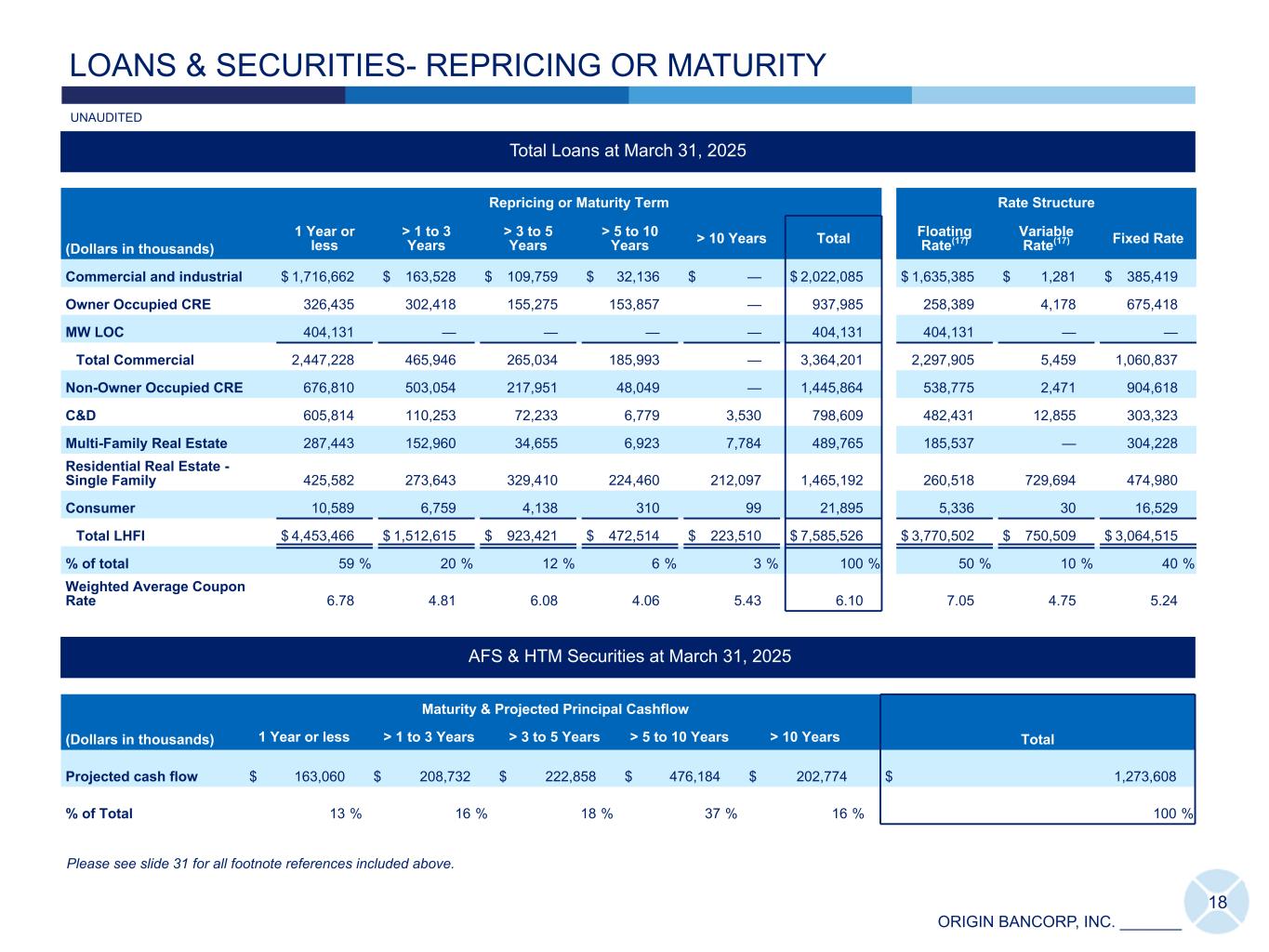 ORIGIN BANCORP,INC. _______ 3月31日贷款总额,2025年(千美元)重定价或到期期限利率1年或以下Structure > 1至3年> 3至5年> 5至10年> 10年总浮动利率(17)浮动利率(17)固定利率商业工业$ 1,716,662 $ 163,528 $ 109,759 $ 32,136 $ — $ 2,022,085 $ 1,635,385 $ 1,281 $ 385,419业主占用CRE 326,435302,418155,275153,857 — 937,985258,3894,178675,418 MW LOC 404,131 ———— 404,131404,131 ——商业总额2,447,228465,946265,034185,993 — 3,364,201,297,9055,4591,060,837非业主占用CRE 676,810503,054217,95148,049 — 1,445,864538,7752,471904,618建发605,260,518729,694474,980 Consumer 10,5896,7594,1383 109921,8955,3363016,529 Total LHFI $ 4,453,466 $ 1,512,615 $ 923,421 $ 472,514 $ 223,510 $ 7,585,526 $ 3,770,502 $ 750,509 $ 3,064,515% of total 59% 20% 12% 6% 3% 100% 50% 10% 40%加权平均票面利率6.78 4.8 16.08 4.065.4 36.107.05 4.755.24 AFS & HTM Securities at March 31,2025年(千美元)到期&预计本金现金流总额1年或以下> 1至3年> 3至5年> 5至10年> 10年预计现金流163,060美元208,732美元222,858美元476,184美元202,774美元1,273,608%总额13% 16% 18% 37% 16% 100%贷款和证券-再定价或到期18未经审计请参见幻灯片31,了解上述所有脚注参考。