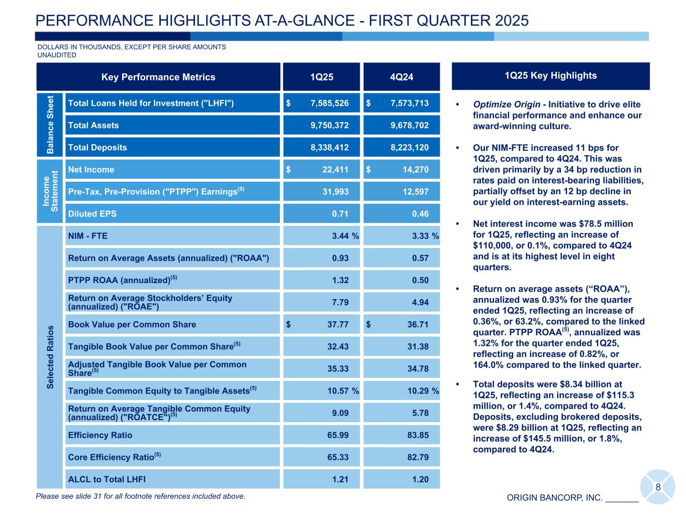 ORIGIN BANCORP,INC. _______•优化Origin-主动推动精英财务业绩并提升我们屡获殊荣的文化。•与24年第四季度相比,我们的NIM-FTE在25年第一季度增长了11个基点。这主要是由于有息负债支付的利率降低了34个基点,部分被我们的生息资产收益率下降12个基点所抵消。• 25年第一季度的净利息收入为7850万美元,与24年第四季度相比增加了11万美元,即0.1%,处于8个季度以来的最高水平。•平均资产回报率(“ROAA”),截至25年第一季度的季度年化为0.93%,与挂钩季度相比增长0.36%,即63.2%。截至2015年第一季度的季度,PTPP ROAA(5),年化为1.32%,反映了0.82%的增长,或与挂钩季度相比增长164.0%。• 25年第一季度存款总额为83.4亿美元,与24年第四季度相比增加了1.153亿美元,即1.4%。不包括经纪存款的存款在25年第一季度为82.9亿美元,与24年第四季度相比增加了1.455亿美元,即1.8%。关键绩效指标1Q25 4Q24 B al an ce s he et Total Loans Holding for Investment(“LHFI”)$ 7,585,526 $ 7,573,713 Total assets 9,750,3729,678,702 Total deposits 8,338,4128,223,120 in co m e st at em en t Net income $ 22,411 $ 14,270 Pre-tax,拨备前(“PTPP”)收益(5)31,99312,597稀释后EPS 0.7 10.46 SE le ct ed R at io s NIM-FTE 3.44% 3.33%平均资产回报率(年化)(“ROAA”)0.93 0.57 PTPP ROAA(年化)(5)1.32 0.50平均股东权益回报率(年化)(“ROAE”)7.79 4.94每股普通股账面价值$ 37.77 $ 36.71每股普通股有形账面价值(5)32.43 31.38调整后每股普通股有形账面价值(5)35.33 34.78有形普通股权益比有形资产(5)10.57% 10.29%平均有形普通股权益回报率(年化)(“ROATCE”)(5)9.09 5.78效率比65.9983.85核心效率比82.79 ALCL与总LHFI 1.21 1.20美元(单位:千美元),每股金额除外未经审计的8个业绩亮点一目了然-2025年第一季度25主要亮点请参见幻灯片31,了解上述所有脚注参考。