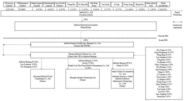 | ● | “InfoBird Cayman”、“公司”、“我们”“我们”和“我们的”是指讯鸟软件有限公司,一家根据开曼群岛法律注册成立的控股公司,及其子公司,Infobird HK和Infobird WFOE,在描述我们的运营和合并财务信息时,还包括可变利益实体,资讯鸟北京及其子公司资讯鸟贵阳、资讯鸟安徽和上海奇树。 |