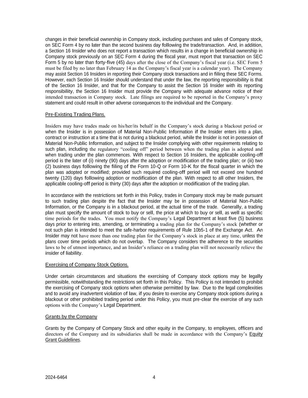 2024-6464不迟于交易/交易后的第二个工作日在SEC表格4上对其公司股票实益所有权进行4次变更,包括购买和出售公司股票。此外,第16条内幕信息知情人如未在会计年度报告先前在SEC表格4上导致公司股票实益所有权发生变化的交易,则必须在不迟于公司会计年度结束后的四十五(45)天内在SEC表格5上报告该交易(即SEC表格5必须在不迟于2月14日之前提交,因为公司的会计年度是一个日历年度)。公司可能会协助第16条内部人士报告其公司股票交易并提交这些SEC表格。然而,每个第16条内幕人士都应该明白,根据法律,报告责任是第16条内幕人士的责任,而为了公司协助第16条内幕人士履行其报告责任,第16条内幕人士必须向公司提供他们打算交易公司股票的充分事先通知。逾期提交的文件必须在公司的代理声明中报告,并可能对个人和公司造成其他不利后果。预先已有的交易计划。内幕人士可能会在禁售期内或当内幕人士在非禁售期内订立计划、合同或指示时代表其进行公司股票的交易,而内幕人士并不拥有重大非公开信息,且须遵守内幕人士遵守与该计划有关的其他要求,包括交易计划被采纳至计划下交易开始之间的监管“冷却”期。就第16条内部人士而言,适用的冷静期为(i)采纳或修改交易计划后九十(90)天内较晚者;或(ii)就采纳或修改计划的财政季度提交表格10-Q或表格10-K后的两(2)个营业日;但该规定的冷静期将不超过采纳或修改计划后一百二十(120)天内。就所有其他内幕人士而言,适用的冷静期为采纳或修改交易计划后三十(30)天。根据本政策规定的限制,尽管内幕人士在交易的实际时间可能掌握重大非公开信息,或公司处于禁售期,但仍可根据该交易计划进行公司股票交易。通常,交易计划必须具体说明买卖股票的数量、买卖的价格,以及交易的具体时间段。您必须在订立、修订或终止公司股票交易计划(无论该计划是否旨在满足《交易法》第10b5-1条规则的安全港要求)之前至少五(5)个工作日通知公司法务部。内幕人士在任何时候不得有多于一份公司股票的交易计划,除非计划涵盖的时间段不重叠。公司认为遵守证券法至关重要,内幕信息知情人对交易计划的依赖并不一定会解除内幕信息知情人的责任。公司股票期权的行使。在某些情况和情况下,行使公司股票期权可能在法律上是允许的,尽管本政策规定了限制。本政策无意在法律另有许可的情况下禁止行使公司股票期权。由于法律上的复杂性以及为避免任何无意中的违法行为,如果您希望在本政策下的停电或其他禁止交易期间行使任何公司股票期权,您必须与公司法务部预先清算任何此类期权的行使。公司授予公司股票和公司其他股权,授予公司及其子公司的员工、高级管理人员和董事,应按照公司股权授予指引进行。