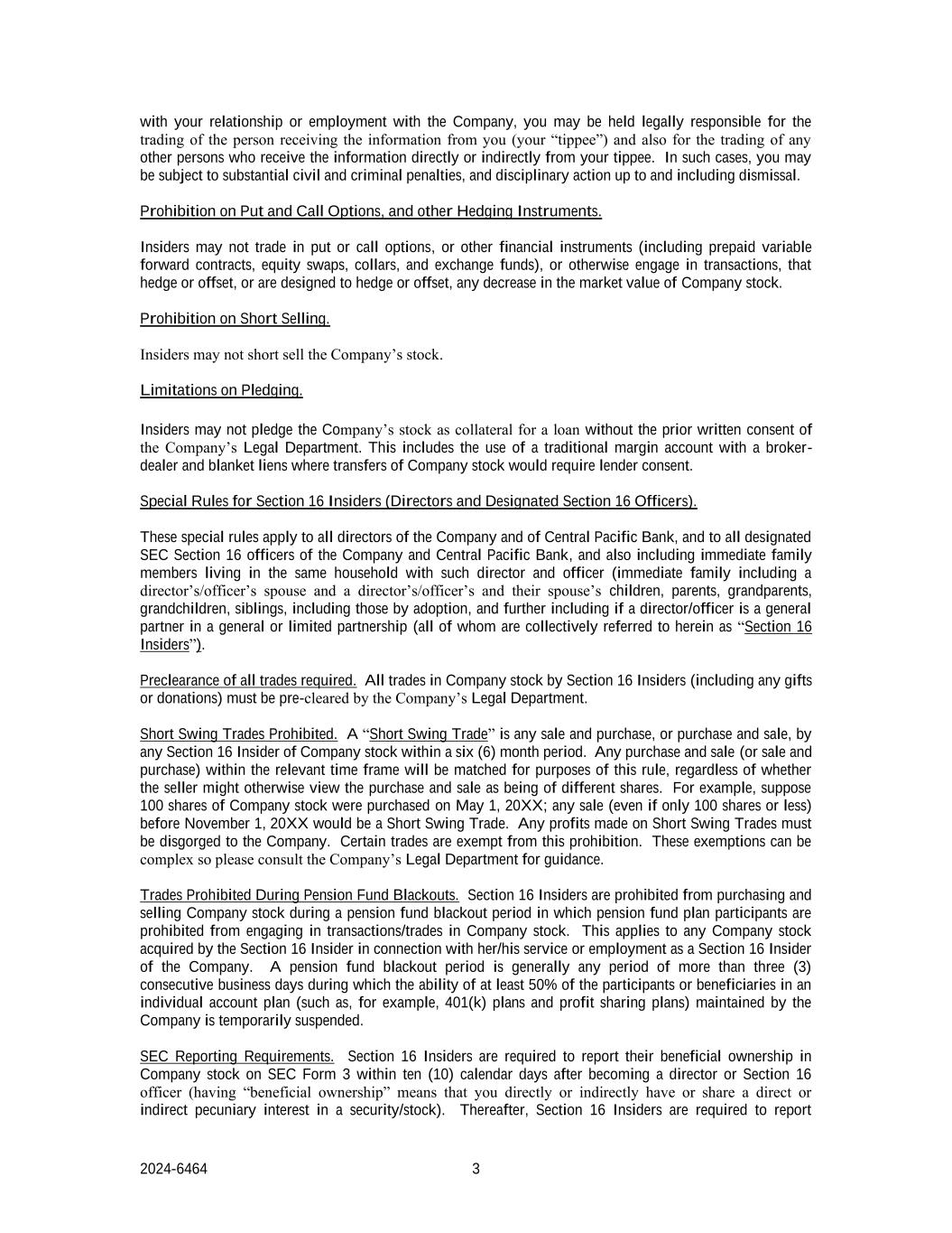 2024-6464 3与您与公司的关系或雇佣关系,您可能会对从您那里收到信息的人的交易(您的“tippee”)以及直接或间接从您的tippee收到信息的任何其他人的交易承担法律责任。在这种情况下,你可能会受到实质性的民事和刑事处罚,并受到纪律处分,直至并包括解雇。禁止看跌和看涨期权,以及其他套期保值工具。内部人士不得交易看跌期权或看涨期权,或其他金融工具(包括预付可变远期合约、股权互换、项圈和交易所基金),或以其他方式从事交易,以对冲或抵消,或旨在对冲或抵消公司股票市值的任何下降。禁止卖空。内部人士不得卖空公司股票。对质押的限制。内幕信息知情人未经公司法务部事先书面同意,不得质押公司股票作为贷款担保物。这包括使用与经纪自营商的传统保证金账户和一揽子留置权,在这种情况下,公司股票的转让需要得到贷方的同意。第16条内幕人士(董事及指定第16条高级人员)特别规则。这些特别规则适用于公司和中央太平洋银行的所有董事,适用于公司和中央太平洋银行所有指定的SEC第16条高级管理人员,还包括与该董事和高级管理人员居住在同一家庭的直系亲属(直系亲属包括董事/高级管理人员的配偶和董事/高级管理人员及其配偶的子女、父母、祖父母、孙辈、兄弟姐妹,包括通过收养的人,如果董事/高级管理人员是普通合伙企业或有限合伙企业的普通合伙人,则进一步包括(所有这些人在此统称为“第16条内部人”)。所需的所有交易的预先许可。第16条内部人士进行的所有公司股票交易(包括任何赠与或捐赠)必须经过公司法务部的预先清算。禁止做空波段交易。“卖空交易”是指任何第16条内幕人士在六(6)个月期间内买卖或买卖公司股票。在相关时间范围内的任何买卖(或买卖)将为本规则的目的进行匹配,无论卖方是否可能以其他方式将买卖视为不同的股份。例如,假设在20XX年5月1日买入100股公司股票;在20XX年11月1日之前的任何卖出(即使只有100股或更少)都是做空波段交易。任何在做空波段交易中获得的利润都必须上缴公司。某些行业不受这一禁令的约束。这些豁免可能很复杂,因此请咨询公司法务部以获得指导。养老基金停电期间禁止交易。第16条在禁止养老基金计划参与人从事交易/买卖公司股票的养老基金停牌期内,禁止内部人买卖公司股票。这适用于第16条内幕人士因其作为公司第16条内幕人士的服务或受雇而获得的任何公司股票。养老基金禁售期一般是指公司维持的个人账户计划(例如401(k)计划和利润分享计划)中至少50%的参与者或受益人的能力暂时停止的连续三(3)个工作日以上的任何时期。SEC报告要求。第16条内部人必须在成为董事或第16条高级管理人员后的十(10)个日历日内,在SEC表格3上报告其对公司股票的实益所有权(拥有“实益所有权”是指您直接或间接拥有或分享对证券/股票的直接或间接金钱利益)。此后,第16条内幕信息知情人须报备