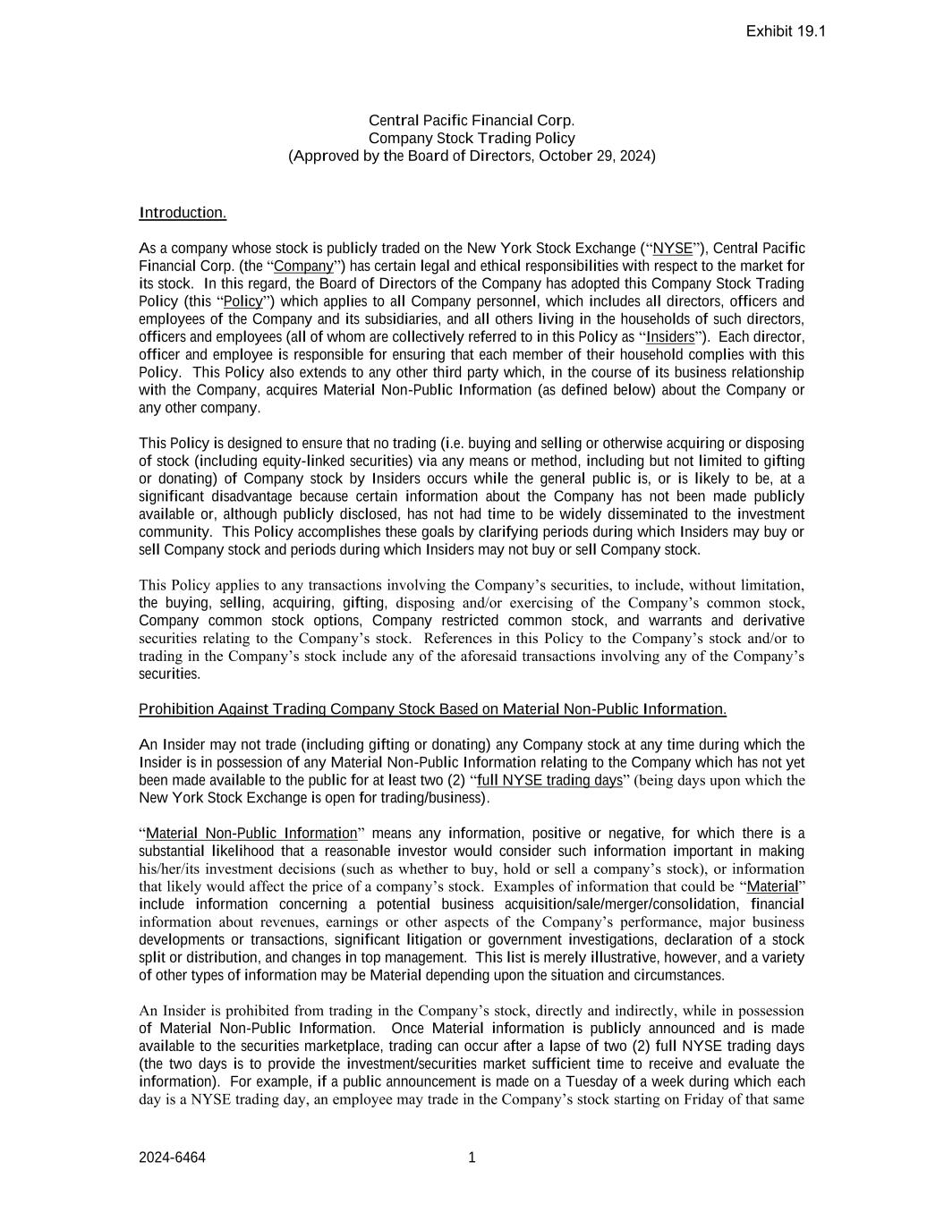 2024-6464 1 Central Pacific Financial Corp.公司股票交易政策(2024年10月29日董事会批准)简介。作为一家其股票在纽约证券交易所(“NYSE”)公开交易的公司,Central Pacific Financial Corp.(“公司”)对其股票的市场负有一定的法律和道德责任。就此,公司董事会已采纳本公司股票交易政策(本“政策”),适用于所有公司人员,包括公司及其附属公司的所有董事、高级职员和雇员,以及居住在该等董事、高级职员和雇员(在本政策中统称为“内部人士”)的所有其他人。每位董事、高级职员和雇员都有责任确保其家庭的每个成员都遵守这项政策。本政策还适用于在与公司的业务关系过程中获取有关公司或任何其他公司的重大非公开信息(定义见下文)的任何其他第三方。本政策旨在确保在公众处于或可能处于重大不利地位的情况下,不发生内幕人士通过任何方式或方法买卖或以其他方式收购或处置股票(包括与股票挂钩的证券)(包括但不限于赠与或捐赠)公司股票的交易(即买卖或以其他方式收购或处置),因为有关公司的某些信息尚未公开,或者尽管已公开披露,但尚未有时间向投资界广泛传播。该政策通过明确内部人员可以买卖公司股票的期间和内部人员不得买卖公司股票的期间来实现这些目标。本政策适用于涉及公司证券的任何交易,包括但不限于购买、出售、收购、赠与、处置和/或行使公司普通股、公司普通股期权、公司限制性普通股以及与公司股票相关的认股权证和衍生证券。本政策中对本公司股票和/或买卖本公司股票的提述包括上述涉及本公司任何证券的任何交易。禁止基于重大非公开信息买卖公司股票。内幕人士不得在任何时间交易(包括赠与或捐赠)任何公司股票,而在该期间,内幕人士拥有与公司有关的任何重大非公开信息,而该信息至少在两(2)个“纽约证券交易所完整交易日”(即纽约证券交易所开放交易/营业的日子)内尚未向公众提供。“重大非公开信息”是指任何信息,无论是正面的还是负面的,对于这些信息而言,合理的投资者很有可能会认为此类信息在做出其投资决策时很重要(例如是否购买、持有或出售一家公司的股票),或者可能会影响一家公司股票价格的信息。可能“重要”的信息示例包括有关潜在业务收购/出售/合并/合并的信息、有关收入、收益或公司业绩其他方面的财务信息、主要业务发展或交易、重大诉讼或政府调查、宣布股票分割或分配以及高层管理人员变动。然而,这份清单仅是说明性的,根据情况和情况,各种其他类型的信息可能是重要的。禁止内幕信息知情人在掌握重大非公开信息的情况下,直接或间接买卖公司股票。一旦重大信息被公开宣布并提供给证券市场,交易可以在时隔两(2)个完整的纽约证券交易所交易日后发生(这两天是为投资/证券市场提供足够的时间来接收和评估信息)。例如,如果在一周的星期二发布公告,期间的每一天都是纽约证券交易所的交易日,则员工可以从同一附件 19.1的星期五开始交易该公司的股票