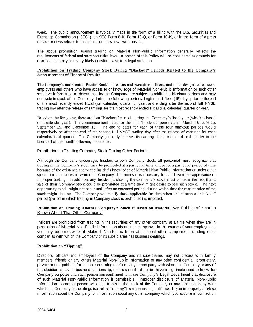 2024-6464 2周。该公告通常以向美国证券交易委员会(“SEC”)提交文件的形式发布,以SEC表格8-K、表格10-Q或表格10-K的形式发布,或以新闻稿或新闻稿的形式向全国商业新闻通讯社服务发布。上述禁止在重大非公开信息上进行交易的规定一般反映了联邦和州证券法的要求。违反这项政策将被视为解雇的理由,也很可能构成严重的法律违法行为。禁止在与公司公布财务业绩相关的“停电”期间交易公司股票。公司和中央太平洋银行的董事和执行官,以及其他指定的高级管理人员、雇员和其他有权访问或了解重大非公开信息或公司确定的其他敏感信息的人,将受到额外的禁售期限制,并且不得在以下期间交易公司的股票:从最近结束的财政(即日历)季度或年度结束前十五(15)天开始,并在最近结束的财政(即日历)季度或年度的收益发布后的第二个完整的纽约证券交易所交易日后结束。基于上述情况,公司会计年度(以日历年度为基础)有四个“停电”期。四个“停电”时段的开工日期分别为:3月16日、6月15日、9月15日、12月16日。这四个停电期的结束日期将分别在每个日历/财政季度收益发布后的第二个完整的纽约证券交易所交易日结束之后。该公司通常会在该季度的下一个月的后期发布其日历/财政季度的收益。其他期间禁止买卖公司股票。虽然公司鼓励内幕人士拥有公司股票,但所有人员必须认识到,由于存在和/或内幕人士知悉重大非公开信息或在公司认为有必要避免甚至出现不正当交易的其他特殊情况下,在特定时间和/或特定时期内,可能会禁止买卖公司股票。此外,任何购买公司股票的内部人士都必须考虑在他们可能希望出售此类股票时可能禁止出售其公司股票的风险。下一次卖出的机会可能要经过一段时间后才会出现,在此期间股票的市场价格可能会下降。公司将在何时以及如果实施此类“禁售期”(禁止买卖公司股票的期间)时通知这些适用的内部人士。禁止基于知悉的关于该另一公司的重大非公开信息买卖该另一公司股票。禁止内幕信息知情人在掌握任何其他公司重大非公开信息的同时买卖该公司的证券。在任职过程中,可能知悉其他公司的重大非公开信息,包括公司或子公司与之有业务往来的其他公司。禁止“给小费”。公司及其附属公司的董事、高级职员和雇员不得与家人、朋友或任何其他人讨论有关公司或与公司或其任何附属公司有业务关系的任何一方的重大非公开信息或任何其他机密、专有、私人或非公开信息,除非该等第三方出于公司目的有正当需要知道,且该人已与公司法务部确认允许披露该等重大非公开信息。向另一人不当披露重大非公开信息,进而交易公司股票或与公司有交易往来的任何其他公司股票(所谓“给小费”),是严重的法律违法行为。如你不当披露有关公司的资料,或有关你所收购的任何其他公司的资料