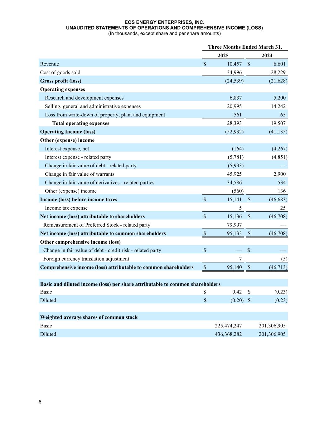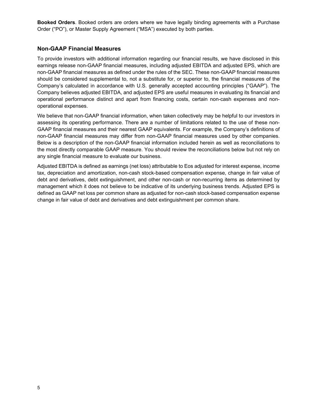 5个已预订订单。预订订单是指我们与双方执行的采购订单(“PO”)或主供应协议(“MSA”)签订具有法律约束力的协议的订单。非GAAP财务指标为了向投资者提供有关我们财务业绩的更多信息,我们在本财报中披露了非GAAP财务指标,包括调整后EBITDA和调整后EPS,这是SEC规则定义的非GAAP财务指标。这些非GAAP财务指标应被视为补充、而不是替代或优于公司根据美国公认会计原则(“GAAP”)计算的财务指标。该公司认为,调整后的EBITDA和调整后的每股收益是评估其财务和运营业绩的有用衡量标准,除了融资成本、某些非现金费用和非运营费用。我们认为,非美国通用会计准则财务信息,综合起来看,可能有助于我们的投资者评估其经营业绩。这些非GAAP财务指标及其最接近的GAAP等值项的使用存在许多限制。例如,公司对非GAAP财务指标的定义可能与其他公司使用的非GAAP财务指标不同。以下是对此处包含的非GAAP财务信息的描述,以及与最直接可比的GAAP衡量标准的对账。您应该查看下面的对账,但不要依赖任何单一的财务指标来评估我们的业务。调整后EBITDA定义为经利息费用、所得税、折旧和摊销、非现金股票补偿费用、债务和衍生工具的公允价值变动、债务清偿以及管理层确定的其他非现金或非经常性项目调整后归属于EOS的收益(净亏损),管理层认为这些项目不能表明其基本业务趋势。调整后每股收益定义为GAAP每股普通股净亏损,调整后的债务和衍生工具公允价值的非现金股票补偿费用变化以及每股普通股的债务清偿。
