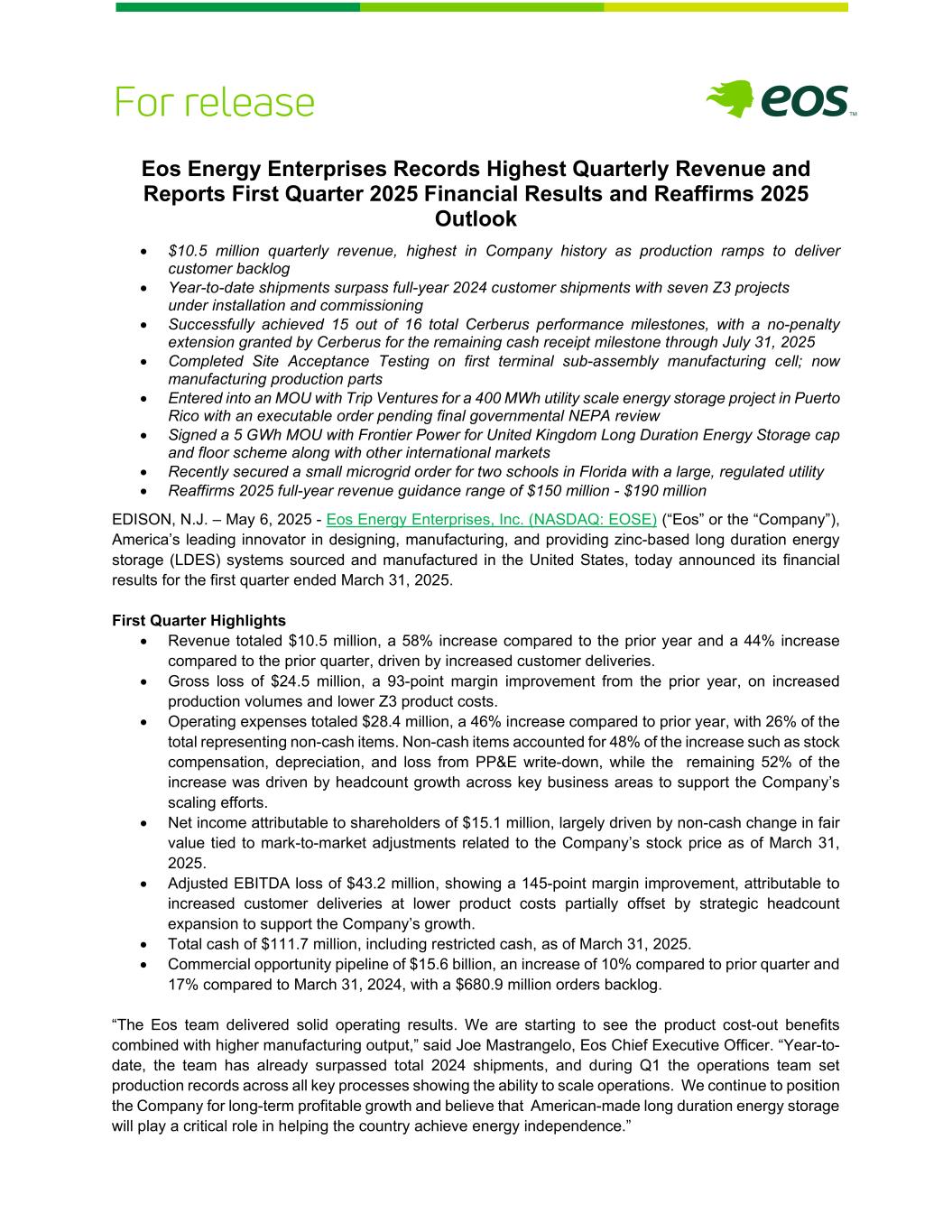 Eos Energy Enterprises录得最高季度收入,并报告2025年第一季度财务业绩,重申2025年展望•季度收入1050万美元,为公司历史最高,因为产量增加以交付客户积压订单•年初至今的出货量超过了2024年全年的客户出货量,有七个Z3项目正在安装和调试中•成功实现了Cerberus总共16个性能里程碑中的15个,Cerberus授予剩余现金收到里程碑的免罚金延期至7月31日,2025 •完成首个终端分装制造单元的现场验收测试;现制造生产零部件•与Trip Ventures就波多黎各400兆瓦时公用事业规模储能项目签订谅解备忘录,可执行订单等待政府NEPA最终审查•与Frontier Power就英国长期储能上限和下限方案与其他国际市场签署5GWh谅解备忘录•最近获得佛罗里达州两所学校的小型微电网订单,其中大型,受监管公用事业公司•重申2025年全年收入指导区间为1.5亿美元-1.9亿美元新泽西州爱迪生– 2025年5月6日-Eos Energy Enterprises, Inc. Energy Enterprises,Inc.(纳斯达克股票代码:EOSE)(“EOS”或“公司”)是美国设计、制造和提供在美国采购和制造的锌基长久期储能(LDES)系统的领先创新者,今天公布了截至2025年3月31日的第一季度财务业绩。第一季度亮点•收入总计1050万美元,与去年同期相比增长58%,与上一季度相比增长44%,这得益于客户交付量的增加。•毛亏损2450万美元,利润率较上年提高93个百分点,原因是生产量增加和Z3产品成本降低。•运营费用总计2840万美元,与上年相比增长46%,其中26%为非现金项目。非现金项目占增长的48%,如股票补偿、折旧和PP & E减记损失,而其余52%的增长是由关键业务领域的员工人数增长推动的,以支持公司的扩张努力。•归属于股东的净利润1510万美元,主要受截至2025年3月31日与公司股价相关的按市值调整相关的公允价值非现金变动推动。•调整后EBITDA亏损4320万美元,利润率提高145个百分点,原因是以较低的产品成本增加了客户交付,部分被支持公司增长的战略员工人数扩张所抵消。•截至2025年3月31日,现金总额为1.117亿美元,包括受限制现金。•商业机会管道为156亿美元,与上一季度相比增长10%,与2024年3月31日相比增长17%,订单积压为6.809亿美元。“EOS团队取得了稳健的经营业绩。我们开始看到产品成本支出带来的好处与更高的制造产量相结合,”EOS首席执行官Joe Mastrangelo表示。“年初至今,该团队的出货量已经超过了2024年的总出货量,在第一季度,运营团队在所有关键流程上都创下了生产记录,显示了规模化运营的能力。我们继续将公司定位于长期盈利增长,并相信美国制造的长持续时间储能将在帮助该国实现能源独立方面发挥关键作用。”