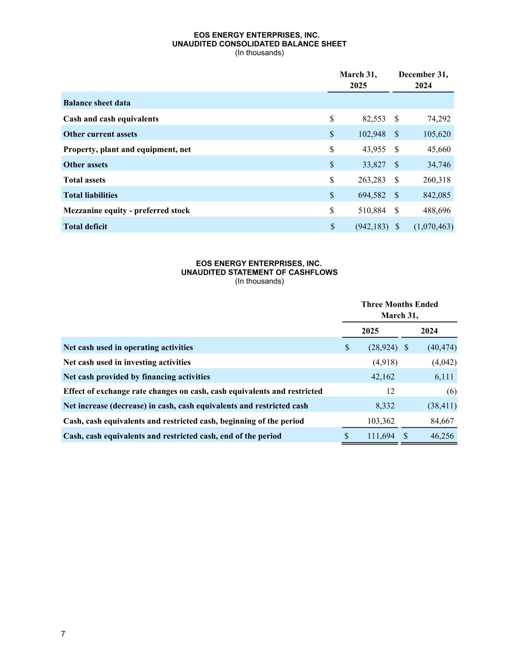 6 EOS能源企业股份有限公司未经审计的经营报表和综合收益(亏损)(以千为单位,股份和每股金额除外)截至2025年3月31日的三个月2024年收入$ 10,457 $ 6,601销售成本34,99628,229毛利润(亏损)(24,539)(21,628)营业费用研发费用6,8375,200销售、一般和管理费用20,99514,242物业、厂房和设备减记损失56165营业费用总额28,39319,507营业收入(亏损)(52,932)(41,135)其他(费用)收入利息费用,净额(164)(4,267)利息支出-关联方(5,781)(4,851)债务关联方公允价值变动(5,933)—认股权证公允价值变动45,9252,900衍生工具公允价值变动-关联方34,586534其他(费用)收入(560)136收入(亏损)所得税前$ 15,141 $(46,683)所得税费用525归属于股东的净收入(亏损)$ 15,136 $(46,708)重新计量优先股-关联方79,997 —归属于普通股股东的净收入(亏损)$ 95,133 $(46,708)其他综合收益(亏损)债务公允价值变动-信用风险-关联方$ — $ —外币折算调整7(5)归属于普通股股东的综合收益(亏损)$ 95,140 $(46,713)基本归属于普通股股东的每股摊薄收益(亏损)基本$ 0.42 $(0.23)稀释后$(0.20)$(0.23)普通股加权平均股基本225,474,247201,306,905稀释后436,368,282201,306,905