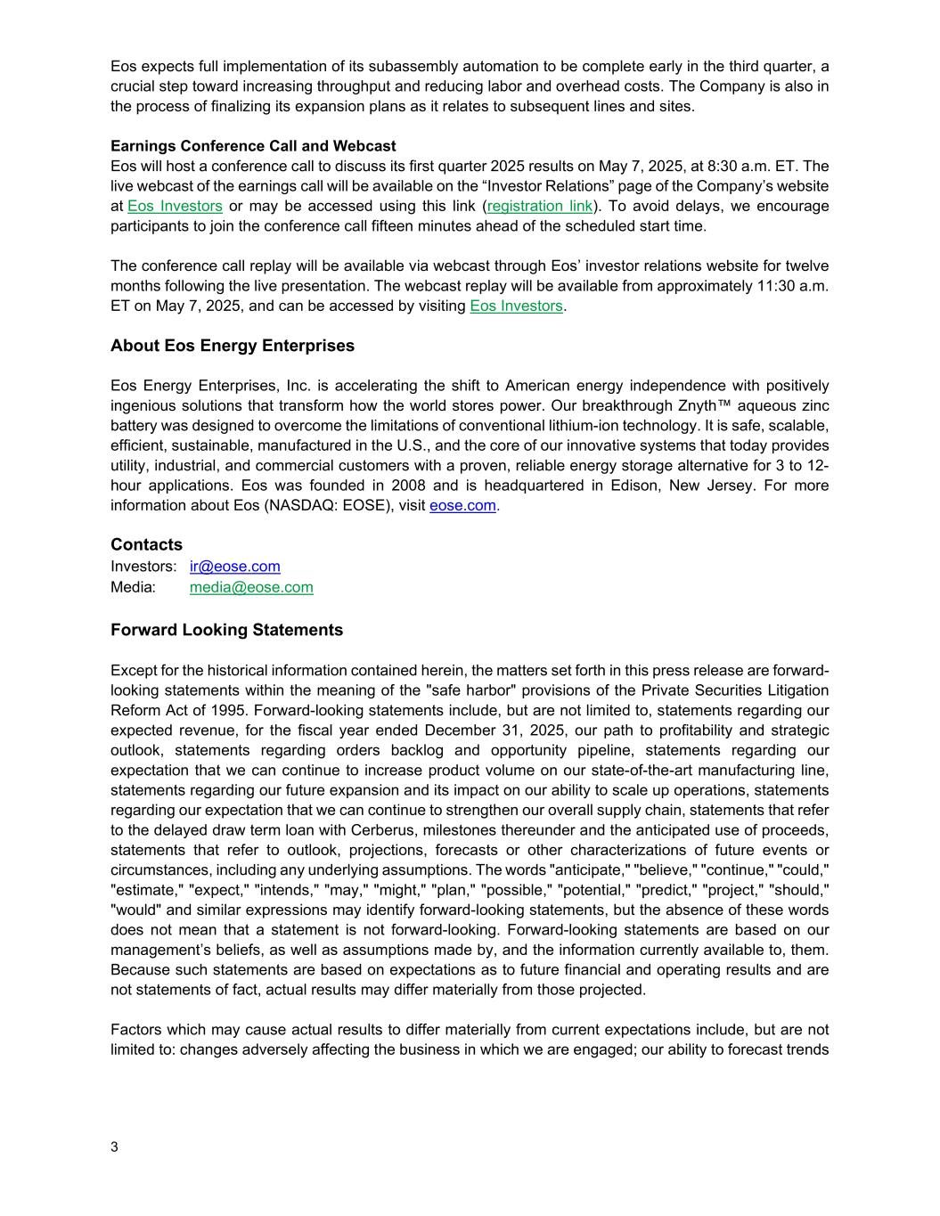3 EOS预计其子组件自动化的全面实施将在第三季度初完成,这是提高吞吐量、降低人工和间接成本的关键一步。该公司还在敲定其扩张计划,因为这与后续的线路和场地有关。收益电话会议和网络直播EOS将于美国东部时间2025年5月7日上午8:30召开电话会议,讨论其2025年第一季度业绩。财报电话会议的网络直播将在公司网站EOS Investors的“投资者关系”页面上提供,或可使用此链接(注册链接)访问。为避免延误,我们鼓励与会者在预定开始时间的十五分钟前加入电话会议。电话会议重播将在现场演示后的十二个月内通过EOS的投资者关系网站通过网络直播提供。网络直播重播将于美国东部时间2025年5月7日上午11:30左右开始提供,访问EOS Investors可以访问。关于Eos Energy企业Eos EnergyEnterprises,Inc.正在加速向美国能源独立的转变,其积极的、独具匠心的解决方案改变了世界的电力储存方式。我们的突破Znyth™水锌电池是为了克服传统锂离子技术的局限性而设计的。它安全、可扩展、高效、可持续,在美国制造,是我们创新系统的核心,如今为公用事业、工业和商业客户提供经过验证的、可靠的、可用于3至12小时应用的储能替代方案。EOS成立于2008年,总部位于新泽西州爱迪生。有关EOS(NASDAQ:EOSE)的更多信息,请访问eose.com。联系人投资者:ir@eose.com媒体:media@eose.com前瞻性陈述除此处包含的历史信息外,本新闻稿中所述事项均为1995年《私人证券诉讼改革法案》“安全港”条款含义内的前瞻性陈述。前瞻性陈述包括但不限于关于我们在截至2025年12月31日的财政年度的预期收入、我们的盈利路径和战略前景的陈述、关于订单积压和机会管道的陈述、关于我们期望我们可以继续在我们最先进的生产线上增加产品数量的陈述、关于我们未来扩张及其对我们扩大运营能力的影响的陈述、关于我们期望我们可以继续加强我们的整体供应链的陈述、关于与Cerberus的延迟提款定期贷款的陈述,下的里程碑和收益的预期用途,提及未来事件或情况的前景、预测、预测或其他特征的陈述,包括任何基本假设。“预期”、“相信”、“继续”、“可能”、“估计”、“预期”、“打算”、“可能”、“可能”、“计划”、“可能”、“潜在”、“预测”、“项目”、“应该”、“将”等词语和类似表述可能会识别前瞻性陈述,但没有这些词语并不意味着一项陈述不具有前瞻性。前瞻性陈述基于我们管理层的信念,以及由他们做出的假设和目前可获得的信息。由于此类陈述是基于对未来财务和经营业绩的预期,而不是事实陈述,因此实际结果可能与预测的结果存在重大差异。可能导致实际结果与当前预期存在重大差异的因素包括但不限于:对我们从事的业务产生不利影响的变化;我们预测趋势的能力