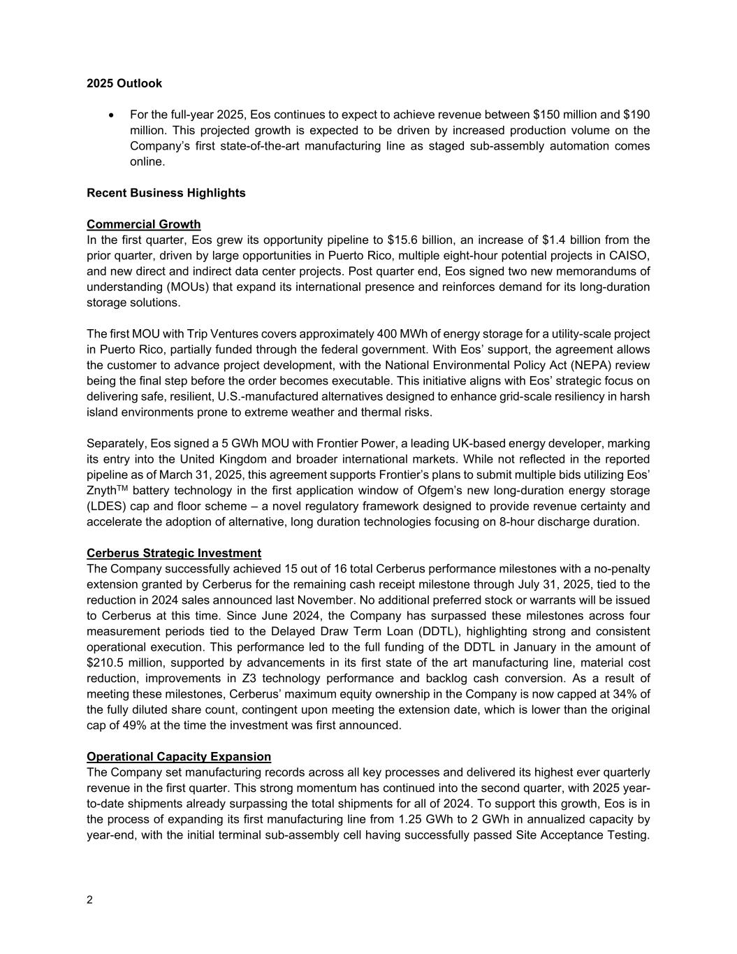 22025年展望•对于2025年全年,EOS继续预计将实现1.5亿至1.9亿美元的收入。随着分阶段组装自动化上线,预计这一预期增长将受到公司第一条最先进制造线生产量增加的推动。近期业务亮点商业增长在第一季度,EOS的机会管道增长至156亿美元,比上一季度增加了14亿美元,这得益于波多黎各的巨大机会、CAISO的多个8小时潜在项目以及新的直接和间接数据中心项目。季度末,EOS签署了两份新的谅解备忘录(MOU),扩大了其国际影响力,并加强了对其长期存储解决方案的需求。与Trip Ventures的首份谅解备忘录涵盖了波多黎各一个公用事业规模项目的约400兆瓦时储能,部分资金来自联邦政府。在EOS的支持下,该协议允许客户推进项目开发,国家环境政策法案(NEPA)审查是订单可执行之前的最后一步。这一举措符合EOS的战略重点,即提供安全、有弹性、美国制造的替代品,旨在增强易出现极端天气和热风险的恶劣岛屿环境中的电网规模弹性。另外,EOS与英国领先的能源开发商Frontier Power签署了5GWh的谅解备忘录,标志着其进入了英国和更广阔的国际市场。虽然截至2025年3月31日未反映在报告的管道中,但该协议支持Frontier计划在Ofgem新的长持续时间储能(LDES)上限和下限方案的第一个应用窗口中使用EOS的ZnythTM电池技术提交多个投标——这是一个新颖的监管框架,旨在提供收入确定性并加速采用专注于8小时放电持续时间的替代、长持续时间技术。Cerberus战略投资该公司成功实现了16个Cerberus业绩里程碑中的15个,Cerberus授予的剩余现金收款里程碑的无罚款延期至2025年7月31日,与去年11月宣布的2024年销售额减少相关。目前不会向Cerberus发行额外的优先股或认股权证。自2024年6月以来,该公司在与延迟提取定期贷款(DDTL)相关的四个衡量期间超越了这些里程碑,突出了强大和一致的运营执行。这一表现导致DDTL在1月份获得了2.105亿美元的全额资助,这得益于其第一条最先进的制造线的进步、材料成本的降低、Z3技术性能的改进和积压现金转换。由于达到了这些里程碑,Cerberus在该公司的最大股权所有权现在的上限为完全稀释后的股份数量的34%,这取决于满足延期日期,这低于首次宣布投资时49%的原始上限。运营产能扩张该公司创造了所有关键工序的制造记录,并在第一季度实现了有史以来最高的季度收入。这种强劲势头一直持续到第二季度,2025年迄今的出货量已经超过了2024年全年的总出货量。为了支持这一增长,EOS正在将其第一条生产线从1.25GWh扩大到年底前的年化产能2GWh,初步的终端分装电池已成功通过现场验收测试。