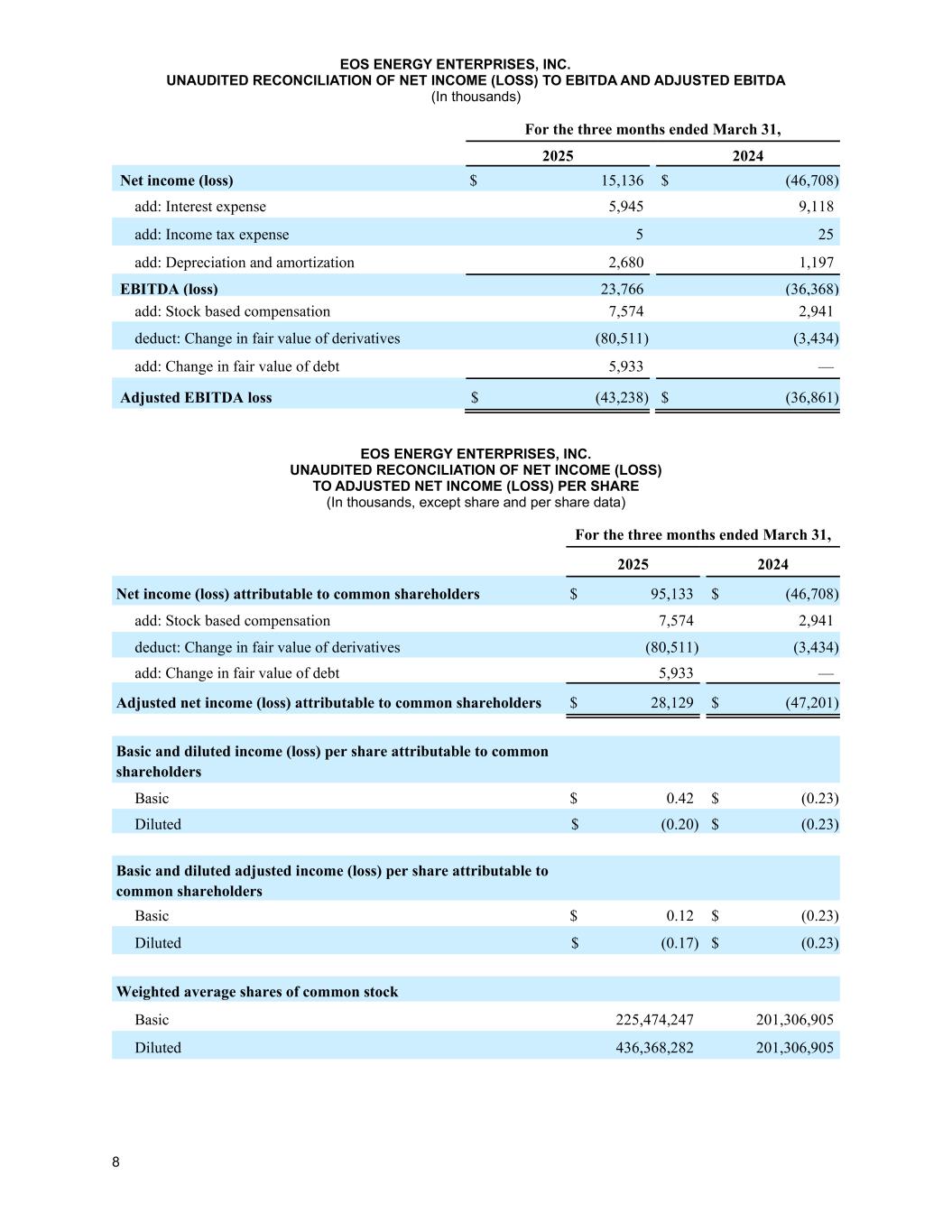 8 EOS能源企业股份有限公司截至2025年3月31日止三个月未经审计的净收入(亏损)与EBITDA和调整后EBITDA的对账(单位:千)2024年净收入(亏损)$ 15,136 $(46,708)加:利息费用5,9459,118加:所得税费用525加:折旧和摊销2,6801,197 EBITDA(亏损)23,766(36,368)加:股票补偿7,5742,941减:衍生工具公允价值变动(80,511)(3,434)加:债务公允价值变动5,933 —调整后EBITDA亏损$(43,238)$(36,861)EOS Energy Enterprises,INC。截至3月31日止三个月未经审计的净收入(亏损)与调整后每股净收入(亏损)的对账(单位:千,股份和每股数据除外),2025年2024年归属于普通股股东的净利润(亏损)95,133美元(46,708)加:股票薪酬7,5742,941减:衍生工具公允价值变动(80,511)(3,434)加:债务公允价值变动5,933 —调整后归属于普通股股东的净利润(亏损)28,129美元(47,201)归属于普通股股东的每股基本和摊薄收益(亏损)基本0.42美元(0.23)稀释后(0.20)美元(0.23)基本归属于普通股股东的稀释调整后每股收益(亏损)基本$ 0.12 $(0.23)稀释后$(0.17)$(0.23)加权平均普通股股份基本225,474,247201,306,905稀释后436,368,282201,306,905