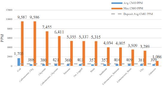 | · | 以灰分为基础,煤和伴生的碳质粘土中的物质岩性显示最大ppm浓度接近10,000ppm。确实,煤和碳质粘土的浓度最高,几乎达到了~10,000的最大ppm,平均ppm达到了~1,800。 |