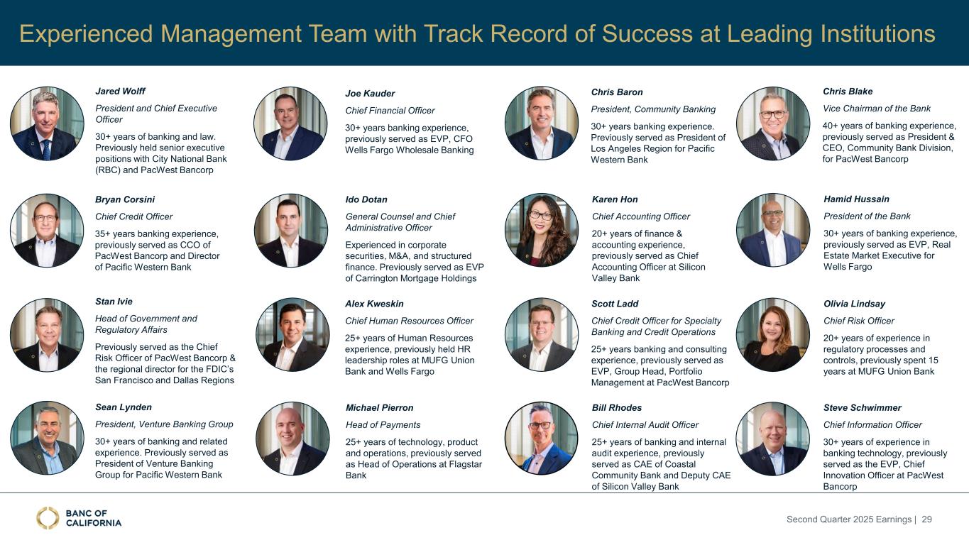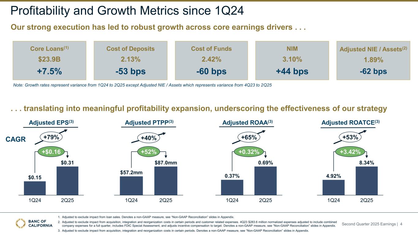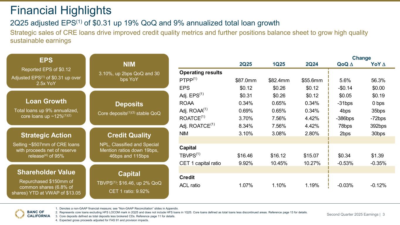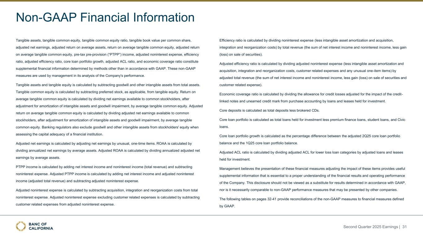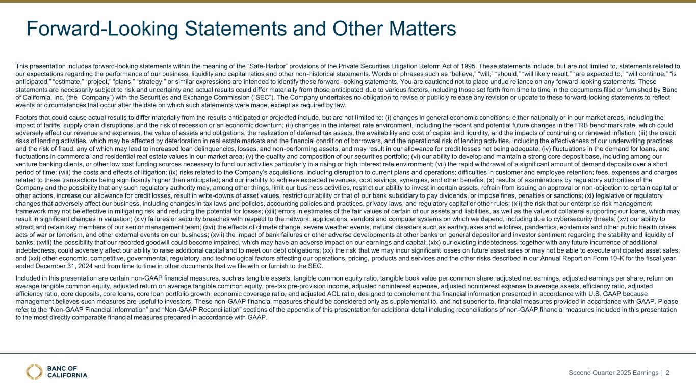 前瞻性陈述和其他事项本演示文稿包括1995年《私人证券诉讼改革法案》“安全港”条款含义内的前瞻性陈述。这些报表包括但不限于与我们对业务表现、流动性和资本比率的预期相关的报表以及其他非历史报表。诸如“相信”、“将”、“应该”、“将可能导致”、“预计”、“将继续”、“预计”、“估计”、“项目”、“计划”、“战略”或类似表述等词语或短语旨在识别这些前瞻性陈述。请注意,不要过分依赖任何前瞻性陈述。这些陈述必然受到风险和不确定性的影响,由于各种因素,包括加州银行公司(“公司”)向美国证券交易委员会(“SEC”)提交或提供的文件中不时列出的因素,实际结果可能与预期的结果存在重大差异。除法律要求外,公司不承担修改或公开发布对这些前瞻性陈述的任何修改或更新以反映作出此类陈述之日之后发生的事件或情况的义务。可能导致实际结果与预期或预测结果存在重大差异的因素包括但不限于:(i)国家或我们市场领域的总体经济状况的变化,包括关税、供应链中断以及经济衰退或经济下滑的风险的影响;(ii)利率环境的变化,包括最近和未来可能发生的FRB基准利率变化,这可能会对我们的收入和支出、资产和债务的价值、递延所得税资产的变现产生不利影响,资金和流动性的可用性和成本,以及持续或重新出现的通货膨胀的影响;(iii)贷款活动的信用风险,这可能受到房地产市场恶化和借款人财务状况的影响,以及贷款活动的操作风险,包括我们的承销做法的有效性和欺诈风险,其中任何一种都可能导致贷款拖欠、损失和不良资产增加,并可能导致我们的信贷损失准备金不足;(iv)贷款需求的波动,以及我们市场区域内商业和住宅房地产价值的波动;(v)我们的证券投资组合的质量和构成;(vi)我们开发和维持强大的核心存款基础的能力,包括在我们的风险银行客户中,或为我们的活动提供资金所必需的其他低成本资金来源,特别是在利率上升或高利率环境下;(vii)在短时间内快速提取大量活期存款;(viii)诉讼的成本和影响;(ix)与公司收购相关的风险,包括对当前计划和运营的干扰;客户和员工保留方面的困难;与这些交易相关的费用、开支和收费明显高于预期;以及我们无法实现预期的收入、成本节约、协同效应和其他收益;(x)公司监管机构的审查结果以及任何此类监管机构可能(其中包括)限制我们的业务活动、限制我们投资于某些资产的能力、不对某些资本或其他行动发出批准或不反对、增加我们的信用损失准备金、导致资产价值减记的可能性,限制我们或我们的银行子公司支付股息的能力,或施加罚款、处罚或制裁;(xi)对我们的业务产生不利影响的立法或法规变化,包括税法和政策、会计政策和惯例、隐私法以及监管资本或其他规则的变化;(xii)我们的企业风险管理框架可能无法有效降低风险和减少潜在损失的风险;(xiii)我们的某些资产和负债的公允价值以及支持我们贷款的抵押品的价值的估计错误,这可能导致估值发生重大变化;(xiv)我们所依赖的网络、应用程序、供应商和计算机系统出现故障或安全漏洞,包括由于网络安全威胁;(xv)我们吸引和留住高级管理团队关键成员的能力;(xvi)气候变化、恶劣天气事件、地震和野火等自然灾害、流行病、流行病和其他公共卫生危机、战争或恐怖主义行为的影响, 及我们业务的其他外部事件;(xvii)银行倒闭或其他银行的其他不利发展对一般存款人和投资者对银行的稳定性和流动性的情绪的影响;(xviii)我们记录的商誉可能发生减值的可能性,这可能对我们的收益和资本产生不利影响;(xix)我们现有的债务,连同任何未来产生的额外债务,可能会对我们筹集额外资金和履行债务义务的能力产生不利影响;(xx)我们可能在未来资产出售方面蒙受重大损失或可能无法执行预期资产出售的风险;(xxi)影响我们的运营、定价、产品和服务的其他经济、竞争、政府、监管和技术因素,以及我们在截至12月31日的财政年度的10-K表格年度报告中描述的其他风险,2024年以及我们不时向SEC提交或提供的其他文件。本演示文稿中包含某些非公认会计准则财务指标,例如有形资产、有形普通股权益比率、每股普通股有形账面价值、调整后净收益、调整后每股收益、平均有形普通股权益回报率、调整后平均有形普通股权益回报率、税前拨备前收入、调整后非利息费用、调整后非利息费用与平均资产、效率比率、调整后效率比率、核心存款、核心贷款、核心贷款组合增长、经济覆盖率、调整后ACL比率,旨在补充根据美国公认会计原则提供的财务信息,因为管理层认为此类措施对投资者有用。这些非GAAP财务指标应仅被视为对根据GAAP提供的财务指标的补充,而不是优于。请参阅本演示文稿附录的“非GAAP财务信息”和“非GAAP调节”部分,了解更多详细信息,包括本演示文稿中包含的非GAAP财务指标与根据GAAP编制的最直接可比财务指标的调节。2025年第二季度收益| 2
