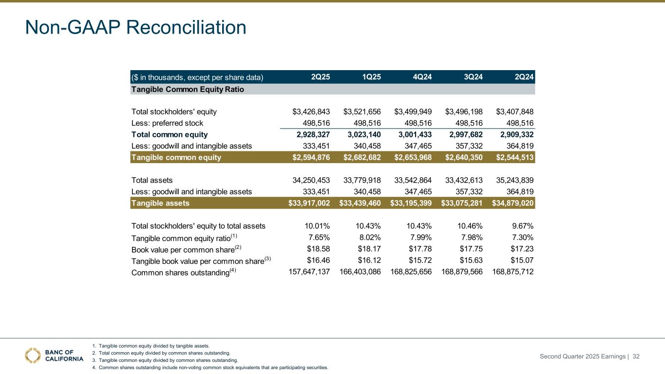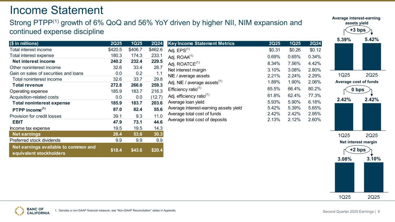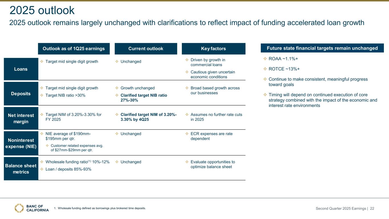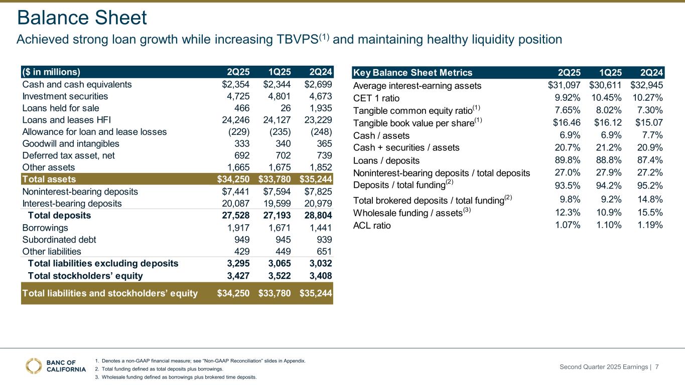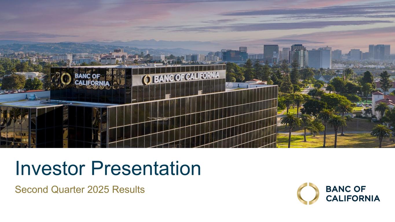 前瞻性陈述和其他事项本演示文稿包括1995年《私人证券诉讼改革法案》“安全港”条款含义内的前瞻性陈述。这些报表包括但不限于与我们对业务表现、流动性和资本比率的预期相关的报表以及其他非历史报表。诸如“相信”、“将”、“应该”、“将可能导致”、“预计”、“将继续”、“预计”、“估计”、“项目”、“计划”、“战略”或类似表述等词语或短语旨在识别这些前瞻性陈述。请注意,不要过分依赖任何前瞻性陈述。这些陈述必然受到风险和不确定性的影响,由于各种因素,包括加州银行公司(“公司”)向美国证券交易委员会(“SEC”)提交或提供的文件中不时列出的因素,实际结果可能与预期的结果存在重大差异。除法律要求外,公司不承担修改或公开发布对这些前瞻性陈述的任何修改或更新以反映作出此类陈述之日之后发生的事件或情况的义务。可能导致实际结果与预期或预测结果存在重大差异的因素包括但不限于:(i)国家或我们市场领域的总体经济状况的变化,包括关税、供应链中断以及经济衰退或经济下滑的风险的影响;(ii)利率环境的变化,包括最近和未来可能发生的FRB基准利率变化,这可能会对我们的收入和支出、资产和债务的价值、递延所得税资产的变现产生不利影响,资金和流动性的可用性和成本,以及持续或重新出现的通货膨胀的影响;(iii)贷款活动的信用风险,这可能受到房地产市场恶化和借款人财务状况的影响,以及贷款活动的操作风险,包括我们的承销做法的有效性和欺诈风险,其中任何一种都可能导致贷款拖欠、损失和不良资产增加,并可能导致我们的信贷损失准备金不足;(iv)贷款需求的波动,以及我们市场区域内商业和住宅房地产价值的波动;(v)我们的证券投资组合的质量和构成;(vi)我们开发和维持强大的核心存款基础的能力,包括在我们的风险银行客户中,或为我们的活动提供资金所必需的其他低成本资金来源,特别是在利率上升或高利率环境下;(vii)在短时间内快速提取大量活期存款;(viii)诉讼的成本和影响;(ix)与公司收购相关的风险,包括对当前计划和运营的干扰;客户和员工保留方面的困难;与这些交易相关的费用、开支和收费明显高于预期;以及我们无法实现预期的收入、成本节约、协同效应和其他收益;(x)公司监管机构的审查结果以及任何此类监管机构可能(其中包括)限制我们的业务活动、限制我们投资于某些资产的能力、不对某些资本或其他行动发出批准或不反对、增加我们的信用损失准备金、导致资产价值减记的可能性,限制我们或我们的银行子公司支付股息的能力,或施加罚款、处罚或制裁;(xi)对我们的业务产生不利影响的立法或法规变化,包括税法和政策、会计政策和惯例、隐私法以及监管资本或其他规则的变化;(xii)我们的企业风险管理框架可能无法有效降低风险和减少潜在损失的风险;(xiii)我们的某些资产和负债的公允价值以及支持我们贷款的抵押品的价值的估计错误,这可能导致估值发生重大变化;(xiv)我们所依赖的网络、应用程序、供应商和计算机系统出现故障或安全漏洞,包括由于网络安全威胁;(xv)我们吸引和留住高级管理团队关键成员的能力;(xvi)气候变化、恶劣天气事件、地震和野火等自然灾害、流行病、流行病和其他公共卫生危机、战争或恐怖主义行为的影响, 及我们业务的其他外部事件;(xvii)银行倒闭或其他银行的其他不利发展对一般存款人和投资者对银行的稳定性和流动性的情绪的影响;(xviii)我们记录的商誉可能发生减值的可能性,这可能对我们的收益和资本产生不利影响;(xix)我们现有的债务,连同任何未来产生的额外债务,可能会对我们筹集额外资金和履行债务义务的能力产生不利影响;(xx)我们可能在未来资产出售方面蒙受重大损失或可能无法执行预期资产出售的风险;(xxi)影响我们的运营、定价、产品和服务的其他经济、竞争、政府、监管和技术因素,以及我们在截至12月31日的财政年度的10-K表格年度报告中描述的其他风险,2024年以及我们不时向SEC提交或提供的其他文件。本演示文稿中包含某些非公认会计准则财务指标,例如有形资产、有形普通股权益比率、每股普通股有形账面价值、调整后净收益、调整后每股收益、平均有形普通股权益回报率、调整后平均有形普通股权益回报率、税前拨备前收入、调整后非利息费用、调整后非利息费用与平均资产、效率比率、调整后效率比率、核心存款、核心贷款、核心贷款组合增长、经济覆盖率、调整后ACL比率,旨在补充根据美国公认会计原则提供的财务信息,因为管理层认为此类措施对投资者有用。这些非GAAP财务指标应仅被视为对根据GAAP提供的财务指标的补充,而不是优于。请参阅本演示文稿附录的“非GAAP财务信息”和“非GAAP调节”部分,了解更多详细信息,包括本演示文稿中包含的非GAAP财务指标与根据GAAP编制的最直接可比财务指标的调节。2025年第二季度收益| 2