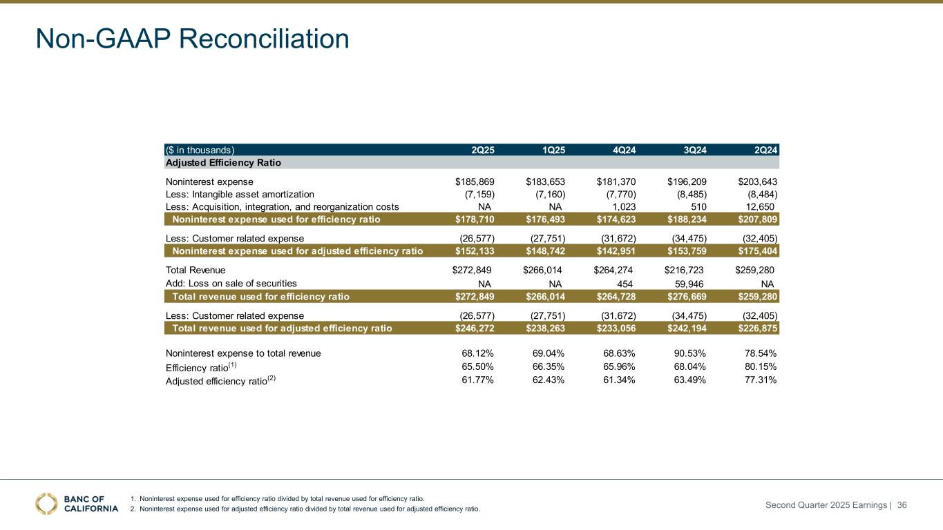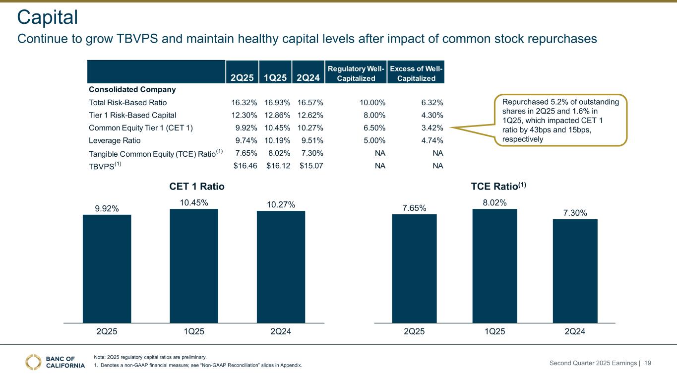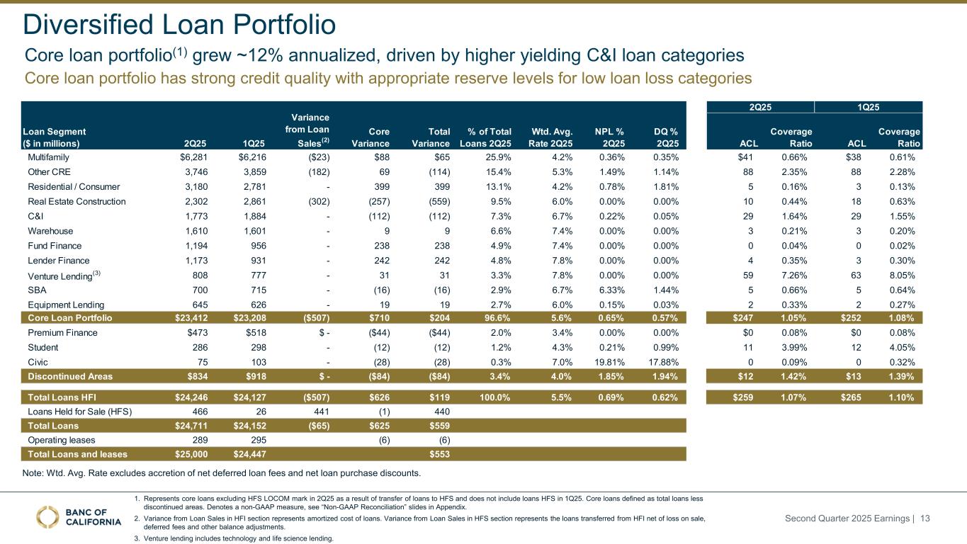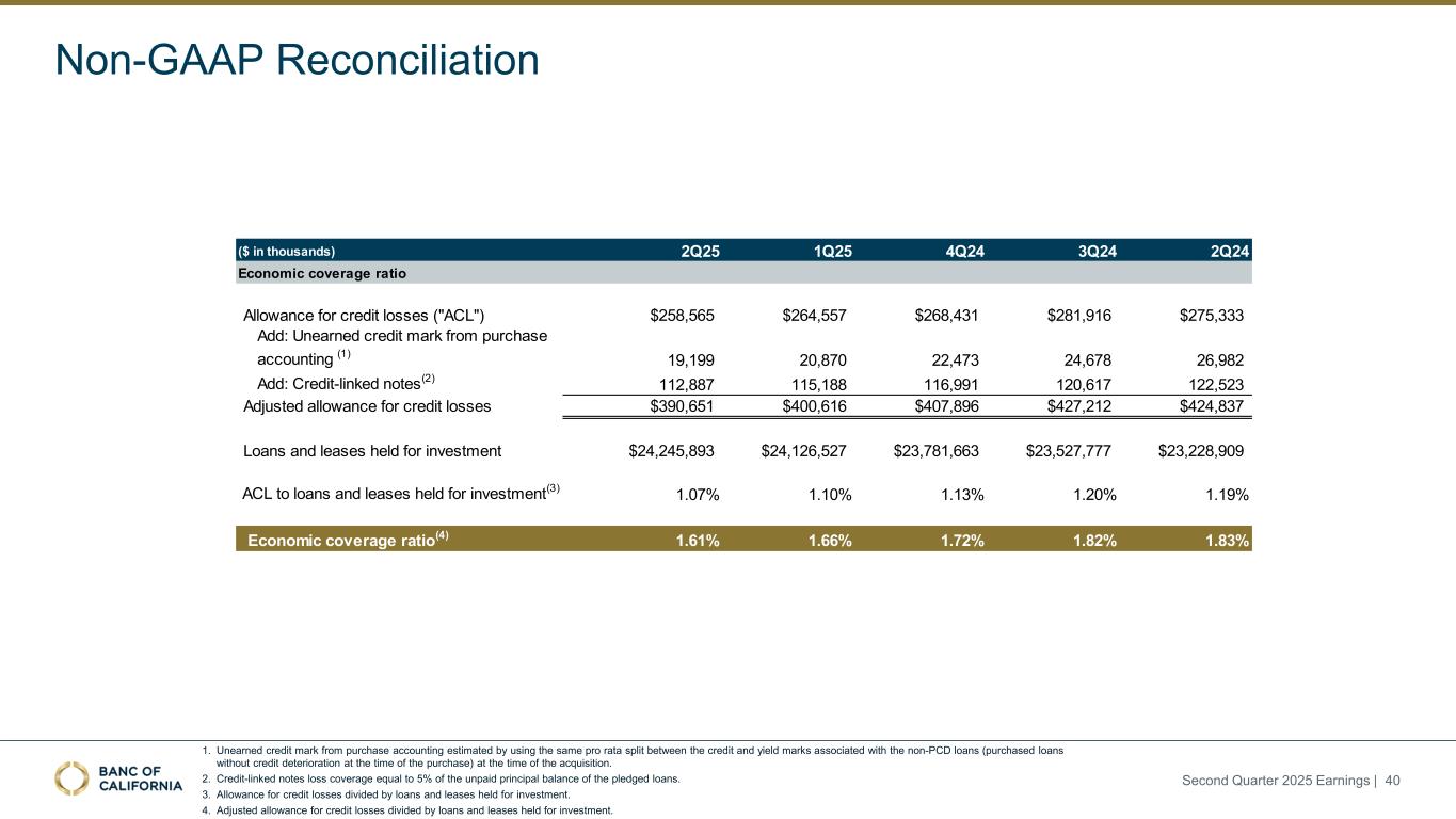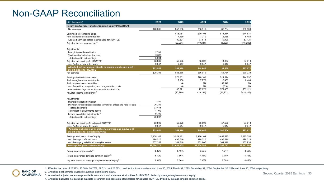 前瞻性陈述和其他事项本演示文稿包括1995年《私人证券诉讼改革法案》“安全港”条款含义内的前瞻性陈述。这些报表包括但不限于与我们对业务表现、流动性和资本比率的预期相关的报表以及其他非历史报表。诸如“相信”、“将”、“应该”、“将可能导致”、“预计”、“将继续”、“预计”、“估计”、“项目”、“计划”、“战略”或类似表述等词语或短语旨在识别这些前瞻性陈述。请注意,不要过分依赖任何前瞻性陈述。这些陈述必然受到风险和不确定性的影响,由于各种因素,包括加州银行公司(“公司”)向美国证券交易委员会(“SEC”)提交或提供的文件中不时列出的因素,实际结果可能与预期的结果存在重大差异。除法律要求外,公司不承担修改或公开发布对这些前瞻性陈述的任何修改或更新以反映作出此类陈述之日之后发生的事件或情况的义务。可能导致实际结果与预期或预测结果存在重大差异的因素包括但不限于:(i)国家或我们市场领域的总体经济状况的变化,包括关税、供应链中断以及经济衰退或经济下滑的风险的影响;(ii)利率环境的变化,包括最近和未来可能发生的FRB基准利率变化,这可能会对我们的收入和支出、资产和债务的价值、递延所得税资产的变现产生不利影响,资金和流动性的可用性和成本,以及持续或重新出现的通货膨胀的影响;(iii)贷款活动的信用风险,这可能受到房地产市场恶化和借款人财务状况的影响,以及贷款活动的操作风险,包括我们的承销做法的有效性和欺诈风险,其中任何一种都可能导致贷款拖欠、损失和不良资产增加,并可能导致我们的信贷损失准备金不足;(iv)贷款需求的波动,以及我们市场区域内商业和住宅房地产价值的波动;(v)我们的证券投资组合的质量和构成;(vi)我们开发和维持强大的核心存款基础的能力,包括在我们的风险银行客户中,或为我们的活动提供资金所必需的其他低成本资金来源,特别是在利率上升或高利率环境下;(vii)在短时间内快速提取大量活期存款;(viii)诉讼的成本和影响;(ix)与公司收购相关的风险,包括对当前计划和运营的干扰;客户和员工保留方面的困难;与这些交易相关的费用、开支和收费明显高于预期;以及我们无法实现预期的收入、成本节约、协同效应和其他收益;(x)公司监管机构的审查结果以及任何此类监管机构可能(其中包括)限制我们的业务活动、限制我们投资于某些资产的能力、不对某些资本或其他行动发出批准或不反对、增加我们的信用损失准备金、导致资产价值减记的可能性,限制我们或我们的银行子公司支付股息的能力,或施加罚款、处罚或制裁;(xi)对我们的业务产生不利影响的立法或法规变化,包括税法和政策、会计政策和惯例、隐私法以及监管资本或其他规则的变化;(xii)我们的企业风险管理框架可能无法有效降低风险和减少潜在损失的风险;(xiii)我们的某些资产和负债的公允价值以及支持我们贷款的抵押品的价值的估计错误,这可能导致估值发生重大变化;(xiv)我们所依赖的网络、应用程序、供应商和计算机系统出现故障或安全漏洞,包括由于网络安全威胁;(xv)我们吸引和留住高级管理团队关键成员的能力;(xvi)气候变化、恶劣天气事件、地震和野火等自然灾害、流行病、流行病和其他公共卫生危机、战争或恐怖主义行为的影响, 及我们业务的其他外部事件;(xvii)银行倒闭或其他银行的其他不利发展对一般存款人和投资者对银行的稳定性和流动性的情绪的影响;(xviii)我们记录的商誉可能发生减值的可能性,这可能对我们的收益和资本产生不利影响;(xix)我们现有的债务,连同任何未来产生的额外债务,可能会对我们筹集额外资金和履行债务义务的能力产生不利影响;(xx)我们可能在未来资产出售方面蒙受重大损失或可能无法执行预期资产出售的风险;(xxi)影响我们的运营、定价、产品和服务的其他经济、竞争、政府、监管和技术因素,以及我们在截至12月31日的财政年度的10-K表格年度报告中描述的其他风险,2024年以及我们不时向SEC提交或提供的其他文件。本演示文稿中包含某些非公认会计准则财务指标,例如有形资产、有形普通股权益比率、每股普通股有形账面价值、调整后净收益、调整后每股收益、平均有形普通股权益回报率、调整后平均有形普通股权益回报率、税前拨备前收入、调整后非利息费用、调整后非利息费用与平均资产、效率比率、调整后效率比率、核心存款、核心贷款、核心贷款组合增长、经济覆盖率、调整后ACL比率,旨在补充根据美国公认会计原则提供的财务信息,因为管理层认为此类措施对投资者有用。这些非GAAP财务指标应仅被视为对根据GAAP提供的财务指标的补充,而不是优于。请参阅本演示文稿附录的“非GAAP财务信息”和“非GAAP调节”部分,了解更多详细信息,包括本演示文稿中包含的非GAAP财务指标与根据GAAP编制的最直接可比财务指标的调节。2025年第二季度收益| 2
