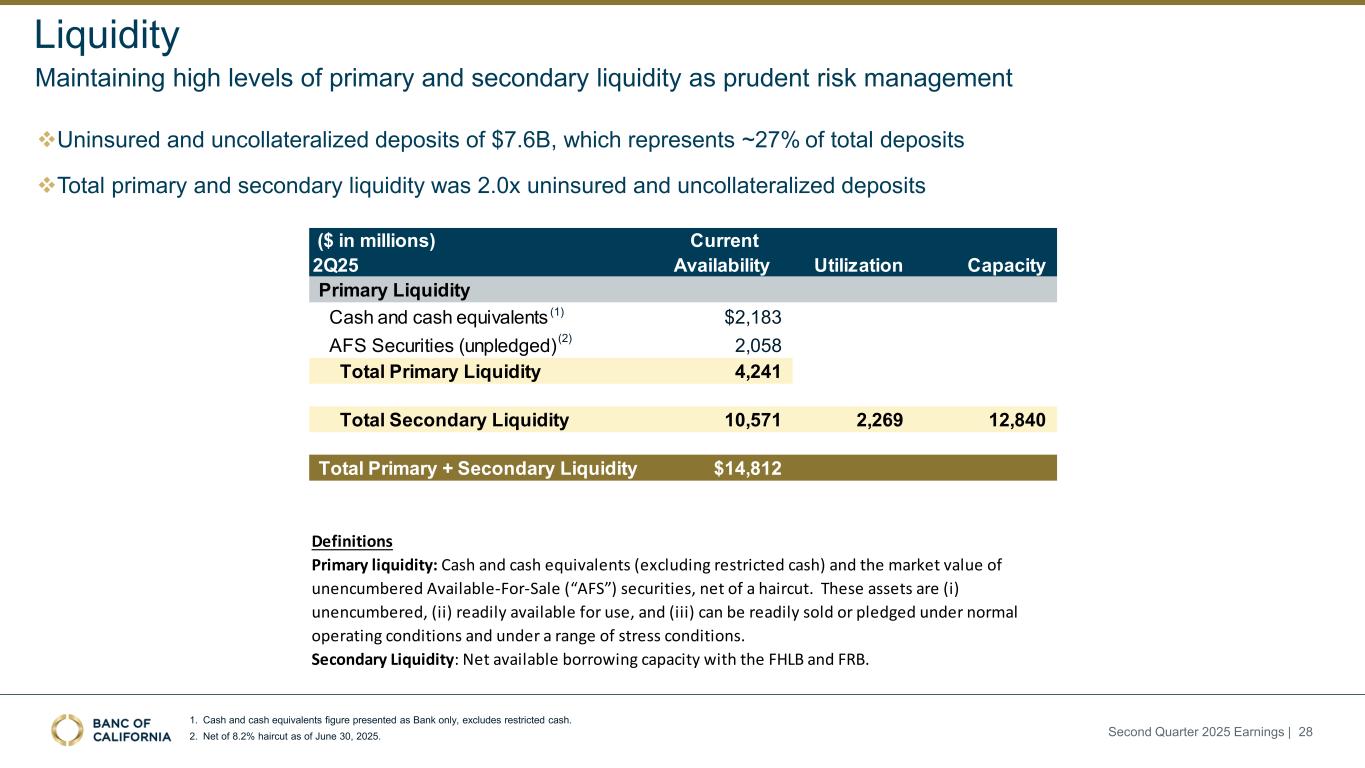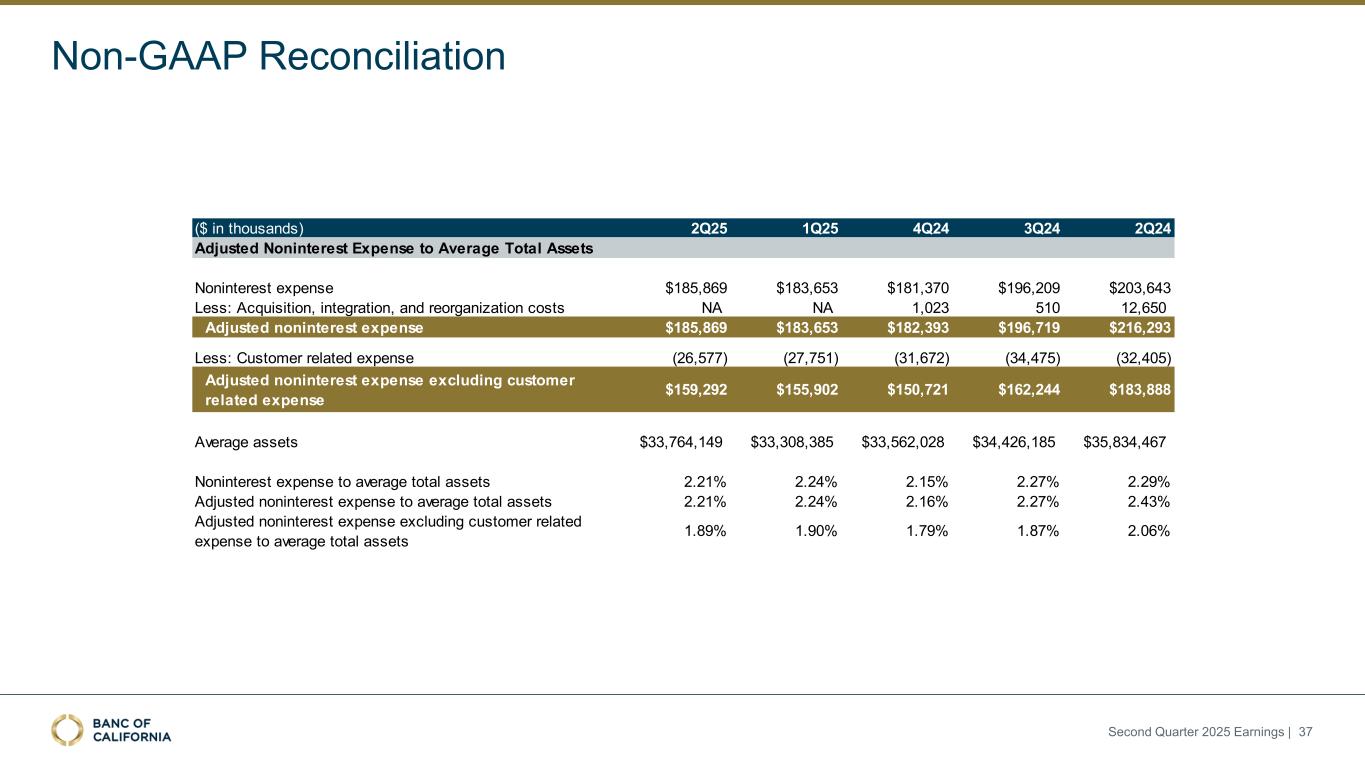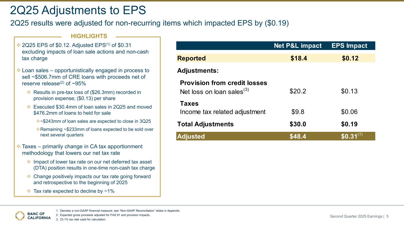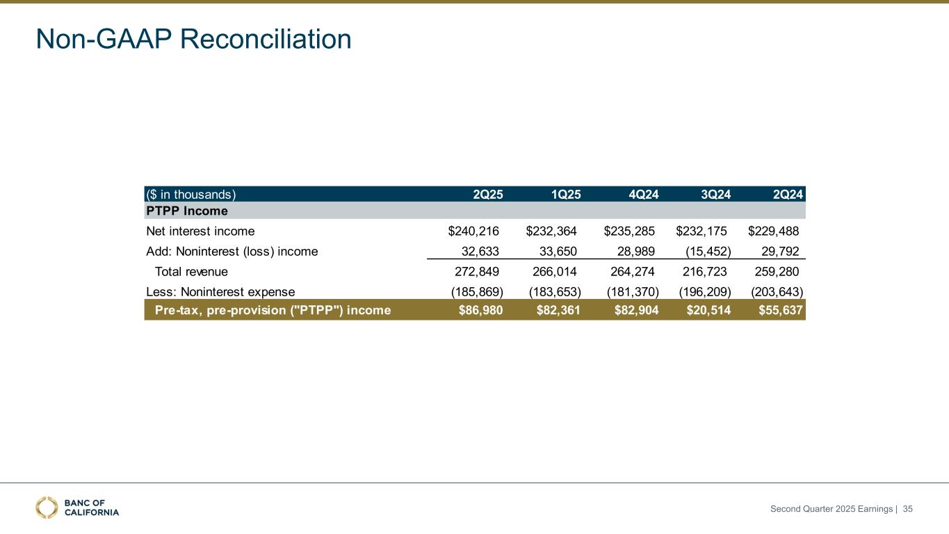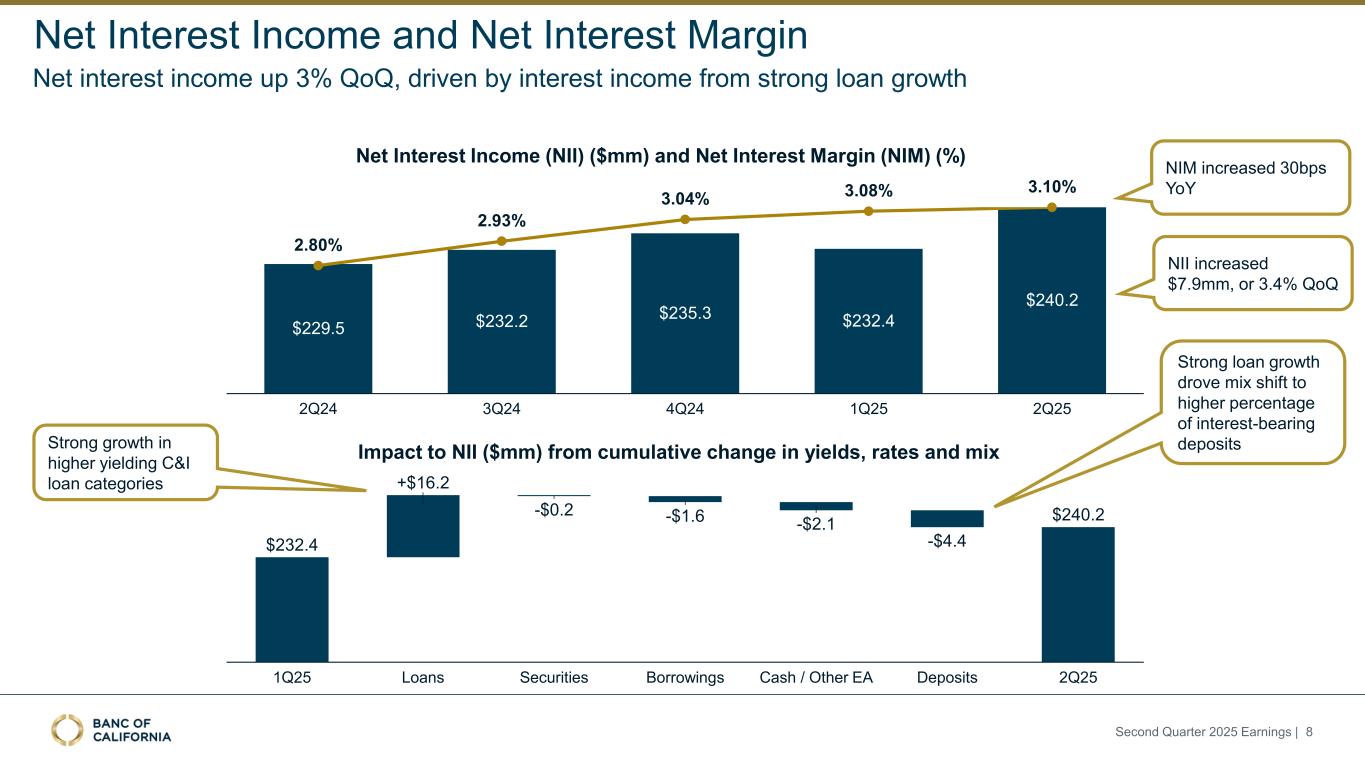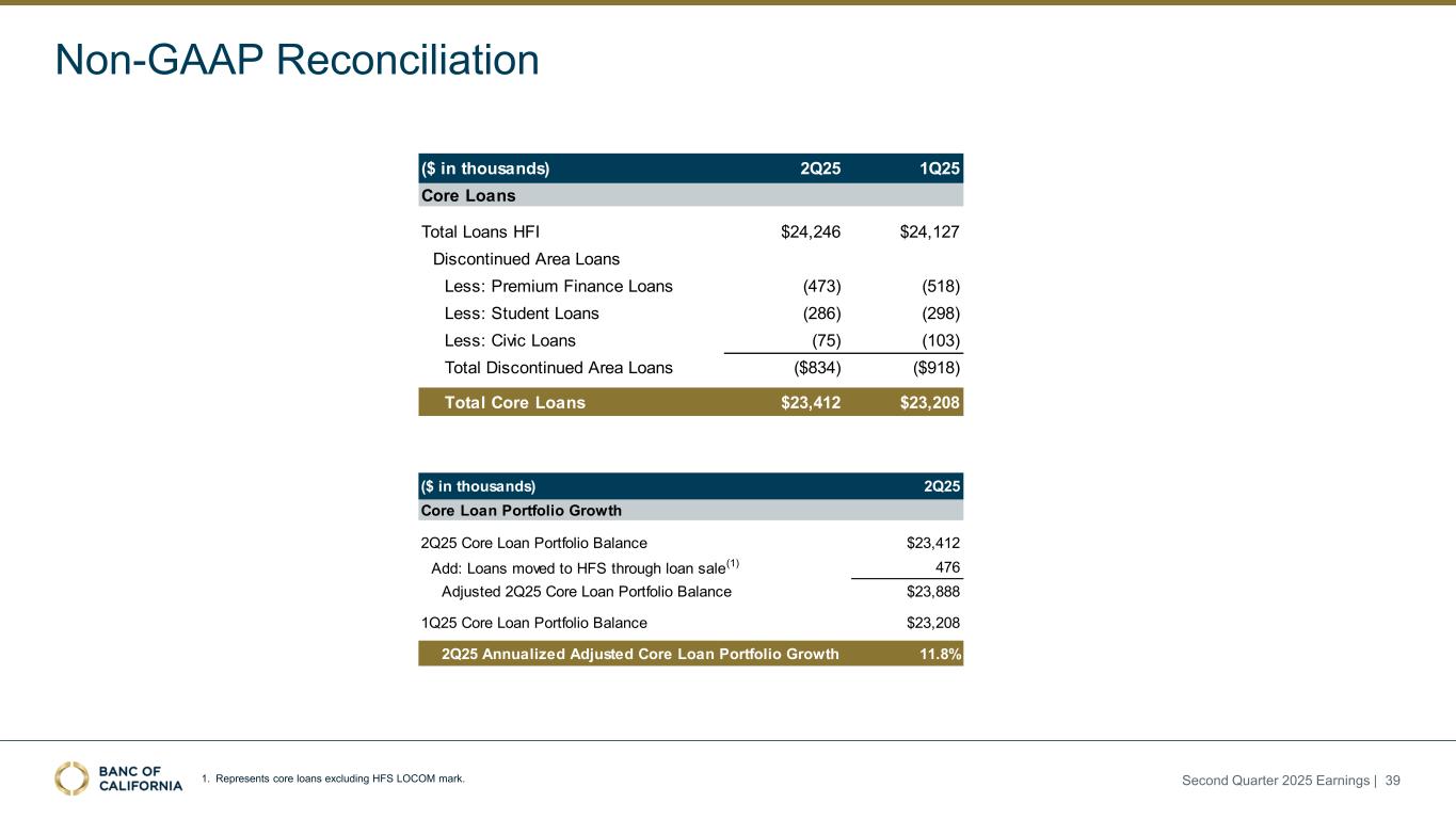 前瞻性陈述和其他事项本演示文稿包括1995年《私人证券诉讼改革法案》“安全港”条款含义内的前瞻性陈述。这些报表包括但不限于与我们对业务表现、流动性和资本比率的预期相关的报表以及其他非历史报表。诸如“相信”、“将”、“应该”、“将可能导致”、“预计”、“将继续”、“预计”、“估计”、“项目”、“计划”、“战略”或类似表述等词语或短语旨在识别这些前瞻性陈述。请注意,不要过分依赖任何前瞻性陈述。这些陈述必然受到风险和不确定性的影响,由于各种因素,包括加州银行公司(“公司”)向美国证券交易委员会(“SEC”)提交或提供的文件中不时列出的因素,实际结果可能与预期的结果存在重大差异。除法律要求外,公司不承担修改或公开发布对这些前瞻性陈述的任何修改或更新以反映作出此类陈述之日之后发生的事件或情况的义务。可能导致实际结果与预期或预测结果存在重大差异的因素包括但不限于:(i)国家或我们市场领域的总体经济状况的变化,包括关税、供应链中断以及经济衰退或经济下滑的风险的影响;(ii)利率环境的变化,包括最近和未来可能发生的FRB基准利率变化,这可能会对我们的收入和支出、资产和债务的价值、递延所得税资产的变现产生不利影响,资金和流动性的可用性和成本,以及持续或重新出现的通货膨胀的影响;(iii)贷款活动的信用风险,这可能受到房地产市场恶化和借款人财务状况的影响,以及贷款活动的操作风险,包括我们的承销做法的有效性和欺诈风险,其中任何一种都可能导致贷款拖欠、损失和不良资产增加,并可能导致我们的信贷损失准备金不足;(iv)贷款需求的波动,以及我们市场区域内商业和住宅房地产价值的波动;(v)我们的证券投资组合的质量和构成;(vi)我们开发和维持强大的核心存款基础的能力,包括在我们的风险银行客户中,或为我们的活动提供资金所必需的其他低成本资金来源,特别是在利率上升或高利率环境下;(vii)在短时间内快速提取大量活期存款;(viii)诉讼的成本和影响;(ix)与公司收购相关的风险,包括对当前计划和运营的干扰;客户和员工保留方面的困难;与这些交易相关的费用、开支和收费明显高于预期;以及我们无法实现预期的收入、成本节约、协同效应和其他收益;(x)公司监管机构的审查结果以及任何此类监管机构可能(其中包括)限制我们的业务活动、限制我们投资于某些资产的能力、不对某些资本或其他行动发出批准或不反对、增加我们的信用损失准备金、导致资产价值减记的可能性,限制我们或我们的银行子公司支付股息的能力,或施加罚款、处罚或制裁;(xi)对我们的业务产生不利影响的立法或法规变化,包括税法和政策、会计政策和惯例、隐私法以及监管资本或其他规则的变化;(xii)我们的企业风险管理框架可能无法有效降低风险和减少潜在损失的风险;(xiii)我们的某些资产和负债的公允价值以及支持我们贷款的抵押品的价值的估计错误,这可能导致估值发生重大变化;(xiv)我们所依赖的网络、应用程序、供应商和计算机系统出现故障或安全漏洞,包括由于网络安全威胁;(xv)我们吸引和留住高级管理团队关键成员的能力;(xvi)气候变化、恶劣天气事件、地震和野火等自然灾害、流行病、流行病和其他公共卫生危机、战争或恐怖主义行为的影响, 及我们业务的其他外部事件;(xvii)银行倒闭或其他银行的其他不利发展对一般存款人和投资者对银行的稳定性和流动性的情绪的影响;(xviii)我们记录的商誉可能发生减值的可能性,这可能对我们的收益和资本产生不利影响;(xix)我们现有的债务,连同任何未来产生的额外债务,可能会对我们筹集额外资金和履行债务义务的能力产生不利影响;(xx)我们可能在未来资产出售方面蒙受重大损失或可能无法执行预期资产出售的风险;(xxi)影响我们的运营、定价、产品和服务的其他经济、竞争、政府、监管和技术因素,以及我们在截至12月31日的财政年度的10-K表格年度报告中描述的其他风险,2024年以及我们不时向SEC提交或提供的其他文件。本演示文稿中包含某些非公认会计准则财务指标,例如有形资产、有形普通股权益比率、每股普通股有形账面价值、调整后净收益、调整后每股收益、平均有形普通股权益回报率、调整后平均有形普通股权益回报率、税前拨备前收入、调整后非利息费用、调整后非利息费用与平均资产、效率比率、调整后效率比率、核心存款、核心贷款、核心贷款组合增长、经济覆盖率、调整后ACL比率,旨在补充根据美国公认会计原则提供的财务信息,因为管理层认为此类措施对投资者有用。这些非GAAP财务指标应仅被视为对根据GAAP提供的财务指标的补充,而不是优于。请参阅本演示文稿附录的“非GAAP财务信息”和“非GAAP调节”部分,了解更多详细信息,包括本演示文稿中包含的非GAAP财务指标与根据GAAP编制的最直接可比财务指标的调节。2025年第二季度收益| 2