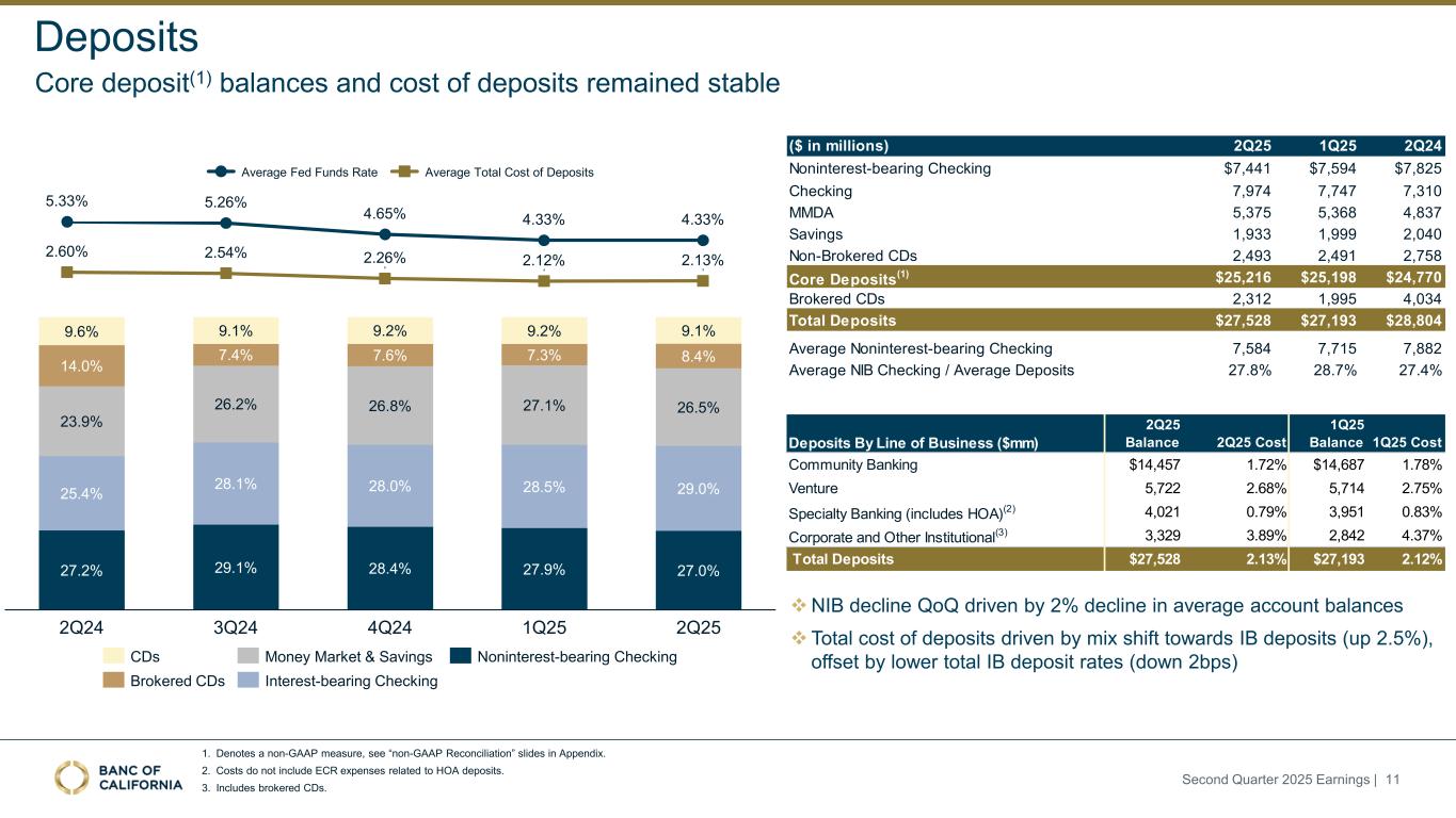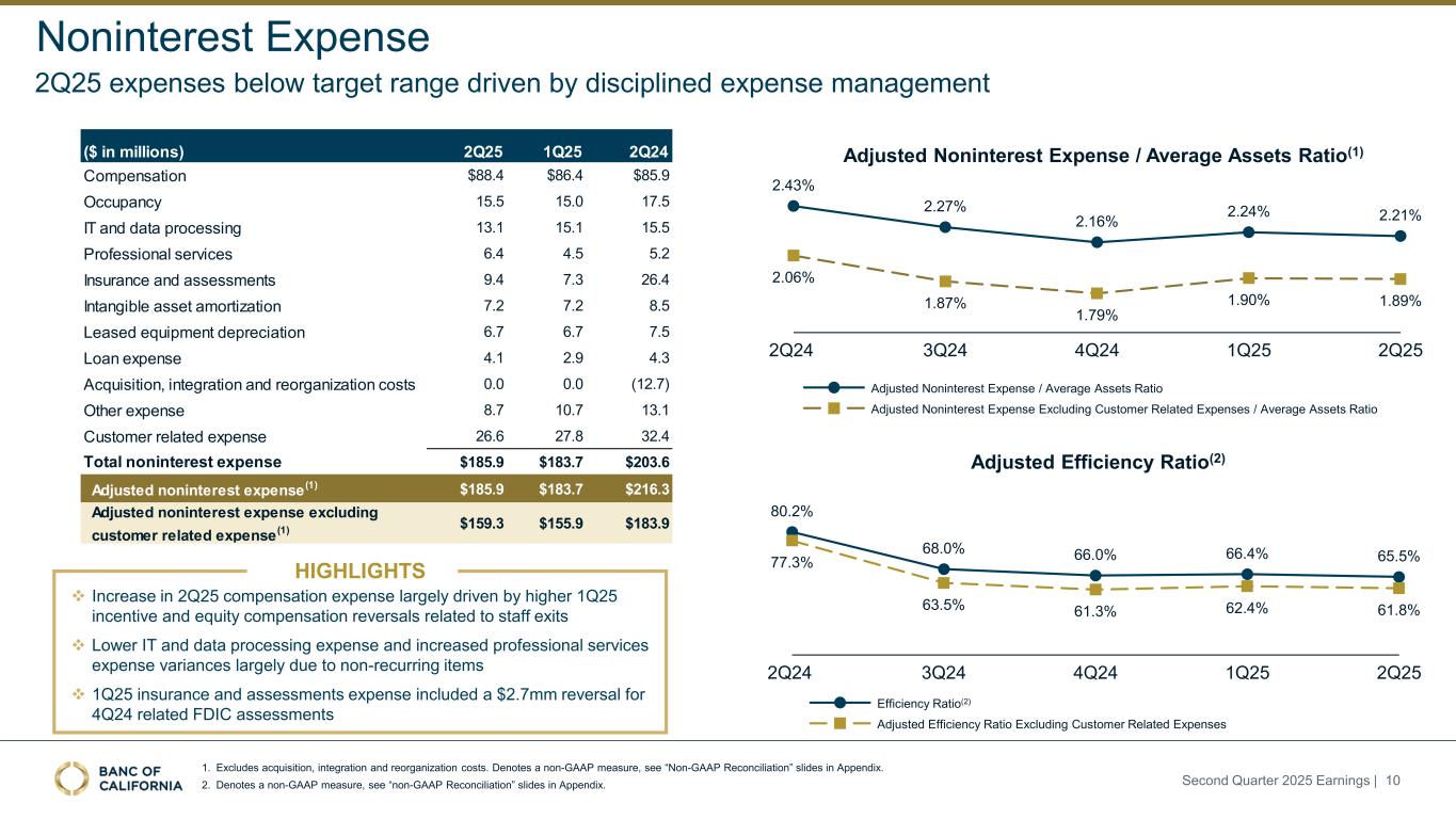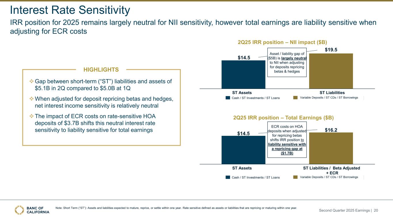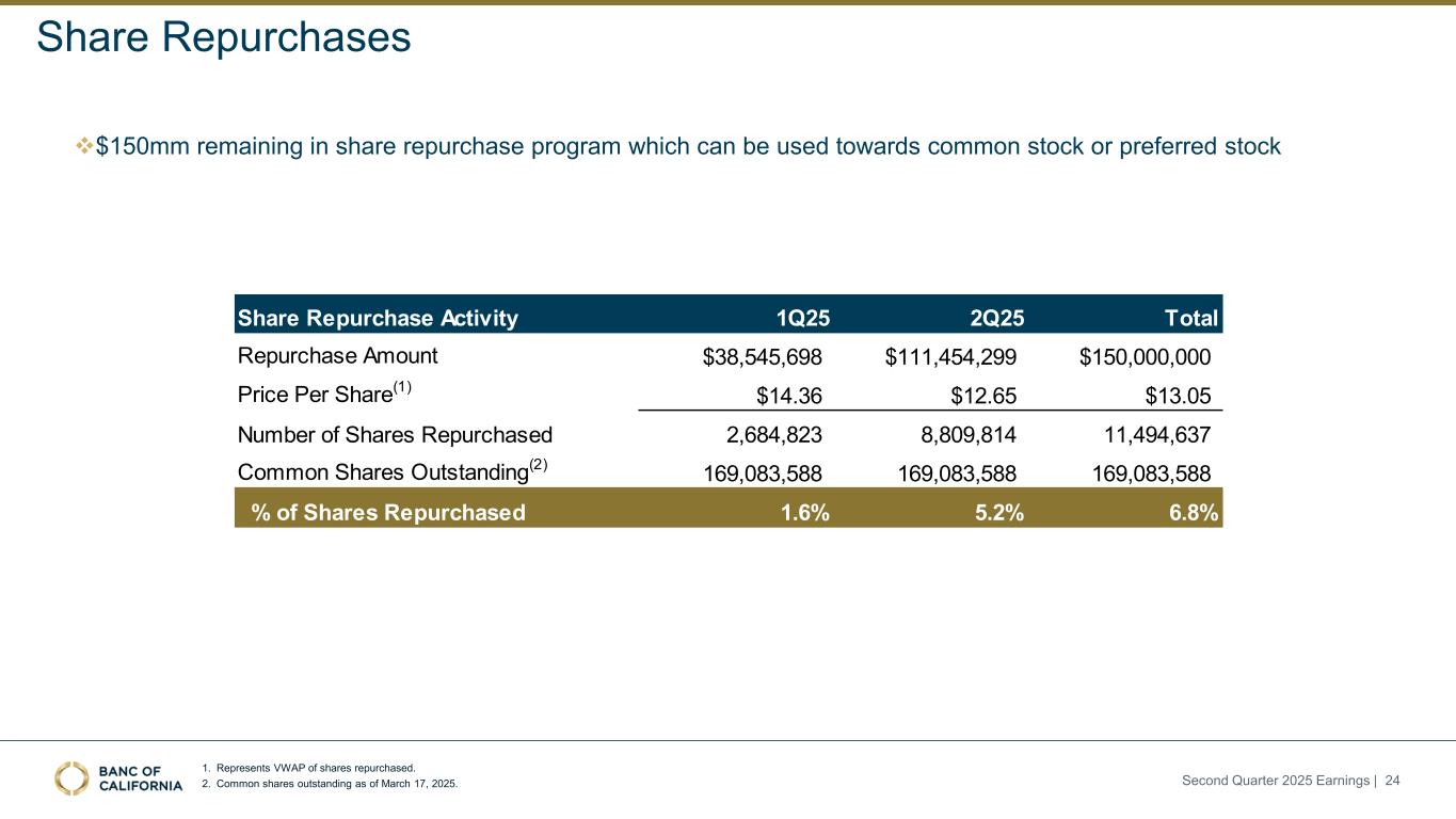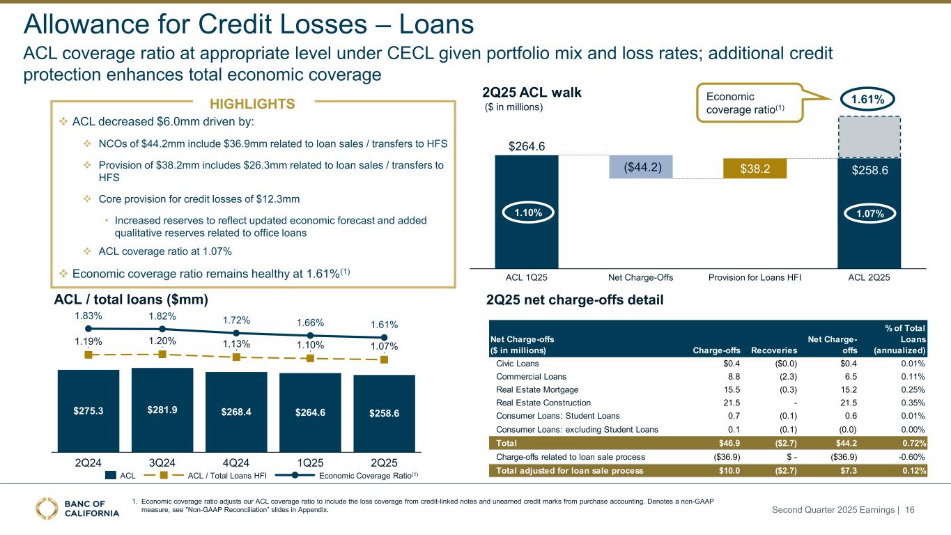 前瞻性陈述和其他事项本演示文稿包括1995年《私人证券诉讼改革法案》“安全港”条款含义内的前瞻性陈述。这些报表包括但不限于与我们对业务表现、流动性和资本比率的预期相关的报表以及其他非历史报表。诸如“相信”、“将”、“应该”、“将可能导致”、“预计”、“将继续”、“预计”、“估计”、“项目”、“计划”、“战略”或类似表述等词语或短语旨在识别这些前瞻性陈述。请注意,不要过分依赖任何前瞻性陈述。这些陈述必然受到风险和不确定性的影响,由于各种因素,包括加州银行公司(“公司”)向美国证券交易委员会(“SEC”)提交或提供的文件中不时列出的因素,实际结果可能与预期的结果存在重大差异。除法律要求外,公司不承担修改或公开发布对这些前瞻性陈述的任何修改或更新以反映作出此类陈述之日之后发生的事件或情况的义务。可能导致实际结果与预期或预测结果存在重大差异的因素包括但不限于:(i)国家或我们市场领域的总体经济状况的变化,包括关税、供应链中断以及经济衰退或经济下滑的风险的影响;(ii)利率环境的变化,包括最近和未来可能发生的FRB基准利率变化,这可能会对我们的收入和支出、资产和债务的价值、递延所得税资产的变现产生不利影响,资金和流动性的可用性和成本,以及持续或重新出现的通货膨胀的影响;(iii)贷款活动的信用风险,这可能受到房地产市场恶化和借款人财务状况的影响,以及贷款活动的操作风险,包括我们的承销做法的有效性和欺诈风险,其中任何一种都可能导致贷款拖欠、损失和不良资产增加,并可能导致我们的信贷损失准备金不足;(iv)贷款需求的波动,以及我们市场区域内商业和住宅房地产价值的波动;(v)我们的证券投资组合的质量和构成;(vi)我们开发和维持强大的核心存款基础的能力,包括在我们的风险银行客户中,或为我们的活动提供资金所必需的其他低成本资金来源,特别是在利率上升或高利率环境下;(vii)在短时间内快速提取大量活期存款;(viii)诉讼的成本和影响;(ix)与公司收购相关的风险,包括对当前计划和运营的干扰;客户和员工保留方面的困难;与这些交易相关的费用、开支和收费明显高于预期;以及我们无法实现预期的收入、成本节约、协同效应和其他收益;(x)公司监管机构的审查结果以及任何此类监管机构可能(其中包括)限制我们的业务活动、限制我们投资于某些资产的能力、不对某些资本或其他行动发出批准或不反对、增加我们的信用损失准备金、导致资产价值减记的可能性,限制我们或我们的银行子公司支付股息的能力,或施加罚款、处罚或制裁;(xi)对我们的业务产生不利影响的立法或法规变化,包括税法和政策、会计政策和惯例、隐私法以及监管资本或其他规则的变化;(xii)我们的企业风险管理框架可能无法有效降低风险和减少潜在损失的风险;(xiii)我们的某些资产和负债的公允价值以及支持我们贷款的抵押品的价值的估计错误,这可能导致估值发生重大变化;(xiv)我们所依赖的网络、应用程序、供应商和计算机系统出现故障或安全漏洞,包括由于网络安全威胁;(xv)我们吸引和留住高级管理团队关键成员的能力;(xvi)气候变化、恶劣天气事件、地震和野火等自然灾害、流行病、流行病和其他公共卫生危机、战争或恐怖主义行为的影响, 及我们业务的其他外部事件;(xvii)银行倒闭或其他银行的其他不利发展对一般存款人和投资者对银行的稳定性和流动性的情绪的影响;(xviii)我们记录的商誉可能发生减值的可能性,这可能对我们的收益和资本产生不利影响;(xix)我们现有的债务,连同任何未来产生的额外债务,可能会对我们筹集额外资金和履行债务义务的能力产生不利影响;(xx)我们可能在未来资产出售方面蒙受重大损失或可能无法执行预期资产出售的风险;(xxi)影响我们的运营、定价、产品和服务的其他经济、竞争、政府、监管和技术因素,以及我们在截至12月31日的财政年度的10-K表格年度报告中描述的其他风险,2024年以及我们不时向SEC提交或提供的其他文件。本演示文稿中包含某些非公认会计准则财务指标,例如有形资产、有形普通股权益比率、每股普通股有形账面价值、调整后净收益、调整后每股收益、平均有形普通股权益回报率、调整后平均有形普通股权益回报率、税前拨备前收入、调整后非利息费用、调整后非利息费用与平均资产、效率比率、调整后效率比率、核心存款、核心贷款、核心贷款组合增长、经济覆盖率、调整后ACL比率,旨在补充根据美国公认会计原则提供的财务信息,因为管理层认为此类措施对投资者有用。这些非GAAP财务指标应仅被视为对根据GAAP提供的财务指标的补充,而不是优于。请参阅本演示文稿附录的“非GAAP财务信息”和“非GAAP调节”部分,了解更多详细信息,包括本演示文稿中包含的非GAAP财务指标与根据GAAP编制的最直接可比财务指标的调节。2025年第二季度收益| 2