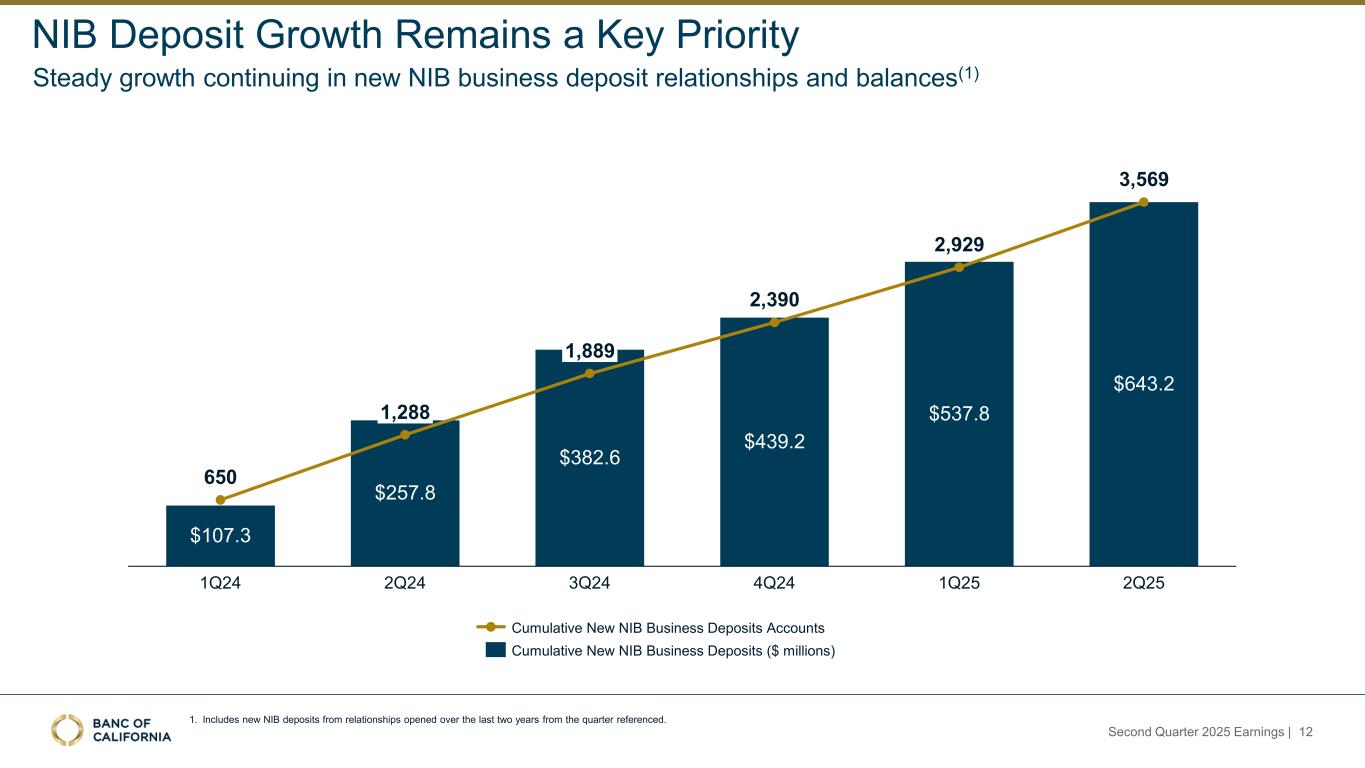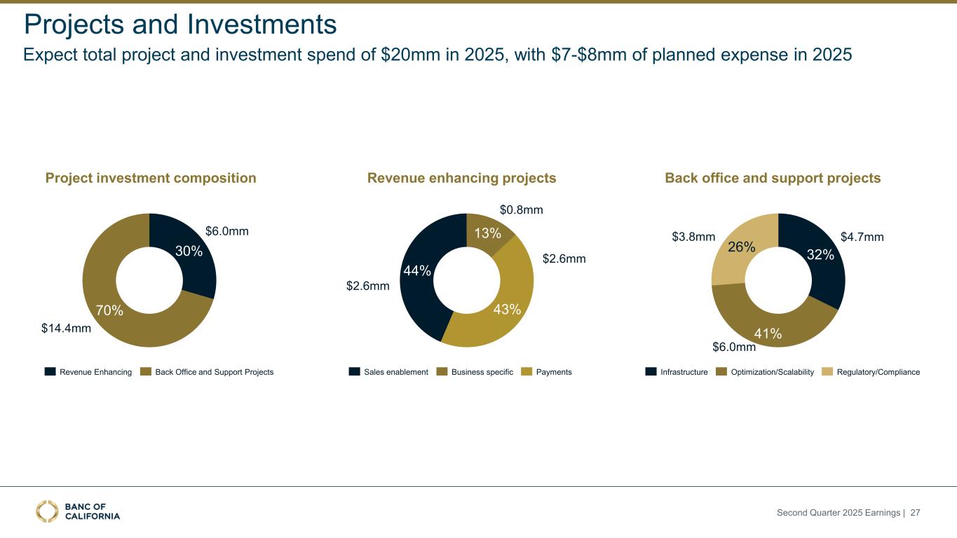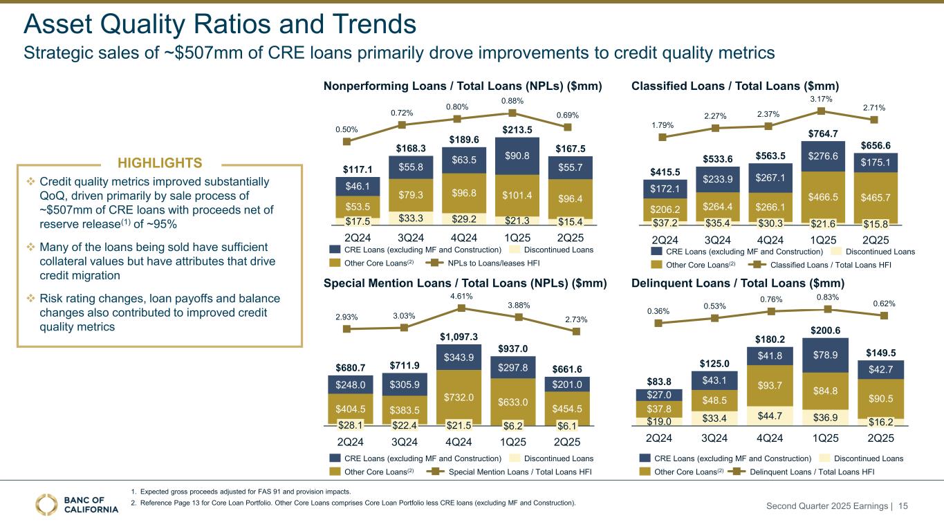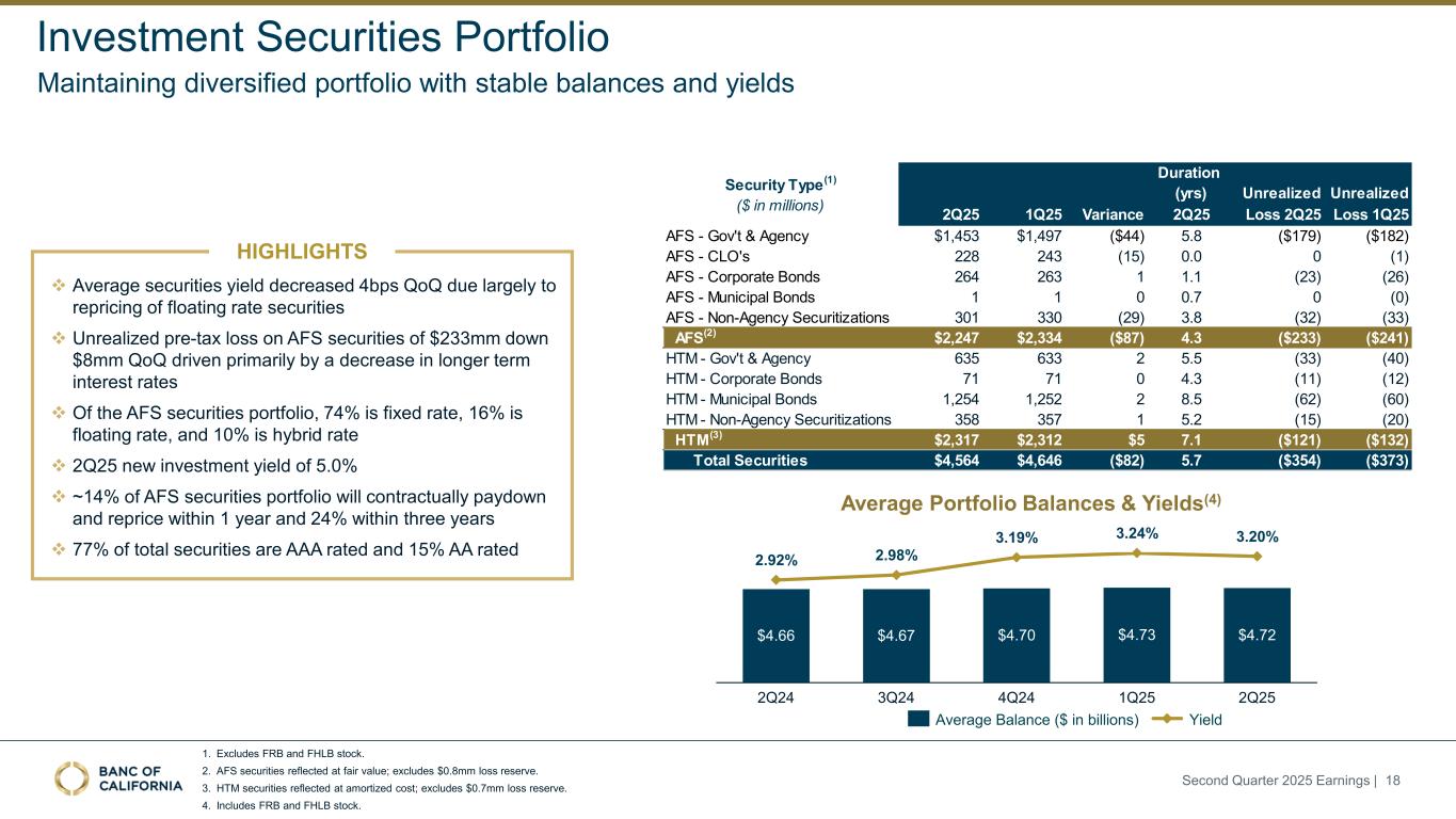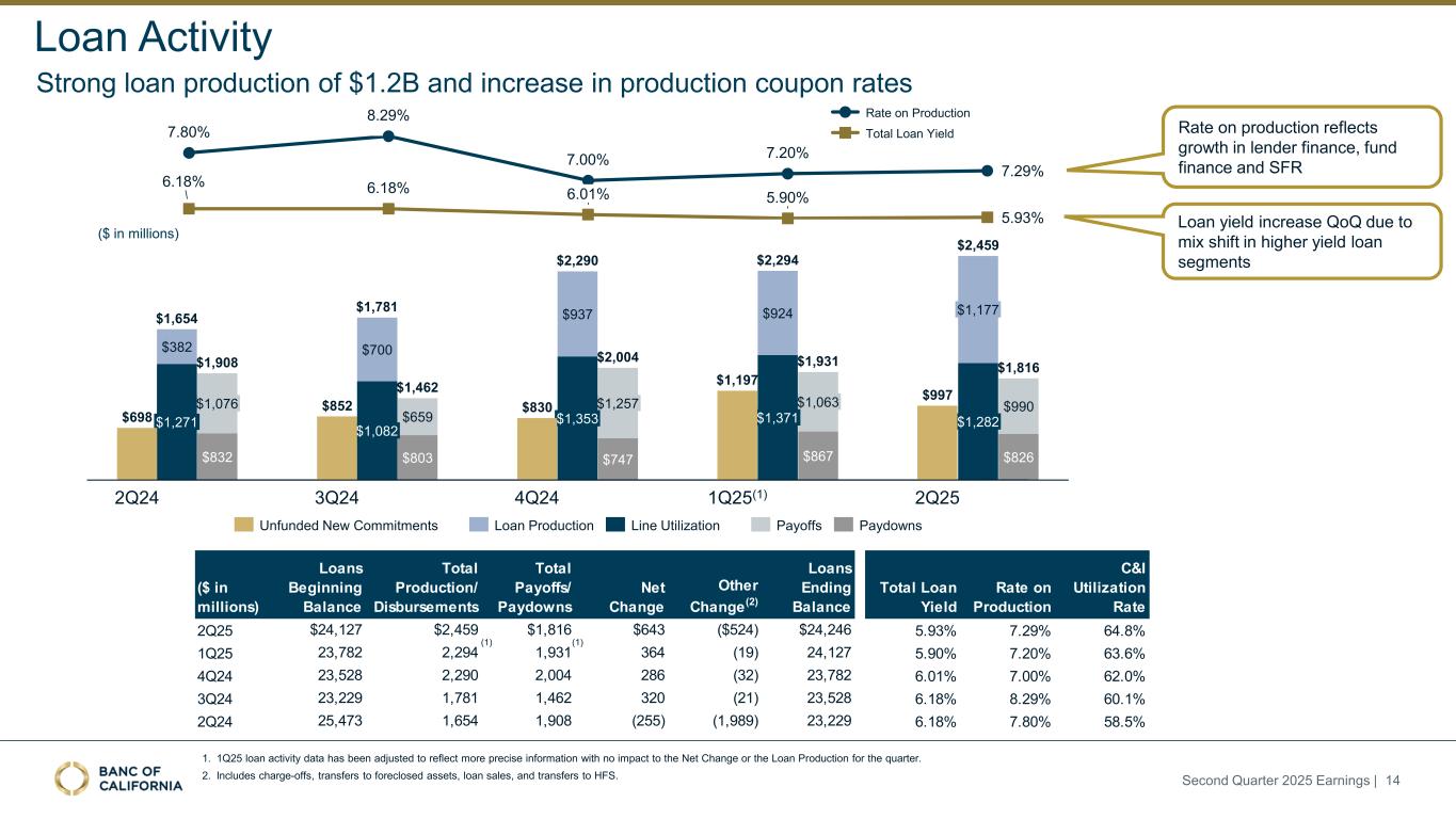 前瞻性陈述和其他事项本演示文稿包括1995年《私人证券诉讼改革法案》“安全港”条款含义内的前瞻性陈述。这些报表包括但不限于与我们对业务表现、流动性和资本比率的预期相关的报表以及其他非历史报表。诸如“相信”、“将”、“应该”、“将可能导致”、“预计”、“将继续”、“预计”、“估计”、“项目”、“计划”、“战略”或类似表述等词语或短语旨在识别这些前瞻性陈述。请注意,不要过分依赖任何前瞻性陈述。这些陈述必然受到风险和不确定性的影响,由于各种因素,包括加州银行公司(“公司”)向美国证券交易委员会(“SEC”)提交或提供的文件中不时列出的因素,实际结果可能与预期的结果存在重大差异。除法律要求外,公司不承担修改或公开发布对这些前瞻性陈述的任何修改或更新以反映作出此类陈述之日之后发生的事件或情况的义务。可能导致实际结果与预期或预测结果存在重大差异的因素包括但不限于:(i)国家或我们市场领域的总体经济状况的变化,包括关税、供应链中断以及经济衰退或经济下滑的风险的影响;(ii)利率环境的变化,包括最近和未来可能发生的FRB基准利率变化,这可能会对我们的收入和支出、资产和债务的价值、递延所得税资产的变现产生不利影响,资金和流动性的可用性和成本,以及持续或重新出现的通货膨胀的影响;(iii)贷款活动的信用风险,这可能受到房地产市场恶化和借款人财务状况的影响,以及贷款活动的操作风险,包括我们的承销做法的有效性和欺诈风险,其中任何一种都可能导致贷款拖欠、损失和不良资产增加,并可能导致我们的信贷损失准备金不足;(iv)贷款需求的波动,以及我们市场区域内商业和住宅房地产价值的波动;(v)我们的证券投资组合的质量和构成;(vi)我们开发和维持强大的核心存款基础的能力,包括在我们的风险银行客户中,或为我们的活动提供资金所必需的其他低成本资金来源,特别是在利率上升或高利率环境下;(vii)在短时间内快速提取大量活期存款;(viii)诉讼的成本和影响;(ix)与公司收购相关的风险,包括对当前计划和运营的干扰;客户和员工保留方面的困难;与这些交易相关的费用、开支和收费明显高于预期;以及我们无法实现预期的收入、成本节约、协同效应和其他收益;(x)公司监管机构的审查结果以及任何此类监管机构可能(其中包括)限制我们的业务活动、限制我们投资于某些资产的能力、不对某些资本或其他行动发出批准或不反对、增加我们的信用损失准备金、导致资产价值减记的可能性,限制我们或我们的银行子公司支付股息的能力,或施加罚款、处罚或制裁;(xi)对我们的业务产生不利影响的立法或法规变化,包括税法和政策、会计政策和惯例、隐私法以及监管资本或其他规则的变化;(xii)我们的企业风险管理框架可能无法有效降低风险和减少潜在损失的风险;(xiii)我们的某些资产和负债的公允价值以及支持我们贷款的抵押品的价值的估计错误,这可能导致估值发生重大变化;(xiv)我们所依赖的网络、应用程序、供应商和计算机系统出现故障或安全漏洞,包括由于网络安全威胁;(xv)我们吸引和留住高级管理团队关键成员的能力;(xvi)气候变化、恶劣天气事件、地震和野火等自然灾害、流行病、流行病和其他公共卫生危机、战争或恐怖主义行为的影响, 及我们业务的其他外部事件;(xvii)银行倒闭或其他银行的其他不利发展对一般存款人和投资者对银行的稳定性和流动性的情绪的影响;(xviii)我们记录的商誉可能发生减值的可能性,这可能对我们的收益和资本产生不利影响;(xix)我们现有的债务,连同任何未来产生的额外债务,可能会对我们筹集额外资金和履行债务义务的能力产生不利影响;(xx)我们可能在未来资产出售方面蒙受重大损失或可能无法执行预期资产出售的风险;(xxi)影响我们的运营、定价、产品和服务的其他经济、竞争、政府、监管和技术因素,以及我们在截至12月31日的财政年度的10-K表格年度报告中描述的其他风险,2024年以及我们不时向SEC提交或提供的其他文件。本演示文稿中包含某些非公认会计准则财务指标,例如有形资产、有形普通股权益比率、每股普通股有形账面价值、调整后净收益、调整后每股收益、平均有形普通股权益回报率、调整后平均有形普通股权益回报率、税前拨备前收入、调整后非利息费用、调整后非利息费用与平均资产、效率比率、调整后效率比率、核心存款、核心贷款、核心贷款组合增长、经济覆盖率、调整后ACL比率,旨在补充根据美国公认会计原则提供的财务信息,因为管理层认为此类措施对投资者有用。这些非GAAP财务指标应仅被视为对根据GAAP提供的财务指标的补充,而不是优于。请参阅本演示文稿附录的“非GAAP财务信息”和“非GAAP调节”部分,了解更多详细信息,包括本演示文稿中包含的非GAAP财务指标与根据GAAP编制的最直接可比财务指标的调节。2025年第二季度收益| 2