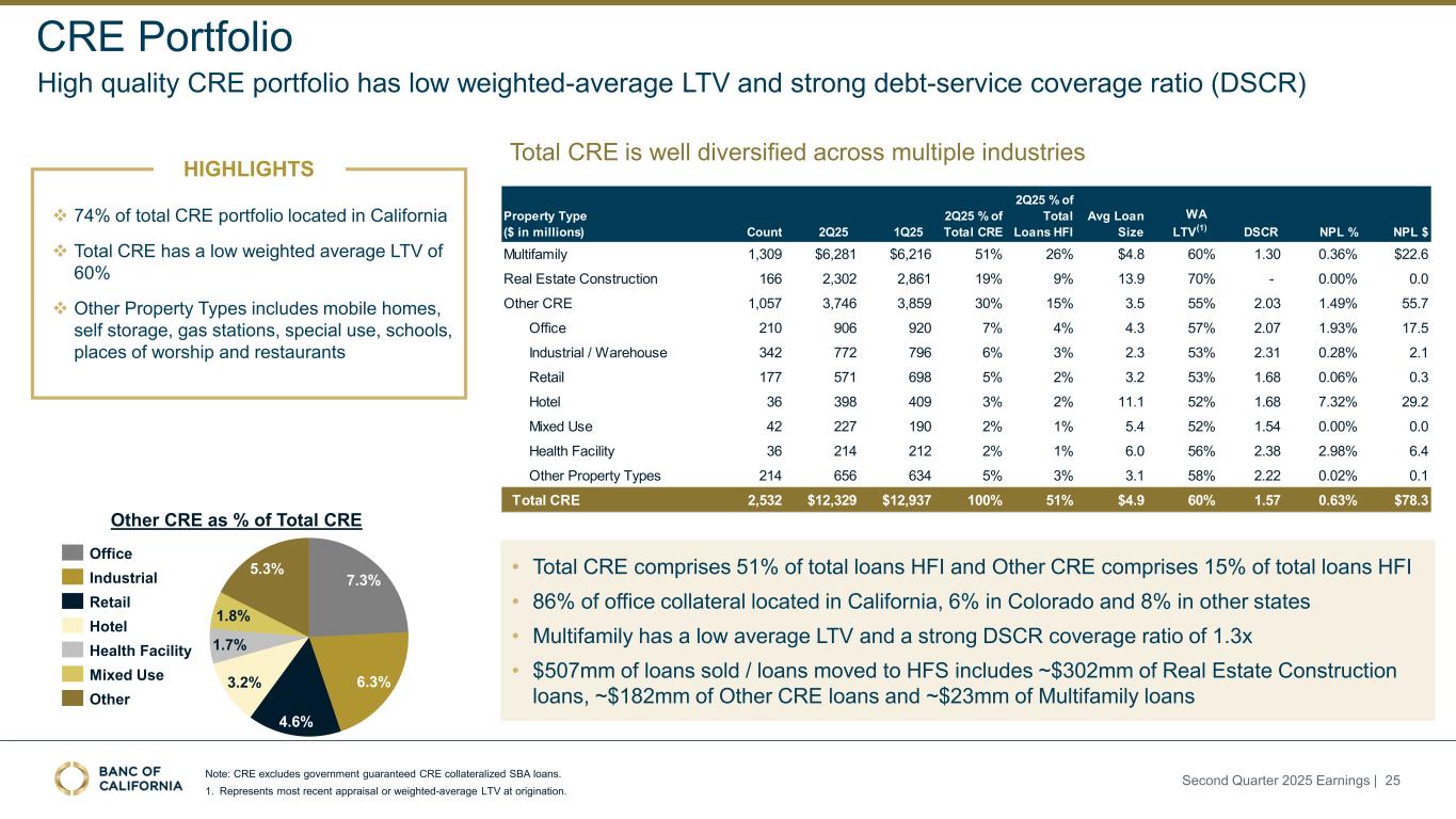 丨74%的CRE总投资组合位于加利福尼亚州丨总CRE的加权平均LTV较低,为60%丨其他物业类型包括移动房屋、自助仓储、加油站、特殊用途、学校、礼拜场所和餐馆7.3% 6.3% 4.6% 3.2% 1.7% 1.8% 5.3%办公工业零售酒店健康设施混合用途其他其他其他CRE占CRE总投资的百分比CRE总投资组合在多个行业中很好地多样化•总CRE占总贷款的51% HFI和其他CRE占总贷款的15% HFI •86%的办公室抵押品位于加利福尼亚州,科罗拉多州为6%,其他州为8% • Multifamily的平均LTV较低,DSCR覆盖率很高,为1.3倍• 507mm美元的已售贷款/转移至HFS的贷款包括~302mm的房地产建设贷款、~182mm的其他CRE贷款和~23mm的Multifamily贷款注:CRE不包括政府担保的CRE抵押SBA贷款。1.代表发起时最近的评估或加权平均LTV。CRE组合优质CRE组合加权平均LTV较低和强劲的偿债覆盖率(DSCR)突出显示2025年第二季度收益| 25物业类型(百万美元)计2Q25 1Q25 2Q25占总CRE的百分比2Q25占总贷款的百分比HFI平均贷款规模WA LTV(1)DSCR NPL % NPL $ Multifamily 1,309 $ 6,281 $ 6,21651% 26% $ 4.8 60% 1.30 0.36% $ 22.6房地产建筑1662,3022,86119% 9% 13.970%-0.00 % 0.0其他CRE 1,0573,7463,85930% 15% 3.555% 2.03 1.49% 55.7办公2109069207% 4% 4.357% 2.07 1.93% 17.5工业/仓库3427727966% 3% 2.353% 2.310.28% 2.1零售1775716985% 2% 3.253% 1.68 0.06% 0.3酒店363984093% 2% 11.152% 1.68 7.32% 29.2混合用途42271902% 1% 5.452% 1.54 00% 0.0健康设施362142122% 1% 6.056% 2.38 2.98% 6.4其他财产类型2146566345% 3% 3.158% 2.22 0.02% 0.1 CRE总额2,532 $ 12,329 $ 12,937100% 51% $ 4.9 60% 1.57 0.63% $ 78.3