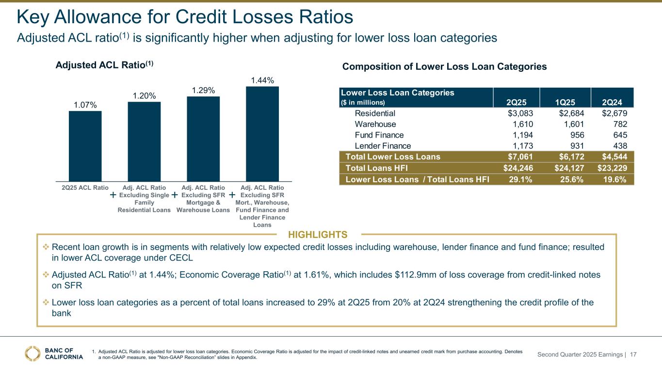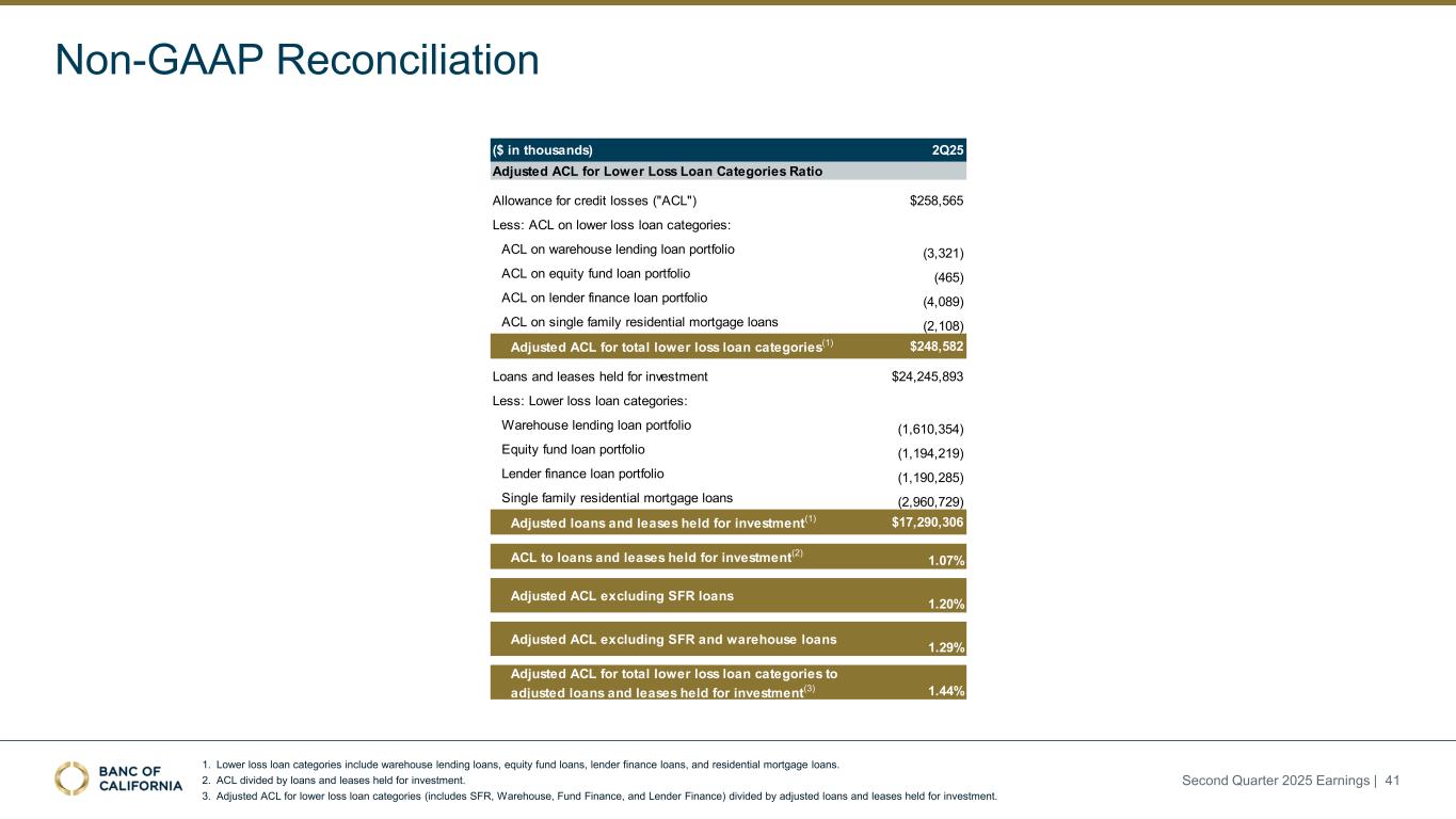非公认会计原则和解1。损失较低的贷款类别包括仓库借贷贷款、股权基金贷款、贷方融资贷款和住宅抵押贷款。2.ACL除以为投资而持有的贷款和租赁。3.较低损失贷款类别(包括SFR、仓库、Fund Finance和Lender Finance)的调整后ACL除以为投资而持有的调整后贷款和租赁。2025年第二季度收益| 41(千美元)2Q25信贷损失准备金(“ACL”)258,565美元减:较低损失贷款类别的ACL:仓库贷款贷款组合的ACL(3,321)股权基金贷款组合的ACL(465)贷方融资贷款组合的ACL(4,089)单户住宅抵押贷款组合的ACL(2,108)调整后的总较低损失贷款类别的ACL(1)248,582美元-为投资而持有的贷款和租赁24,245,893美元减:较低损失贷款类别:仓库贷款贷款组合(1,610,354)股权基金贷款组合(1,194,219)贷方融资贷款组合(1,190,285)单户住宅抵押贷款(2,960,729)调整后贷款和为投资而持有的租赁(1)17,290,306美元ACL为贷款和为投资而持有的租赁(2)1.07%调整后ACL不包括SFR贷款1.20%调整后ACL不包括SFR和仓库贷款1.29%调整后ACL为总较低损失贷款类别调整后ACL为调整后的贷款和为投资而持有的租赁(3)1.44%调整后ACL为较低损失贷款类别比率
