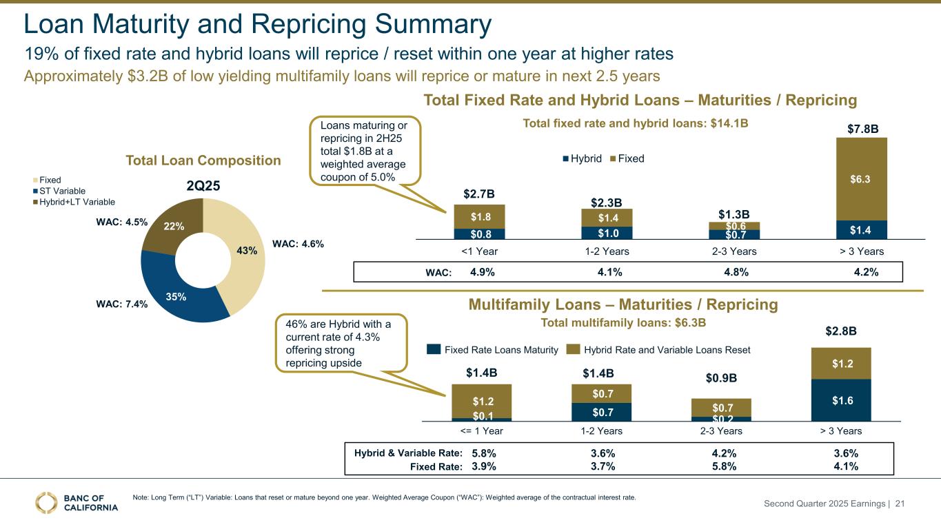 2025年第二季度收益| 21贷款到期和重新定价摘要3.6% 3.7% 4.2% 5.8% 3.6% 4.1% 5.8% 3.9%多户贷款–到期/重新定价$ 0.1 $ 0.7 $ 0.2 $ 1.6 $ 1.2 $ 0.7 $ 0.7 $ 1.2 < = 1年1-2年2-3年> 3年$ 1.4B $ 1.4B $ 0.9B $ 2.8B固定利率贷款到期混合利率和可变贷款重置混合&可变利率:固定利率:总固定利率和混合贷款–到期/重新定价$ 0.8 $ 1.0 $ 0.7 $ 1.4 $ 1.8 $ 1.4 $ 0.6 $ 6.3 < 1年1-2年2-3年> 3年混合固定$ 2.7B $ 2.3B $ 1.3B $ 7.8B 19%的固定利率和混合贷款将在一年内以更高的利率重新定价/重置固定利率和混合贷款总额:$ 14.1B多户家庭贷款总额:$ 6.3B 43% 35% 22% 2Q25固定ST可变混合+ LT可变总贷款构成WAC:4.6% WAC:7.4% WAC:4.5% 46%为混合,当前利率为4.3%,提供强劲的重新定价上行空间4.1% 4.8% 4.2% 4.9% WAC:注:长期(“LT”)变量:贷款重置或成熟超过一年的。加权平均息票(“WAC”):合同利率的加权平均数。2H25到期或重新定价的贷款总额为$ 1.8B,加权平均票息为5.0%,大约$ 3.2B的低收益多户家庭贷款将在未来2.5年重新定价或到期