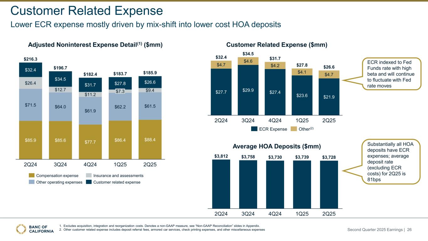 调整后非利息费用详情(1)($ mm)$ 32.4 $ 26.4 $ 71.5 $ 85.9 2Q24 $ 34.5 $ 12.7 $ 64.0 $ 85.6 3Q24 $ 31.7 $ 11.2 $ 61.9 $ 77.7 4Q24 $ 27.8 $ 7.3 $ 62.2 $ 86.4 1Q25 $ 26.6 $ 9.4 $ 61.5 $ 88.4 2Q25 $ 216.3 $ 196.7 $ 182.4 $ 183.7 $ 185.9补偿费用其他运营费用保险和评估客户相关费用客户相关费用($ mm)$ 27.7 $ 4.7 2Q24 $ 29.9 $ 4.6 3Q24 $ 27.4 $ 4.24Q24 $ 23.6 $ 4.1 1Q25 $ 21.9 $ 4.7 2Q25 $ 32.4 $ 34.5 $ 31.7 $ 27.8 $ 26.6 ECR费用其他(2)1。不包括收购、整合和重组成本。表示非GAAP衡量标准,见附录“非GAAP调节”幻灯片。2.其他与客户相关的费用包括存款介绍费、装甲车服务、支票打印费用和其他杂项费用客户相关费用较低的ECR费用主要是由于混合转移到成本较低的HOA存款2Q24 3Q24 4Q24 1Q25 2Q25 $ 3,812 $ 3,758 $ 3,730 $ 3,739 $ 3,728平均HOA存款($ mm)ECR与联邦基金利率挂钩,具有高贝塔系数,并将继续随着联邦利率变动而波动基本上所有HOA存款都有ECR费用;2Q25的平均存款利率(不包括ECR成本)为81bps 2025年第二季度收益| 26