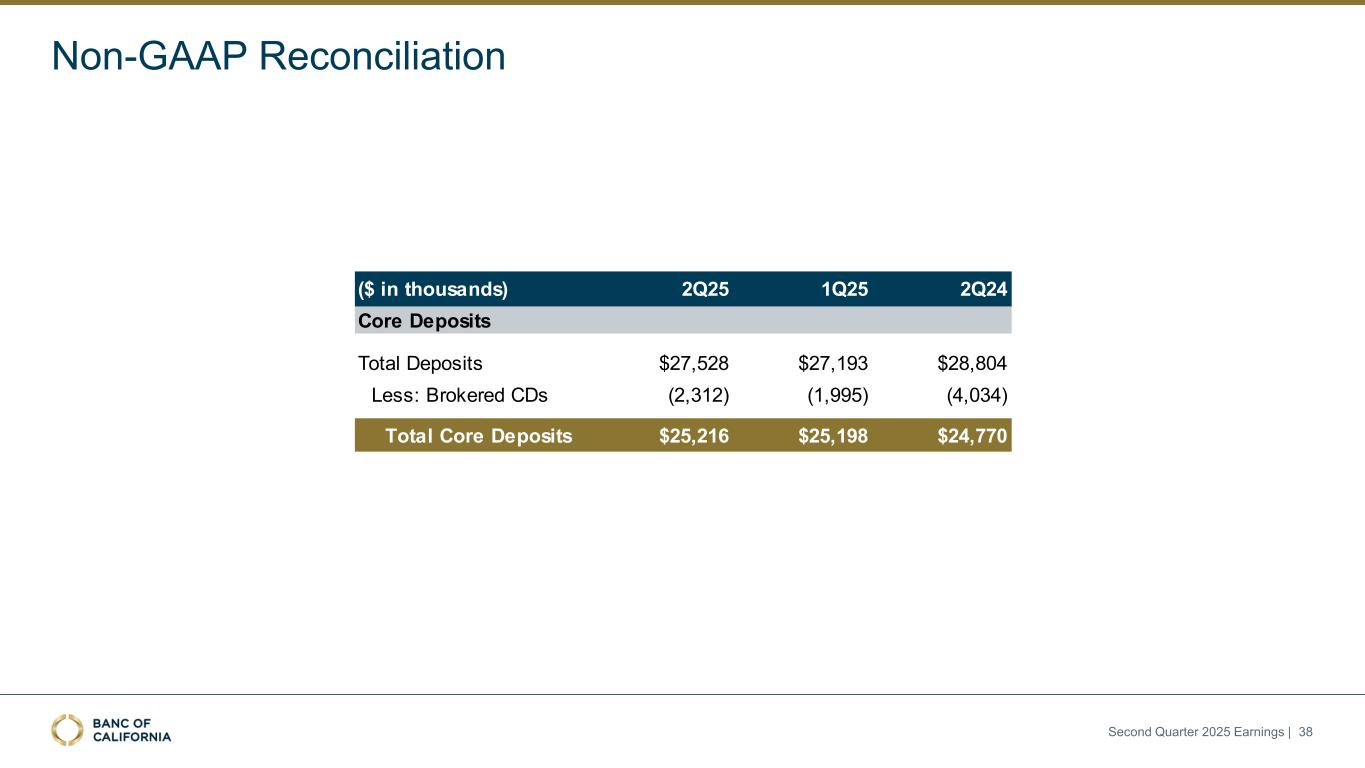 非GAAP调节2025年第二季度收益| 38(千美元)2Q25 1Q25 2Q24总存款$ 27,528 $ 27,193 $ 28,804减:经纪CD(2,312)(1,995)(4,034)总核心存款$ 25,216 $ 25,198 $ 24,770核心存款