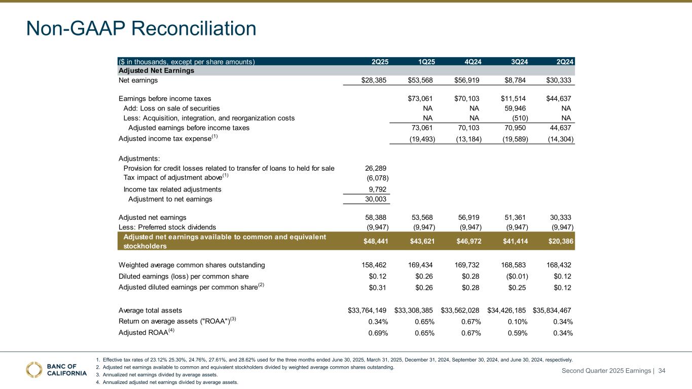 1.截至2025年6月30日、2025年3月31日、2024年12月31日、2024年9月30日、2024年6月30日止三个月的实际税率分别为23.12% 25.30%、24.76%、27.61%、28.62%。2.普通股和同等股东可获得的调整后净收益除以加权平均已发行普通股。3.年化净利润除以平均资产。4.年化调整后净收益除以平均资产。非GAAP调节2025年第二季度收益| 34(以千美元计,每股金额除外)2Q25 1Q25 4Q24 3Q24 2Q24净收益28,385美元53,568美元56,919美元8,784美元30,333美元所得税前利润73,061美元70,103美元11,514美元44,637美元加:证券销售损失NA NA 59,946 NA减:收购、整合,和重组成本NA NA(510)NA调整后的所得税前利润73,06170,10370,95044,637调整后的所得税费用(1)(19,493)(13,184)(19,589)(14,304)调整:与将贷款转移至持作出售相关的信用损失拨备26,289上述调整的税务影响(1)(6,078)所得税相关调整9,792调整净收益30,003调整后净收益58,38853,56856,91951,36130,333减:优先股股息(9,947)(9,947)(9,947)(9,947)调整后的净收益及等值股东48,441美元43,621美元46,972美元41,414美元20,386美元加权平均已发行普通股158,462169,434169,732168,583168,432美元稀释后每股收益(亏损)0.12美元0.26美元0.28美元(0.01美元)0.12美元调整后稀释后每股普通股收益(2)0.31美元0.26美元0.28美元0.25美元0.12美元平均总资产33,764,149美元33,308,385美元33,562,028美元34,426,185美元35,834,467美元平均资产回报率(“ROAA”)(3)0.34% 0.65% 0.67% 0.10% 0.34%调整后ROAA(4)0.69% 0.65% 0.67% 0.59% 0.34%调整后净收益