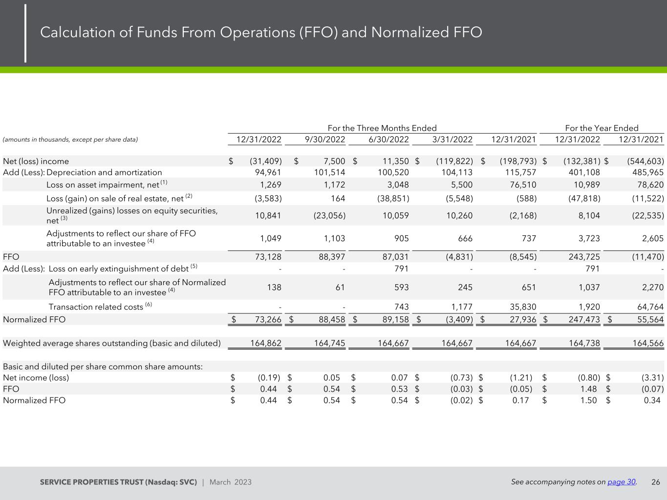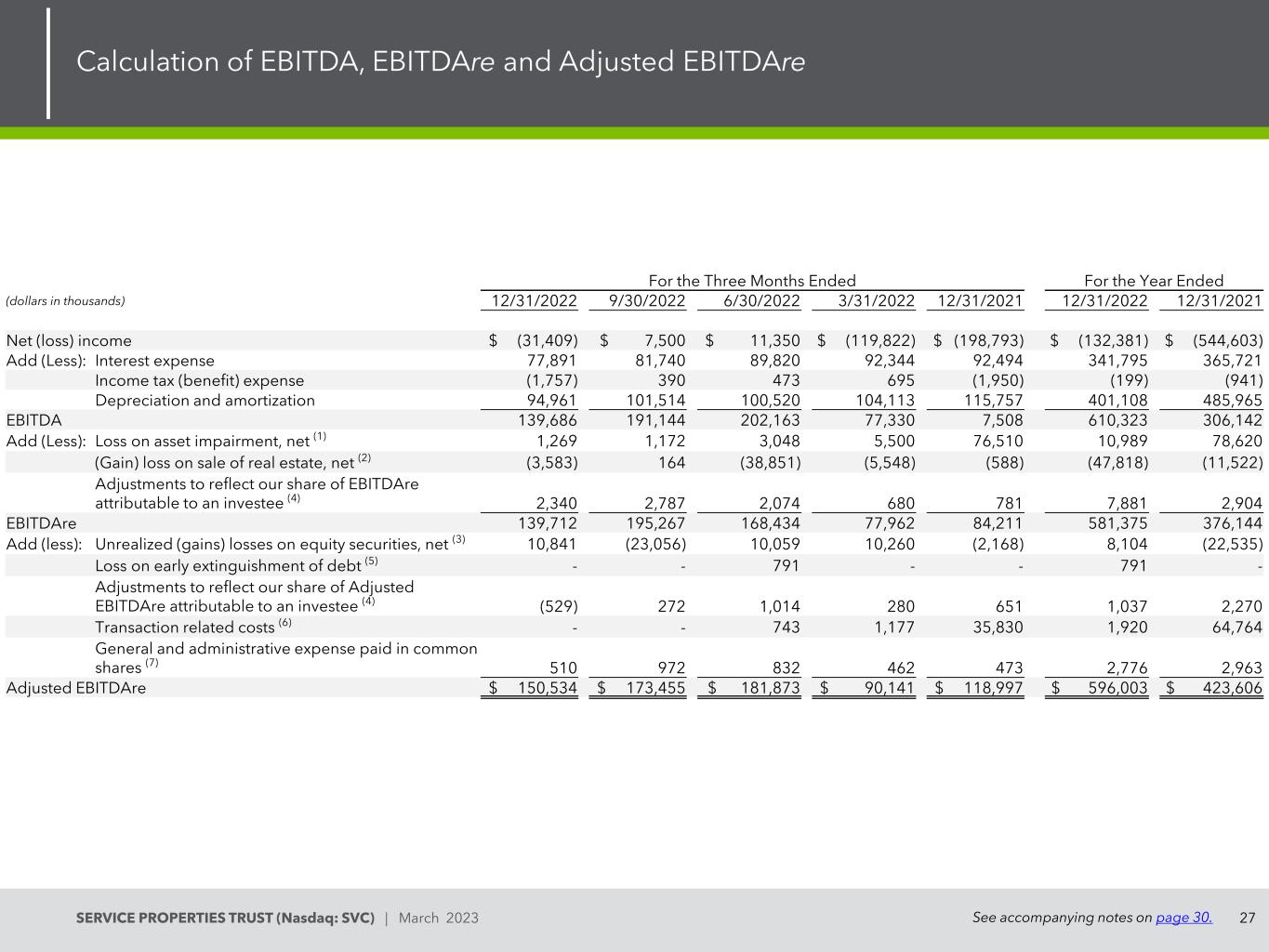 26SERVICE PROPERTIES TRUST(Nasdaq:SVC)| 2023年3月运营资金的计算(FFO)和标准化FFO见第30页的附注。截至本年度止三个月(以千为单位,每股数据除外)12/31/20229/30/20226/30/20223/31/202212/31/202112/31/202212/31/2021净(亏损)收入$(31,409)$ 7,500 $ 11,350 $(119,822)$(198,793)$(132,381)$(544,603)加(减):折旧和摊销94,961101,514100,520104,113115,757401,108485,965资产减值损失净额(1)1,2691,1723,0485,50076,51010,98978,620房地产销售损失(收益)净额(2)(3,583)164(38,851)(5,净额(3)10,841(23,056)10,05910,260(2,168)8,104(22,535)调整以反映我们应占被投资方FFO份额(4)1,0491,1039056667373,7232,605 FFO 73,12888,39787,031(4,831)(8,545)243,725(11,470)加(减):债务提前清偿损失(5)--791--791-调整以反映我们应占被投资方正常化FFO份额(4)138615932456511,0372,270交易相关成本(6)--7431,17735,8301,92064,764正常化FFO 73,266美元88,458美元89,158美元(3,平均流通股(基本和稀释)164862164745164667164667164667164667164738164566基本和稀释后每股普通股金额:净收入(亏损)$(0.19)$ 0.05 $ 0.07 $(0.73)$(1.21)$(0.80)$(3.31)FFO $ 0.44 $ 0.54 $ 0.53 $(0.03)$(0.05)$ 1.48 $(0.07)正常化FFO $ 0.44 $ 0.54 $ 0.54 $(0.02)$ 0.17 $ 1.50 $ 0.34