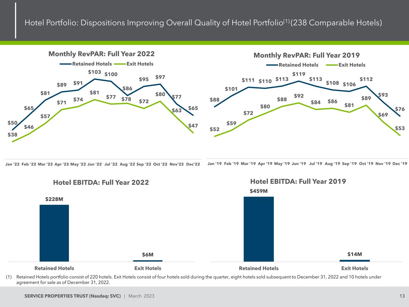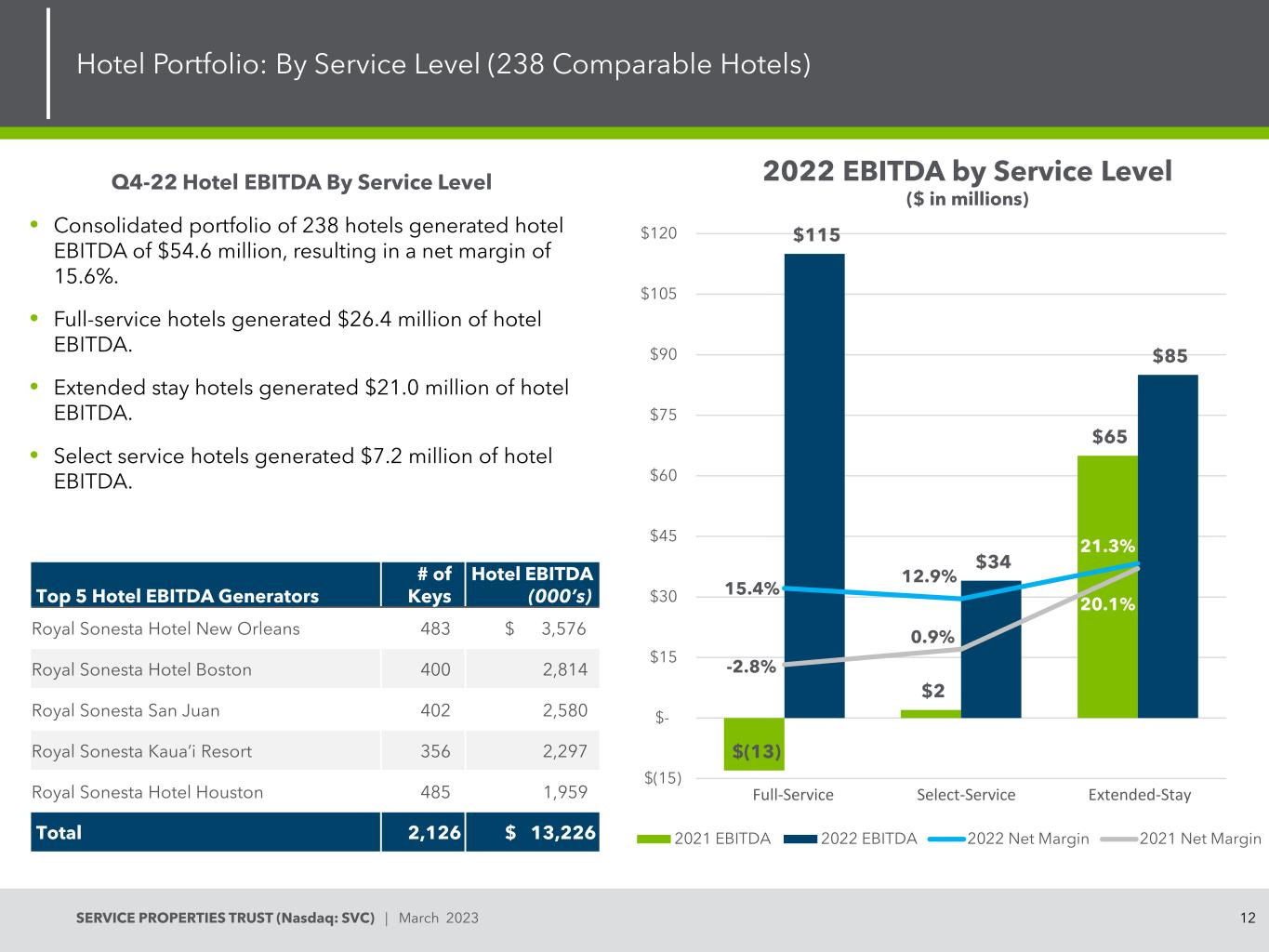 11SERVICE PROPERTIES TRUST(Nasdaq:SVC)| March 2023 Hotel Portfolio:Monthly Operating Metrics(238 Comparable Hotels)Monthly Hotel EBITDA($ Millions)60.3% 55.3% 50.5% 44.9% 53.0% 61.7% 65.5% 65.8% 69.7% 68.3% 63.3% 66.5% 67.2% 58.3% 50.4% $ 121 $ 115 $ 116 $ 110 $ 121 $ 129 $ 135 $ 137 $ 145 $ 145 $ 135 $ 141 $ 143 $ 131 $ 128 $ 73 $ 63 $ 59 $ 59 $ 49 $ 64 $ 79 $ 88 $ 90 $ 101 $ 99 $ 85 $ 94 $ 96 $ 76 $ 64 $ 0 $ 50 $ 100 $ 100 $ 150 $ 200 $ 2500% 10% 20% 30% 40% 50% 60% 70% 80% Oct‘21 Nov’21 Dec'21Jul‘22 Aug’22 Sep‘22 Oct’22 Nov‘22 Dec’22 Occupancy ADR RevPAR $ 17.2 $ 6.9 $ 3.3-$ 11.4 $ 1.7 $ 17.7 $ 24.2 $ 29.2 $ 37.3 $ 34.3 $ 17.0 $ 29.2 $ 34.3 $ 11.6 $ 8.7-$ 20-$ 10 $ 0 $ 10 $ 10 $ 20 $ 30 $ 40 Oct‘21 Nov’21 Dec‘21 Jan’22 Feb‘22 Mar’22 Apr‘22 May’22 Jul‘22 Aug’22 Sep‘22 Oct’22 Nov‘22 Dec’22