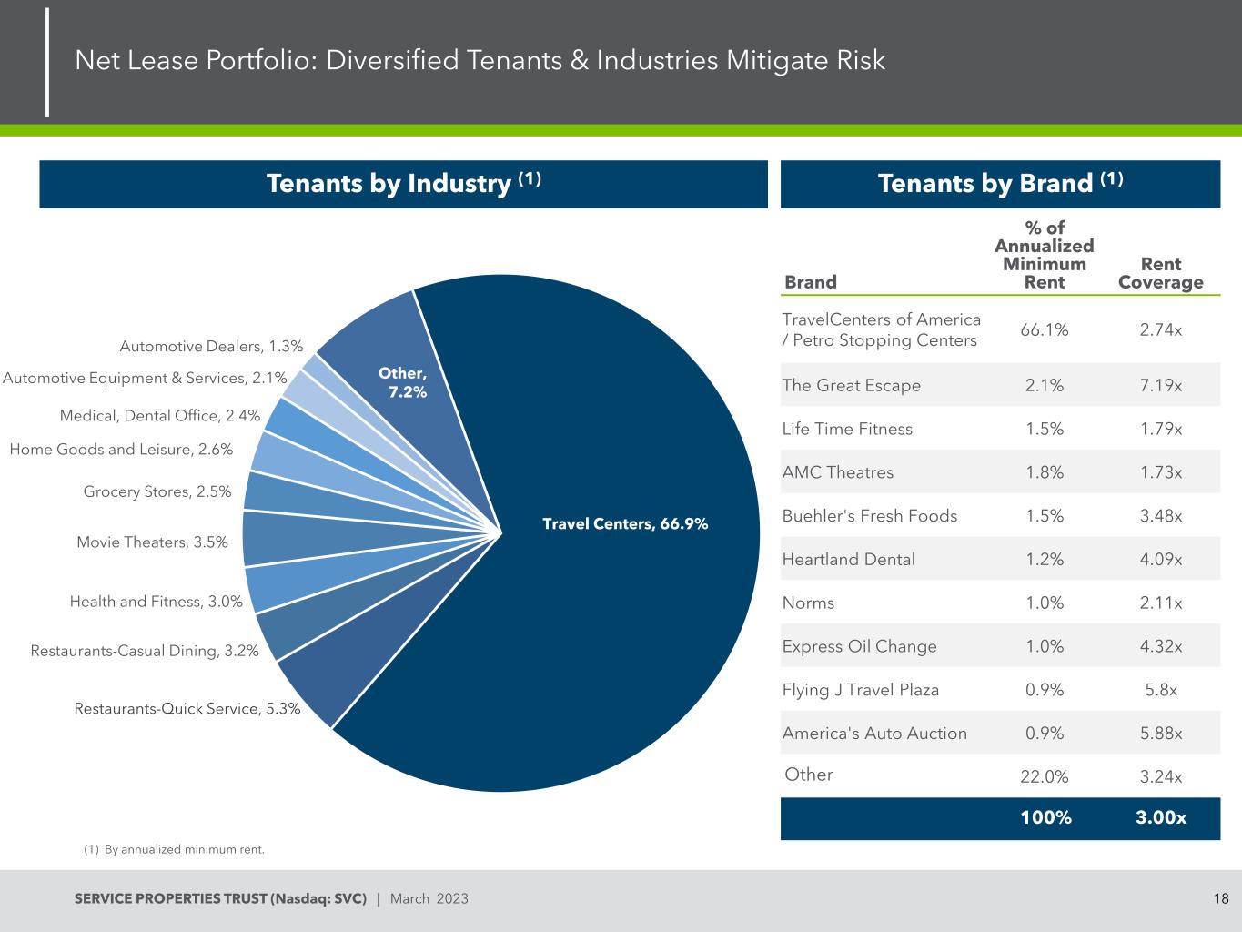 17SERVICE PROPERTIES TRUST(Nasdaq:SVC)| 2023年3月70% 14% 13% 4%百分比租金固定/预定CPI固定(1)按年化最低租金计算。Net Lease Portfolio:Reliable Income Stream and Low Capex Requirements Well-Laddered Lease Expirations(1)96% of Leases have Contractual Increases or Percentage Rent Lease Structures $ 372mm0.6% 3.0% 2.4% 3.3% 3.8% 2.5% 13.0% 1.1% 13.1% 14.4% 42.8% 20232024202520262027202820292030203120322033 +