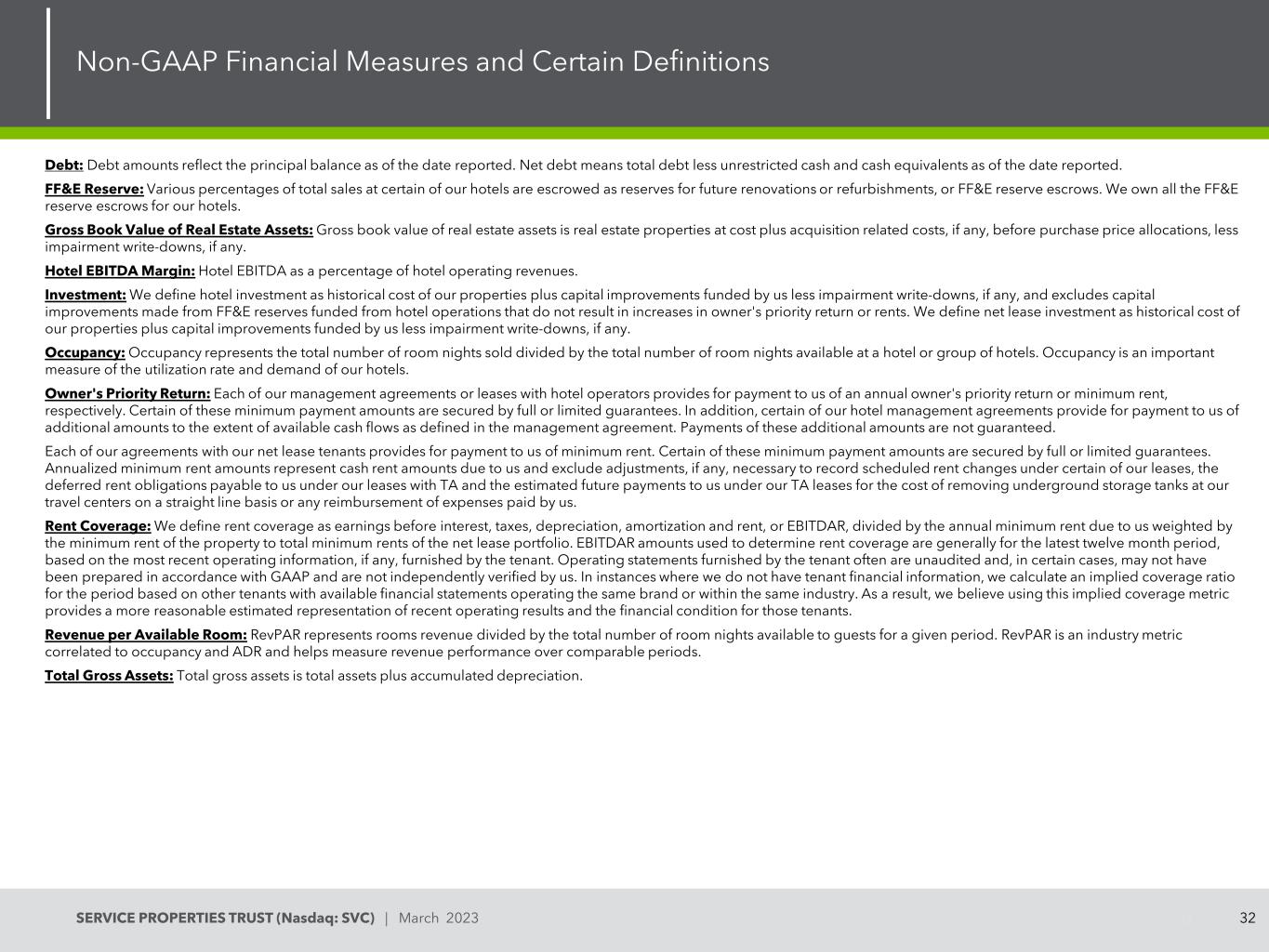 31SERVICE PROPERTIES TRUST(Nasdaq:SVC)| 2023年3月Non-GAAP财务指标和某些定义31 Non-GAAP财务指标:我们提供适用的美国证券交易委员会(SEC)规则所指的某些“非GAAP财务指标”,包括FFO、标准化FFO、EBITDA、酒店EBITDA、调整后酒店EBITDA、EBITDA和调整后EBITDA。根据公认会计原则,这些衡量标准不代表经营活动产生的现金,不应被视为替代净收益(亏损)作为我们经营业绩的指标或流动性的衡量标准。这些措施应与我们的综合收入(损失)报表中所列的净收入(损失)一并考虑。我们认为,这些非公认会计原则的衡量标准是对REIT的经营业绩以及净收入(亏损)的适当补充。我们相信,这些指标为投资者提供了有用的信息,因为通过排除某些历史金额的影响,例如折旧和摊销费用,它们可能有助于比较我们在不同时期的经营业绩以及与其他房地产投资信托基金的经营业绩。就酒店EBITDA而言,仅反映在酒店层面产生和发生的收入和支出项目,可能有助于投资者和管理层了解我们酒店的经营情况。FFO和Normalized FFO:我们计算来自运营的资金,即FFO和Normalized FFO,如第26页所示。FFO的计算依据是全国房地产投资信托协会(National Association of Real Estate Investment Trusts,简称Nareit)所定义的基础,即按照公认会计原则计算的净收入(亏损),不包括出售房产的任何收益或亏损,以及房地产资产减值损失(如果有的话),加上房地产折旧和摊销,减去权益证券的任何未实现收益和亏损,以及反映我们在被投资方应占FFO份额的调整,以及目前不适用于我们的某些其他调整。在计算归一化FFO时,我们对第26页所示的项目进行了调整。FFO和标准化FFO是董事会在决定分配给股东的金额时考虑的因素之一。其他因素包括(但不限于)满足REIT分配要求的要求、我们可获得的债务和股本资本、我们的分配率占我们普通股交易价格的百分比或股息收益率、以及其他房地产投资信托基金的股息收益率、我们对未来资本要求和经营业绩的预期、我们对支付债务所需现金和可用现金的预期。其他房地产公司和房地产投资信托基金计算FFO和标准化FFO的方法可能与我们不同。EBITDA、EBITDA和调整后EBITDA:我们计算利息、税项、折旧和摊销前利润,或EBITDA、房地产EBITDA和调整后EBITDA,如第27页所示。EBITDA是根据Nareit定义的基础计算的,即EBITDA,不包括出售房地产的损益、房地产资产减值损失(如果有的话),以及为反映我们在归属于被投资方的EBITDA中所占份额而进行的调整。在计算调整后的EBITDA时,我们对第27页所示的项目进行了调整。其他房地产公司和房地产投资信托基金对EBITDA、EBITDA和调整后EBITDA的计算可能与我们不同。酒店EBITDA:我们将酒店EBITDA计算为酒店运营收入减去所有管理和租赁酒店的酒店运营费用,然后根据公认会计原则在合并损益表中列报所需的任何调整。我们相信,酒店EBITDA为管理层和投资者提供了有用的信息,作为衡量我们酒店业务盈利能力的关键指标。其他定义调整后的总资产和未支配资产总额:调整后的总资产和未支配资产总额包括根据公认会计原则计算的扣除任何减值减记前的房地产资产的原始成本,不包括折旧和摊销、应收账款和无形资产。平均每日房价:ADR是指客房收入除以某一特定时期内售出的总间夜数。ADR为我们酒店的定价提供了有用的见解,是酒店行业广泛使用的一种衡量标准。连锁规模:以住宿业的数据基准和分析提供商STR为特征。可比酒店数据:我们在可比较的基础上列出各期的RevPAR、ADR和入住率,以便于各期之间的比较。我们通常将可比酒店定义为我们在2022年12月31日拥有的酒店,这些酒店自被比较的最早时期开始以来一直在营业。对于所列期间, 我们的可比结果排除了三家在报告的部分期间暂停营业的酒店。可用于偿债的综合收入:根据我们的债务协议的定义,可用于偿债的综合收入是指营业收入,不包括利息费用、股本证券的未实现损益、折旧和摊销、资产减值损失、持有待售资产的未实现增值、债务提前清偿的损益、出售财产的损益和递延费用的摊销。