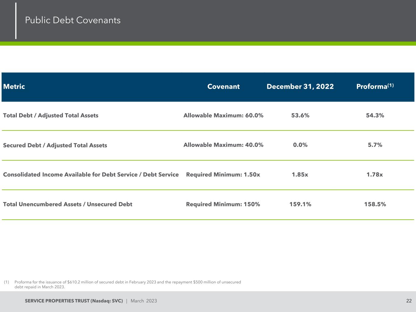 22SERVICE PROPERTIES TRUST(Nasdaq:SVC)| March 2023 Public Debt Covenants Metric Covenant December 31,2022 Proforma(1)Total Debt/Adjusted Total Assets Allowable Maximum:60.0% 53.6% 54.3% Secured Debt/Adjusted Total Assets Allowable Maximum:40.0% 0.0% 5.7% Consolidated Income Available for Debt Service/Debt Service Required Minimum:1.50x 1.85x 1.78x Total Unencured Assets/Unsecured Debt Required Minimum:150% 159.1% 158.5%(1)Proforma for the issuance of $ 6.102亿