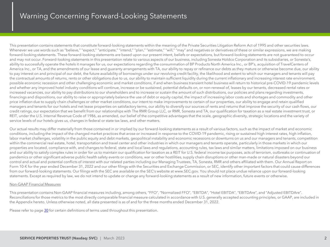 2SERVICE PROPERTIES TRUST(Nasdaq:SVC)| 2023年3月关于前瞻性陈述的警告本演示文稿包含的陈述构成1995年《私人证券诉讼改革法案》和其他证券法含义内的前瞻性陈述。每当我们使用诸如“相信”、“预期”、“预期”、“打算”、“计划”、“估计”、“将”、“可能”等词语,以及这些或类似表述的否定或衍生词时,我们都是在做出前瞻性陈述。这些前瞻性陈述是基于我们目前的意图、信念或预期,但前瞻性陈述不一定会发生,也可能不会发生。本演示文稿中的前瞻性陈述涉及我们业务的各个方面,包括Sonesta Holdco公司及其子公司或Sonesta公司成功运营其为我们管理的酒店的能力、我们对BP Products North America Inc.或BP公司收购TravelCenters of America Inc.的预期、我们与TA公司的租赁和担保安排的修订、我们在债务到期或到期时偿还或再融资的能力、我们支付债务利息和本金的能力,根据我们的循环信贷安排,未来可获得的借款,我们的经理和租户支付合同金额的回报、租金或其他应付我们的债务的可能性和程度,我们在当前通胀和利率上升的环境、可能的经济衰退和其他具有挑战性的经济和市场条件下保持充足流动性的能力,如果和何时商业暂时性酒店业务将恢复到新冠疫情之前的历史水平,以及任何改善的酒店行业条件是否会继续、增加或持续,租户可能违约或不续租,租金下降或空置率增加,我们向股东支付分配以及增加或维持此类分配金额的能力,我们在投资、融资和处置方面的政策和计划,我们筹集或适当平衡债务或股权资本使用的能力,由于供应链挑战或其他市场条件导致的劳动力成本和短缺以及商品和其他价格上涨的影响,我们改善某些物业的意图,我们有能力以令人满意的条件为我们的酒店和净租赁物业聘用和留住合格的经理和租户,我们有能力使我们的租金和回报来源多样化,以提高我们的现金流安全,我们的信用评级,我们期望我们从我们与The RMR Group有限责任公司(或RMR、Sonesta和TA)的关系中受益,我们有资格作为房地产投资信托公司(或REIT)纳税,根据经修订的1986年美国国内税收法,我们相信竞争优势,规模,地域多样性,我们酒店的战略位置和服务水平的多样性给了我们,联邦或州税法的变化,以及其他事项。我们的实际结果可能与我们的前瞻性陈述所载或暗示的结果存在重大差异,这是由于各种因素造成的,例如市场和经济状况的影响,包括因应新冠疫情而出现或增加的市场实践变化的影响、不断上升或持续的高利率、高通胀、劳动力市场挑战、公共股票和债券市场的波动、地缘政治不稳定以及经济衰退或低迷对我们以及我们的经理和租户的影响、商业地产、酒店内部的竞争,运输和旅游中心,以及我们的经理和租户经营的其他行业,特别是在我们的物业所在的市场,遵守联邦、州和地方法律法规、会计规则、税法和类似事项,以及对我们的业务施加的限制,以及我们满足复杂规则的能力,以保持我们作为REIT的纳税资格,用于美国联邦所得税、恐怖主义行为、流行病的爆发或持续,或其他重大不利的公共卫生安全事件或条件、战争或其他敌对行动,供应链中断或我们无法控制的其他人为或自然灾害,以及与我们的相关方的实际和潜在利益冲突,包括我们的管理受托人、TA、Sonesta、RMR和其他与他们有关联的人。我们截至2022年12月31日止年度的10-K表格年度报告以及我们向美国证券交易委员会提交的其他文件, 找出其他可能与我们的前瞻性陈述产生差异的重要因素。我们向SEC提交的文件可在SEC网站www.SEC.gov上查阅。您不应过分依赖我们的前瞻性陈述。除法律要求外,我们不打算因新信息、未来事件或其他原因而更新或更改任何前瞻性陈述。非GAAP财务指标本演示文稿包含非GAAP财务指标,其中包括“FFO”、“标准化FFO”、“EBITDA”、“酒店EBITDA”、“EBITDA”和“调整后EBITDA”。这些指标与根据美国公认会计原则计算的最直接可比的财务指标的对账情况载于本文件的附录。除非另有说明,所有数据均为截至2022年12月31日止三个月的数据。请参阅第30页,了解本演示文稿中使用的术语的某些定义。
