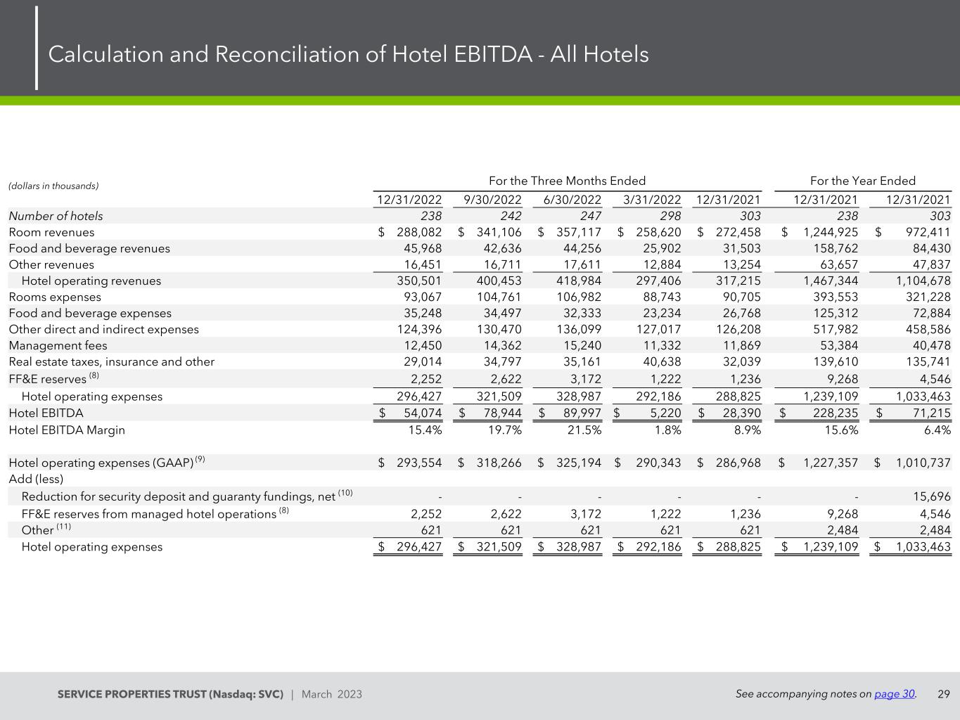 28SERVICE PROPERTIES TRUST(Nasdaq:SVC)| 2023年3月酒店EBITDA的计算与调节-可比酒店见第30页附注。(单位:千美元)截至12/31/20229/30/20226/30/20223/31/202212/31/202112/31/202212/31/2021酒店数量236236236236236235235客房收入287,337美元336,616美元333,893美元227,034美元234,829美元1,168,811美元824,395餐饮收入45,95242,57344,09525,39830,697154,96081,246其他收入16,31016,63517,46112,48312,81661,73745,838酒店营业收入-可比酒店349,599395,824395,449264,915278,3421,385,508951,479及饮料费35,22634,43032,16222,79725,824120,14068,799其他直接及间接费用125,255130,319127,909112,292109,131487,356404,555管理费12,89814,71814,62510,14010,84851,77934,644房地产税,保险及其他24,96629,97629,58731,73825,390113,506103,790 FF & E reserves(8)2,2522,6212,6001,7941,2369,2674,403酒店运营费用-可比酒店294,602314,714304,896255,793250,6101,145,447887,592酒店EBITDA 54,99781,11090,5539,12227,732240,06163,887酒店EBITDA利润率15.7% 20.5% 22.9% 3.4% 10.0% 17.3% 6.7%酒店运营收入(GAAP)(9)350,501美元400,453美元418,984美元297,406美元317,215美元1,467,344美元1,104,678加(减)非可比酒店运营278,342美元1,385,508美元951,479美元酒店运营费用(GAAP)(9)293,554美元318,266美元325,194美元290,343美元286,968美元1,227,357美元1,010,737美元加(减)非可比酒店的酒店运营费用(1,825)(6,794)(23,519)(36,965)(38,215)(91,798)(143,867)保证金和担保资金减少,净额(10)------15,698管理酒店运营的FF & E准备金(8)2,2522,6212,6001,7941,2369,2674,403其他(11)621621621621621621621酒店运营费用-可比酒店294,60