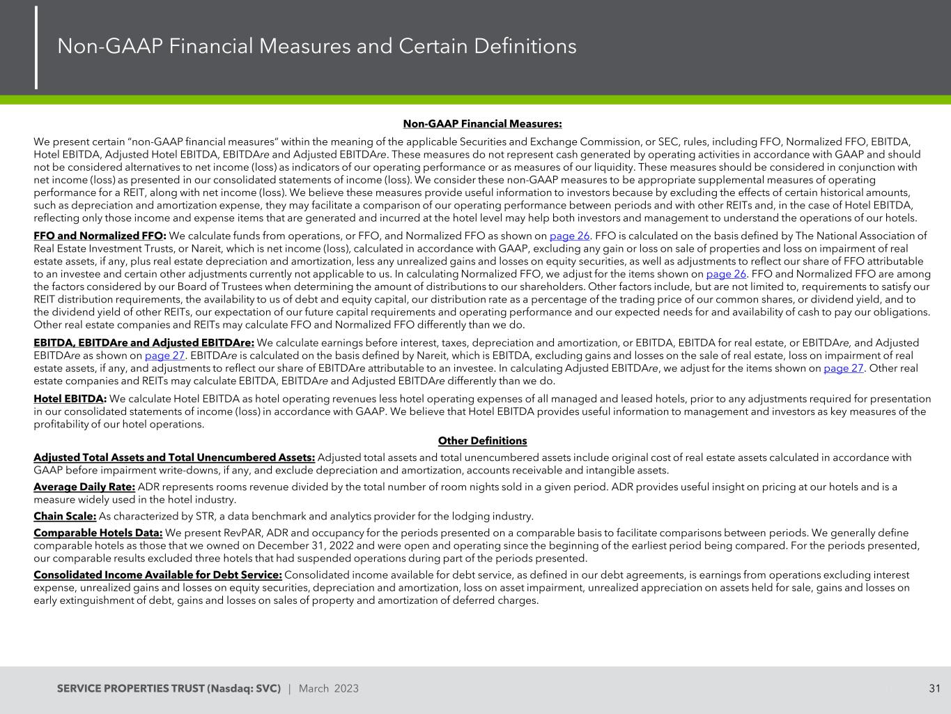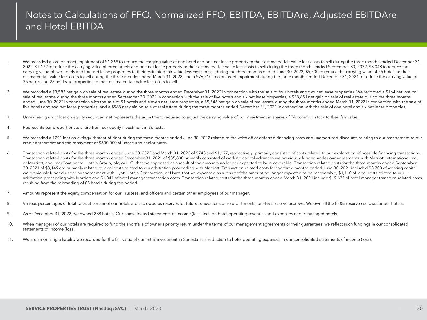 30SERVICE PROPERTIES TRUST(Nasdaq:SVC)| 2023年3月FFO、标准化FFO、EBITDA、EBITDA、调整后EBITDA和酒店EBITDA计算附注301。我们录得资产减值损失1269美元,将一家酒店和一处净租赁物业的账面价值减至截至2022年12月31日止三个月的估计公允价值减去出售成本,将三家酒店和一处净租赁物业的账面价值减至截至2022年9月30日止三个月的估计公允价值减去出售成本,减损1172美元,3048美元用于将两家酒店和四家净租赁物业的账面价值减至截至2022年6月30日止三个月的估计公允价值减去销售成本,5500美元用于将25家酒店的账面价值减至截至2022年3月31日止三个月的估计公允价值减去销售成本,以及截至2021年12月31日止三个月的资产减值损失76510美元用于将35家酒店和26家净租赁物业的账面价值减至估计公允价值减去销售成本。2.在截至2022年12月31日的三个月里,我们录得3583美元的房地产销售净收益,这与出售四家酒店和两处净租赁物业有关。在截至2022年9月30日的三个月中,我们录得与出售5家酒店和6处净租赁物业相关的房地产销售净亏损164美元,在截至2022年6月30日的三个月中,与出售51家酒店和11处净租赁物业相关的房地产销售净收益38851美元,在截至2022年3月31日的三个月中,与出售5家酒店和2处净租赁物业相关的房地产销售净收益5548美元,以及在截至2021年12月31日的三个月内出售房地产的净收益588美元,这与出售一家酒店和六处净租赁物业有关。3.股本证券的未实现收益或亏损净额是指将我们的TA普通股投资的账面价值调整为其公允价值所需的调整。4.代表我们在Sonesta的股权投资所占的比例。5.在截至2022年6月30日的三个月内,我们记录了791美元的债务清偿损失,这与我们修改信贷协议的递延融资成本和未摊销折扣的注销以及偿还500,000美元的无担保优先票据有关。6.截至2022年6月30日和2022年3月31日止三个月的交易相关成本分别为743美元和1177美元,主要包括与我们探索可能的融资交易相关的成本。截至2021年12月31日止三个月的交易相关成本为35,830美元,主要包括我们之前根据与万豪酒店国际公司(或万豪酒店)和洲际酒店集团(InterContinental Hotels Group,plc)或IHG(TERM2)签订的协议提供的营运资金垫款,由于预期无法收回的金额,我们将其计入了费用。截至2021年9月30日止三个月的交易相关费用为3149美元,主要与我们与万豪酒店的仲裁程序相关的法律费用有关。截至2021年6月30日止三个月的交易相关费用包括我们之前根据与Hyatt Hotels Corporation或凯悦的协议提供的3700美元营运资金,我们因预计无法收回的金额而支出,1110美元与我们与万豪酒店的仲裁程序相关的法律费用,以及1341美元的酒店经理交易费用。截至2021年3月31日止三个月的交易相关成本包括该期间88家酒店更名所产生的酒店经理过渡相关成本19635美元。7.金额代表我们的受托人、管理人员和我们经理的某些其他雇员的股权报酬。8.我们某些酒店的总销售额的不同百分比作为未来翻新或翻新的储备金或FF & E储备金代管。我们拥有我们酒店的所有FF & E储备代管。9.截至2022年12月31日,我们拥有238家酒店。我们的综合收入(亏损)报表包括酒店经营收入和我们管理的酒店的费用。10.当我们的酒店管理人员被要求根据我们的管理协议或其担保的条款为业主优先回报的不足提供资金时,我们将在我们的综合损益表中反映这些资金。11.我们正在摊销我们在Sonesta初始投资的公允价值记录的一项负债,作为我们综合损益表中酒店运营费用的减少。