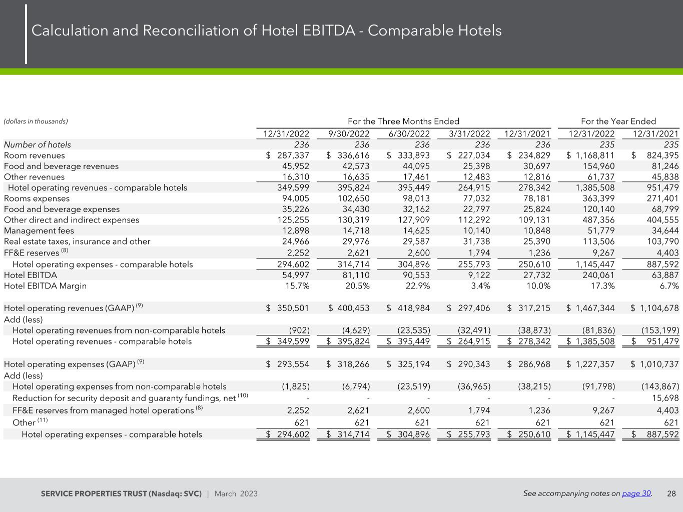 29SERVICE PROPERTIES TRUST(Nasdaq:SVC)| 2023年3月酒店EBITDA的计算与调节-所有酒店见第30页附注。(单位:千美元)截至12/31/20229/30/20226/30/20223/31/202212/31/202112/31/202112/31/2021酒店数量238242247298303238303客房收入288,082美元341,106美元357,117美元258,620美元272,458美元1,244,925美元972,411餐饮收入45,96842,63644,25625,90231,503158,76284,430其他收入16,45116,71117,61112,88413,25463,65747,837酒店营业收入350,501400,453418,984297,406317,2151,467,3441,104,678客房费用93,067104,76间接费用124,396130,470136,099127,017126,208517,982458,586管理费12,45014,36215,24011,33211,86953,38440,478房地产税,保险及其他29,01434,79735,16140,63832,039139,610135,741 FF & E准备金(8)2,2522,6223,1721,2221,2369,2684,546酒店经营费用296,427321,509328,987292,186288,8251,239,1091,033,463酒店EBITDA $ 54,074 $ 78,944 $ 89,997 $ 5,220 $ 28,390 $ 228,235 $ 71,215酒店EBITDA利润率15.4% 19.7% 21.5% 1.8% 8.9% 15.6% 6.4%酒店经营费用(GAAP)(9)$ 293,554 $ 318,266 $ 325,194 $ 290,343 $ 286,968 $ 1,227,357 $ 1,010,737加(减净额(10)-------管理的酒店业务的FF & E准备金15,696(8)2,2522,6223,1721,2221,2369,2684,546其他(11)62162162162162124842,484酒店运营费用296,427美元321,509美元328,987美元292,186美元288,825美元1,239,109美元1,033,463美元