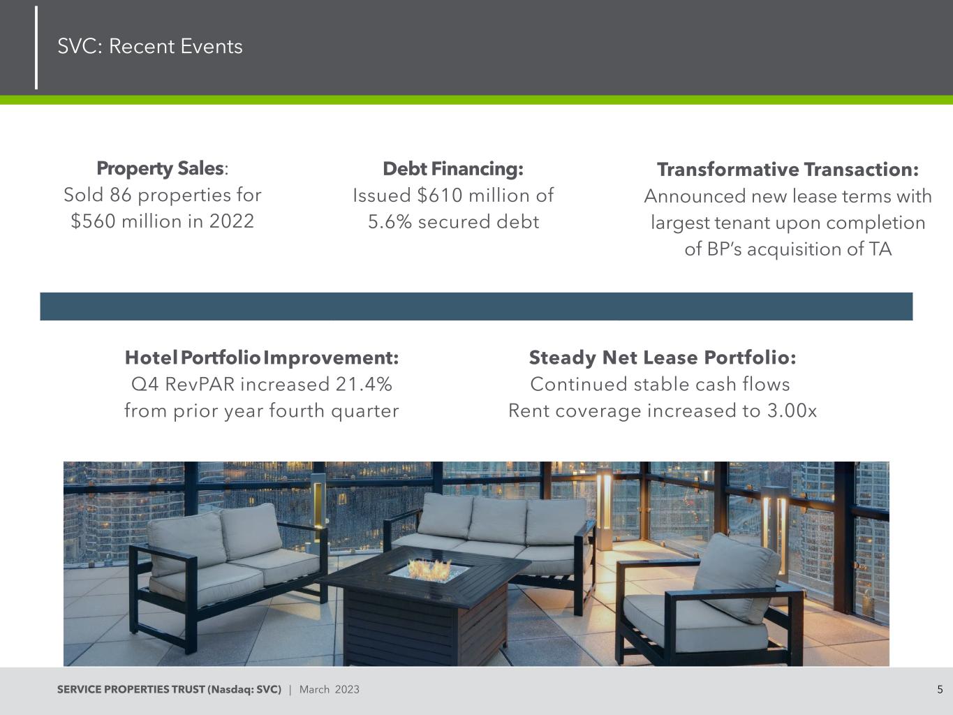 4SERVICE PROPERTIES TRUST(Nasdaq:SVC)| March 2023 SVC:Company Overview 238 HOTELS 40,053 KEYS $ 6.2B INVESTMENT 765 RETAIL NET LEASE ASSETS 13.4M RENTABLE SQUARE FEET $ 5.1B INVESTMENT 1,003 PROPERTIES $ 11.3B INVESTMENT Diversified Portfolio with National Scale