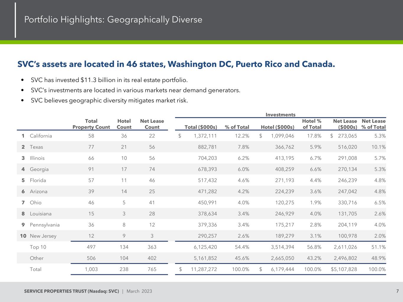 6SERVICE PROPERTIES TRUST(Nasdaq:SVC)| 2023年3月Net Lease Portfolio:Recent Developments BP to Acquire TA • 2023年2月16日,TA宣布同意与BP p.l.c.(NYSE:BP)合并。•该交易预计将为SVC提供3.793亿美元现金,用于支付其拥有的TA普通股的价值、TA商号的出售以及BP将预付的租金。•年租金收入将固定为2.54亿美元,在最初10年的租期和50年的延期选择期间每年增加2%。•英国石油北美公司(BP corporate North America Inc.,S & P A-& Moody’s A3)将为SVC的租约提供担保。•预计交易将提供额外的流动性和财务灵活性。