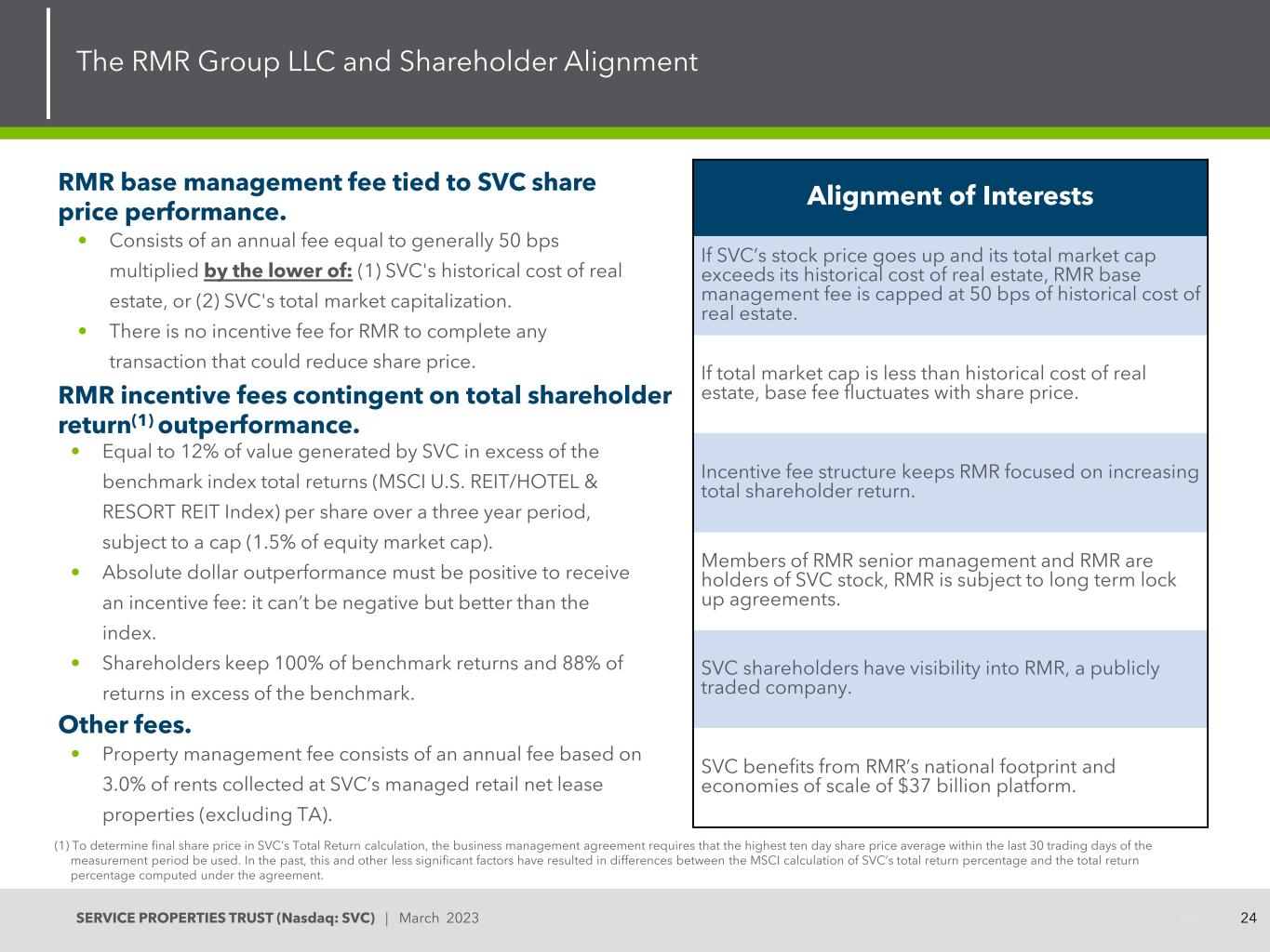 24SERVICE PROPERTIES TRUST(Nasdaq:SVC)| 2023年3月RMR基础管理费与SVC股价表现挂钩。RMR激励费用取决于股东总回报(1)的优异表现。•在三年期间,SVC产生的价值超过基准指数总回报(MSCI美国REIT/酒店及度假村REIT指数)的12%,但有上限(股票市值的1.5%)。•美元的绝对表现必须是正面的,才能获得激励费用:它不能是负面的,但要比指数好。•股东保留100%的基准回报率和88%的超额回报率。如果SVC的股价上涨,其总市值超过其历史房地产成本,则RMR基础管理费上限为历史房地产成本的50个基点。如果总市值小于房地产的历史成本,则基础费用随股价波动。激励费用结构使RMR以提高股东总回报为核心。RMR高级管理层和RMR的成员是SVC股票的持有者,RMR受长期锁定协议的约束。SVC的股东可以看到RMR,这是一家上市公司。SVC受益于RMR的全国足迹和370亿美元的规模经济平台。(1)在SVC的总回报计算中,为确定最终股价,业务管理协议要求使用计量期最后30个交易日内的最高十日平均股价。在过去,这一因素和其他不太重要的因素导致了MSCI对SVC总回报百分比的计算与根据协议计算的总回报百分比之间的差异。The RMR Group有限责任公司和股东联盟24其他费用。•物业管理费包括年费,按SVC管理的零售净租赁物业(不包括TA)收取的租金的3.0%计算。•包括通常等于50个基点的年费乘以以下两者中的较低者:(1)SVC的房地产历史成本,或(2)SVC的总市值。• RMR不收取任何可能降低股价的交易的激励费用。