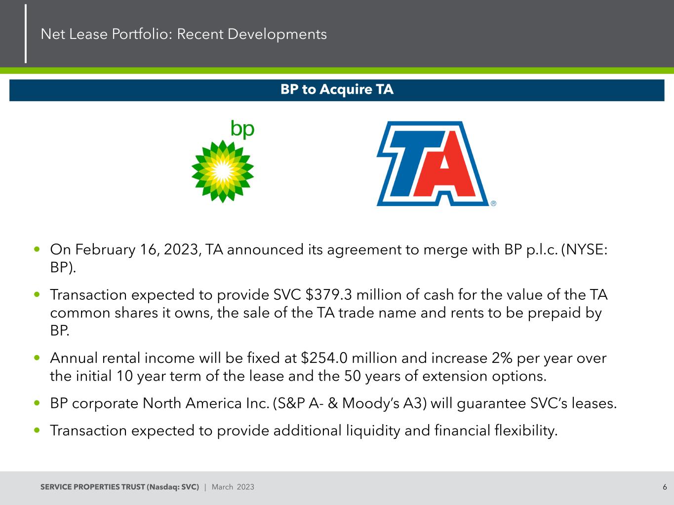 5SERVICE PROPERTIES TRUST(Nasdaq:SVC)| March 2023 SVC:Recent Events Property Sales:Sold 86 properties for $ 5.6亿in 2022 Debt Financing:Issued $ 6.1亿of 5.6% secured debt Well Covered Dividend:Annualized dividend of $ 0.80 per share represents a 53% Normalized FFO payout ratio2022年HotelPortfolioImprovement:Q4 RevPAR同比增长21.4% Q4 Steady Net Lease Portfolio:Continued stable cash flow Rent coverage increased to 3.00x t l rtf li I rt:v i cr s. fr ri r y r f rt rt r Steady Net L as Portfoli:Continued stable cash flow Rent coverage increased d to 3.00 x Property Sales:Sold 86 properties for $ 5.6亿in 2022 Well Cov red D vidend:Annualized dividend of $ 0.80 pe share represents a 53% Normalized FFO py ut ratio2022年债务融资:发行6.1亿美元5.6%的有担保债务Transformative Transaction:在BP完成对TA的收购后宣布与最大租户的新租赁条款