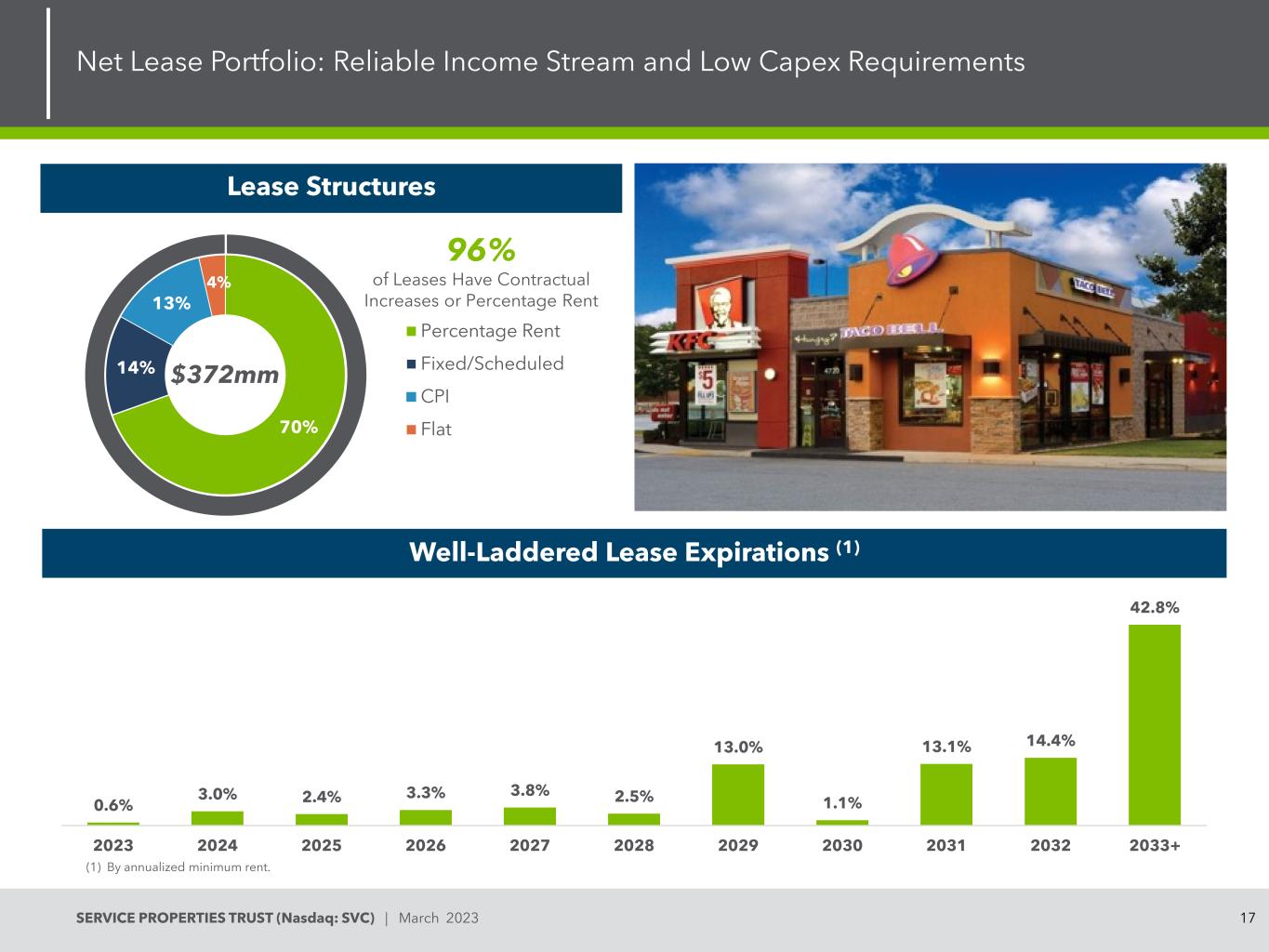 16SERVICE PROPERTIES TRUST(Nasdaq:SVC)| 2023年3月Net Lease Portfolio:High-quality Service & Necessity-Based Assets Net Lease Portfolio Statistics 765 $ 372mm Properties Annualized Minimum Rent 13.4mm9.6 Rentable Square Feet Weighted Average Lease Term(1)97.6% 3.00x Occupancy Rent Coverage Diverse Geographical Footprint(1)(1)By annualized Minimum Rent。21行业| 138 Brands % of Annual Minimum Rent < 1% > 8.6%