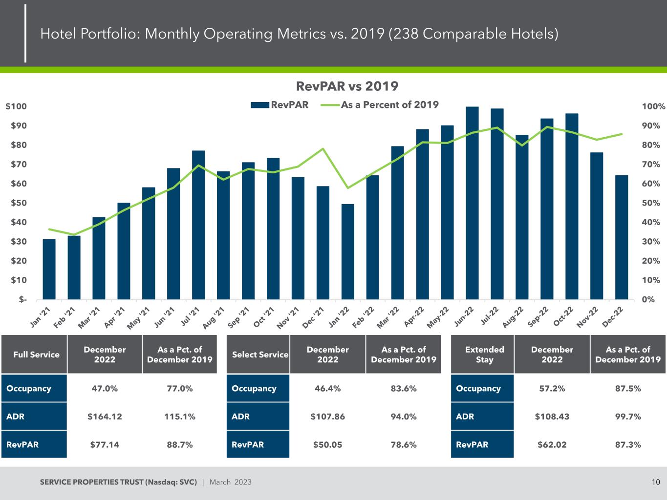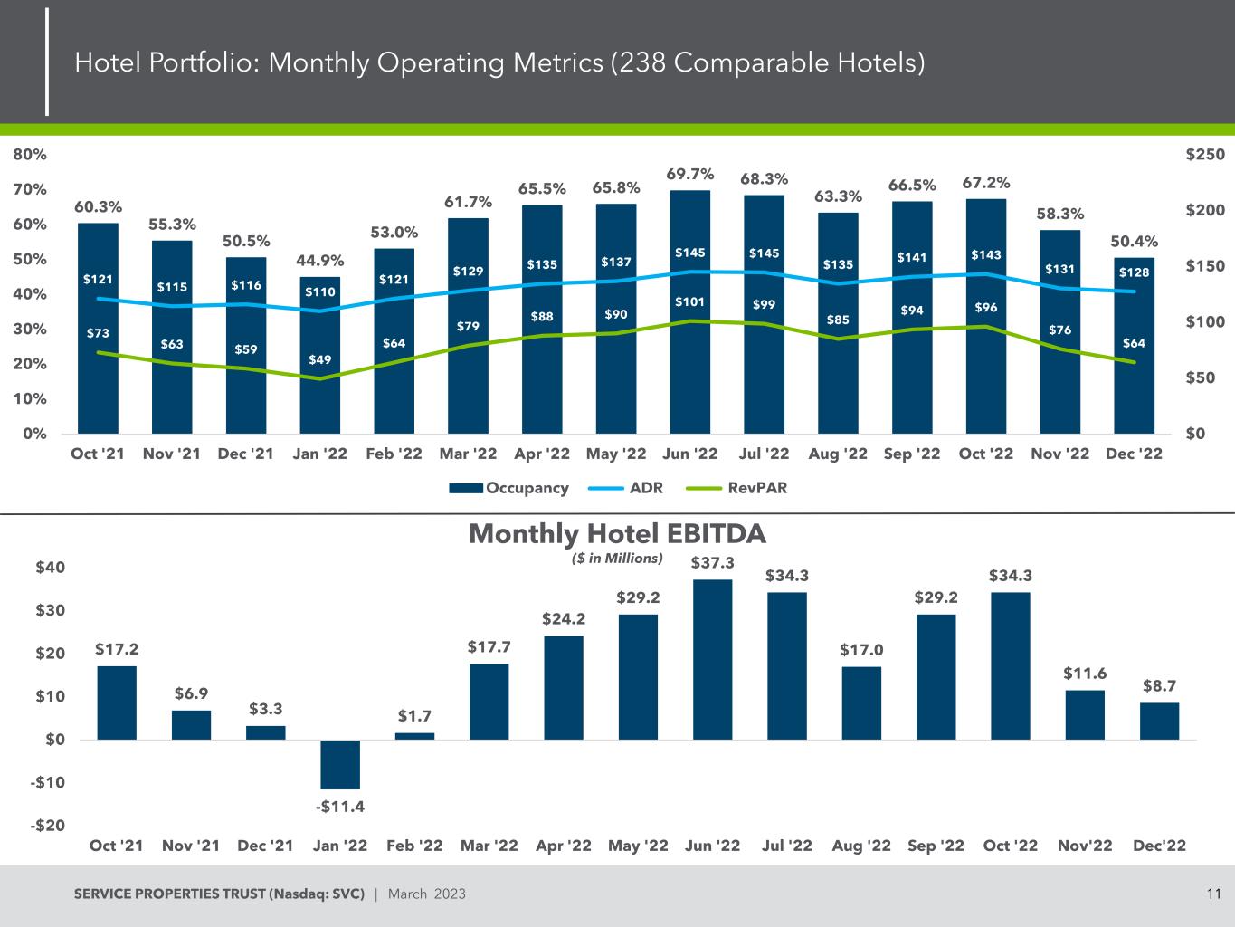 10SERVICE PROPERTIES TRUST(Nasdaq:SVC)| March 2023 Hotel Portfolio:Monthly Operating Metrics vs. 2019(238 Comparable Hotels)0% 10% 20% 30% 40% 40% 50% 60% 70% 80% 90% 100% $-$ 10 $ 20 $ 30 $ 40 $ 50 $ 60 $ 70 $ 80 $ 90 $ 100 RevPAR vs. 2019 RevPAR As a Percent of 2019 Full Service December 2022 As a Pct. of December 2019 Select Service December 2022 As a Pct. of December 2019 Extended Stay December 2022 As a Pct. of December 2019 Occupancy 47.0% 77.0% Occupancy 46.4% 83.6% Occupancy 57.2% 87.5% ADR $ 164.12 115.1% ADRevPAR $ 50.05 78.6% RevPAR $ 62.02 87.3%