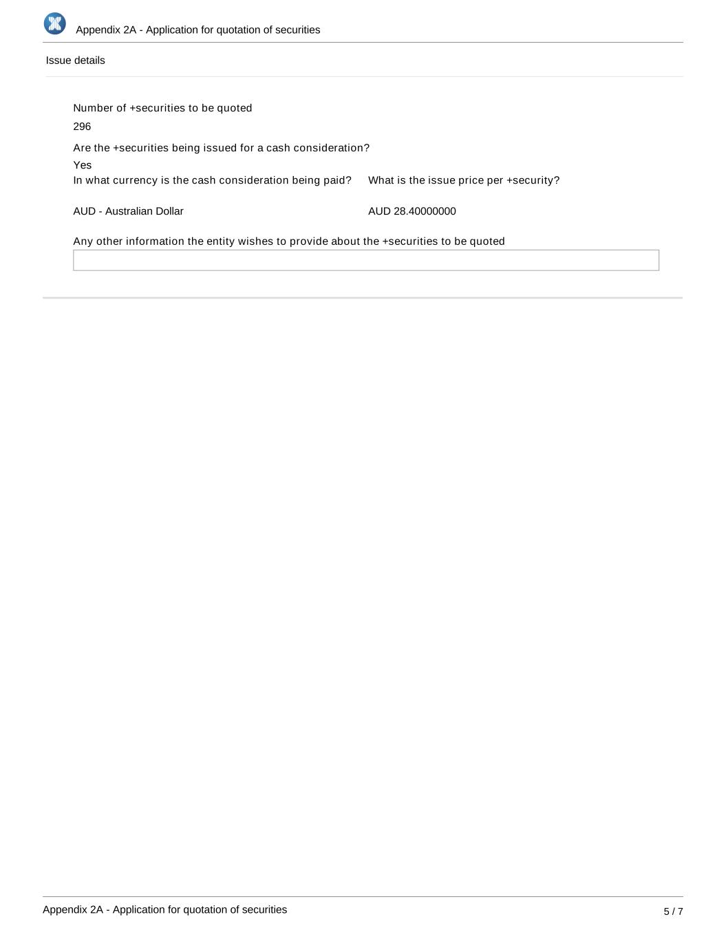 附录2A-证券报价申请附录2A-证券报价申请5/7发行详情+证券报价数量296 +证券是否为现金对价发行?现金对价以什么货币支付?澳元-澳元每+证券发行价是多少?28.40000000澳元实体希望提供的有关拟报价的+证券的任何其他信息是