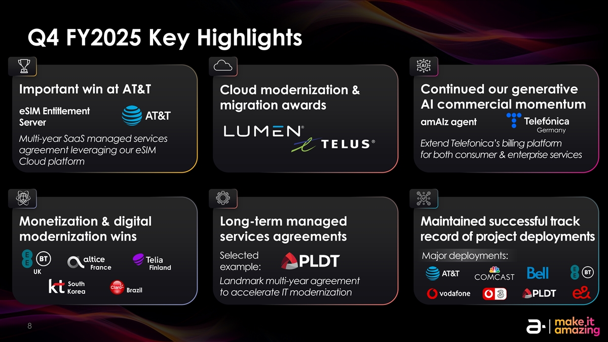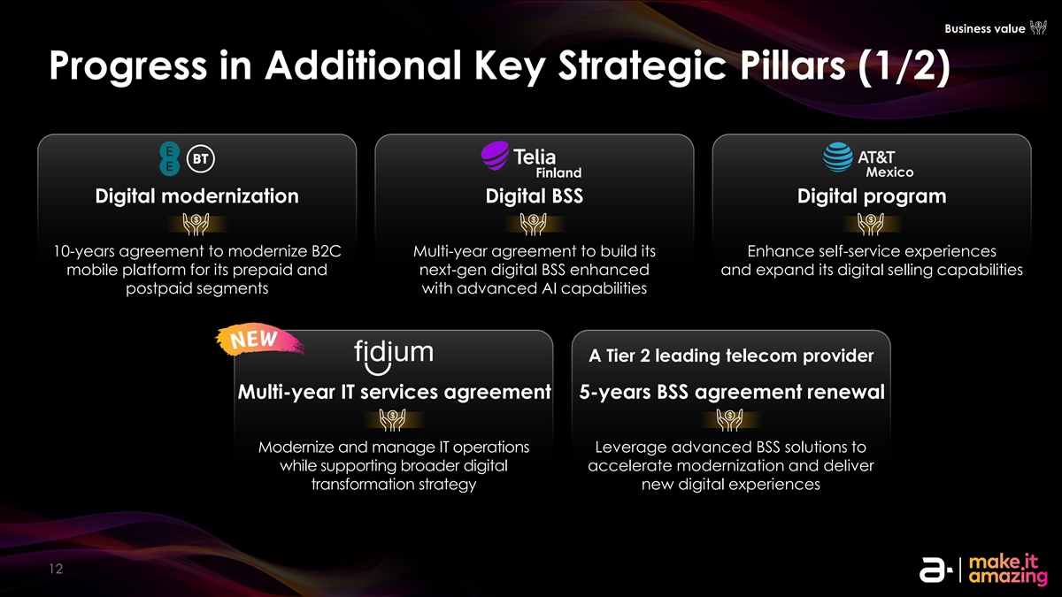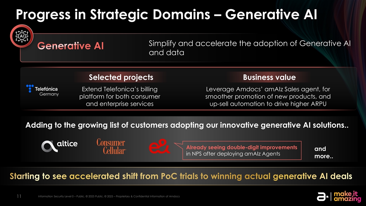 战略领域的进展–生成式AI简化并加速采用生成式AI和数据选定项目的业务价值扩展了西班牙电信的计费杠杆AMDOCs的AMAIz销售代理,为德国平台提供了既可以为消费者更顺畅地推广新产品,又可以为企业服务追加销售自动化以推动更高的ARPU,从而使采用我们创新的生成式AI解决方案的客户名单不断增加……已经看到两位数的改善和在部署AMAIz Agents更多后在NPS.。信息安全等级0–公开。©2025年公开。©2025 – AMDOCs 11的专有和机密信息