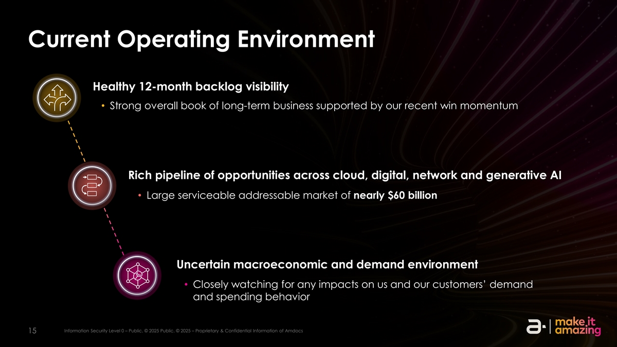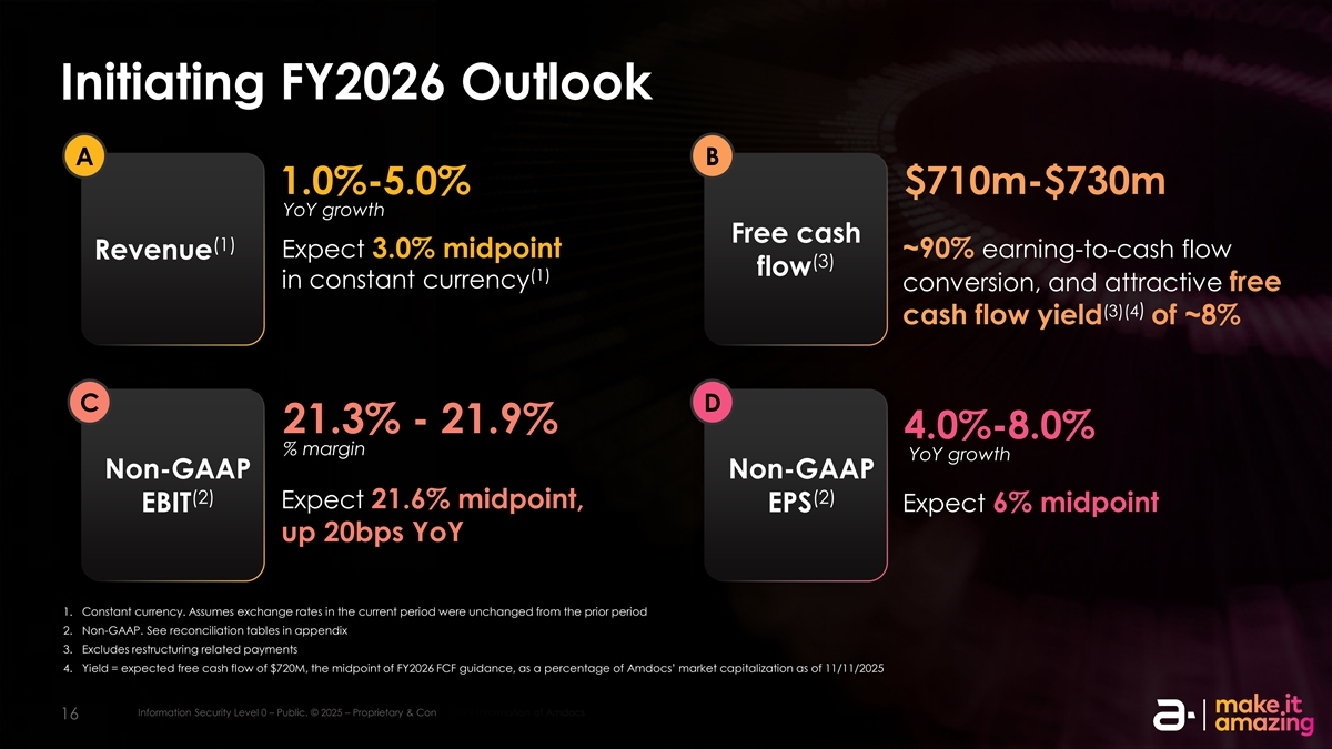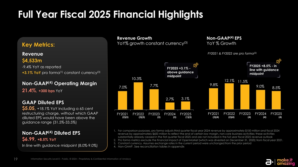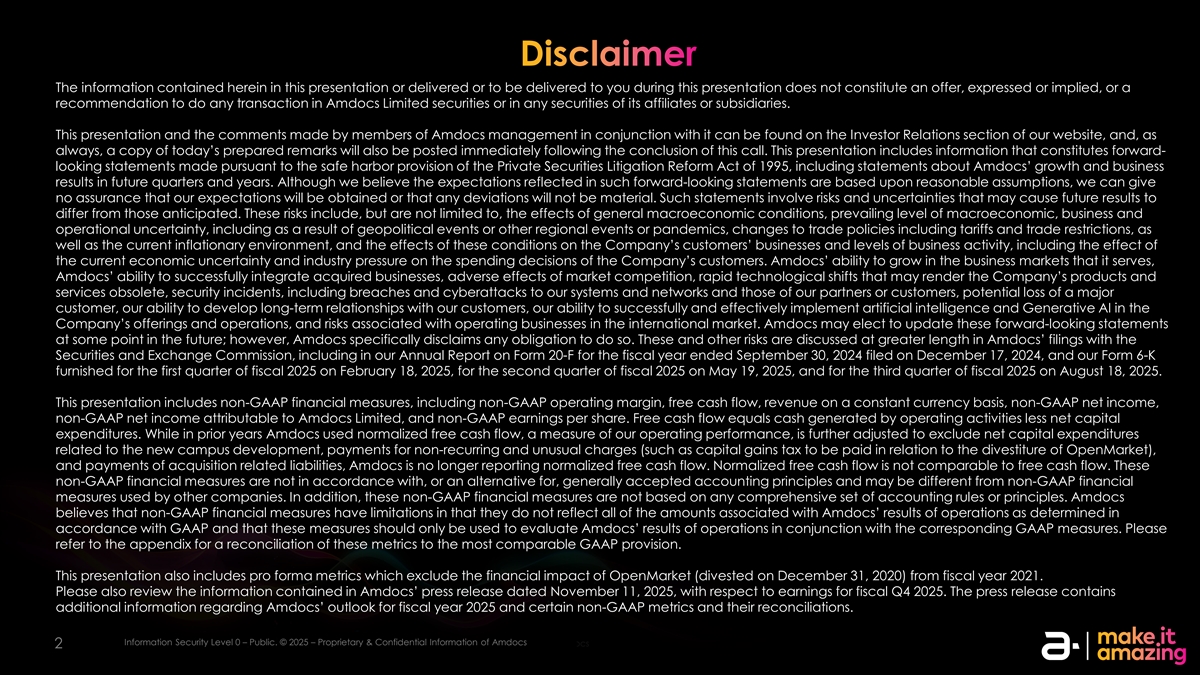 本演示文稿中包含的或在本演示文稿期间交付或将交付给您的信息并不构成对Amdocs Limited证券或其关联公司或子公司的任何证券进行任何交易的明示或暗示的要约或建议。本演示文稿以及Amdocs管理层成员与其一起发表的评论可在我们网站的投资者关系部分找到,并且与往常一样,今天准备好的评论的副本也将在本次电话会议结束后立即发布。该演示文稿包含的信息构成了根据1995年《私人证券诉讼改革法案》的安全港条款所作的前瞻性陈述,包括有关AmDOCs在未来几个季度和几年的增长和业务结果的陈述。尽管我们认为此类前瞻性陈述中反映的预期是基于合理的假设,但我们不能保证我们的预期将会获得,或者任何偏差都不会是重大的。此类陈述涉及可能导致未来结果与预期结果不同的风险和不确定性。这些风险包括但不限于一般宏观经济条件、宏观经济普遍水平、商业和运营不确定性的影响,包括地缘政治事件或其他区域事件或流行病的结果、包括关税和贸易限制在内的贸易政策变化,以及当前的通货膨胀环境,以及这些条件对公司客户的业务和商业活动水平的影响,包括当前经济不确定性和行业压力对公司客户的支出决策的影响。AMDOCs在其所服务的业务市场的增长能力、AMDOCs成功整合收购业务的能力、市场竞争的不利影响、可能导致公司产品和服务过时的快速技术转变、安全事件,包括对我们的系统和网络以及我们的合作伙伴或客户的系统和网络的破坏和网络攻击、主要客户的潜在损失、我们与客户发展长期关系的能力、我们在公司产品和运营中成功有效地实施人工智能和生成式人工智能的能力,以及与在国际市场经营业务相关的风险。Amdocs可能会选择在未来某个时候更新这些前瞻性陈述;然而,Amdocs明确表示不承担这样做的任何义务。这些风险和其他风险在AMDOCs提交给美国证券交易委员会的文件中有更详细的讨论,包括我们在2024年12月17日提交的截至2024年9月30日的财政年度的20-F表格年度报告,以及我们在2025年2月18日提供的2025财年第一季度、2025年5月19日提供的2025财年第二季度和2025年8月18日提供的2025财年第三季度的6-K表格。该演示文稿包括非GAAP财务指标,包括非GAAP营业利润率、自由现金流、以固定货币为基础的收入、非GAAP净收入、归属于Amdocs Limited的非GAAP净利润以及非GAAP每股收益。自由现金流等于经营活动产生的现金减去净资本支出。虽然在前几年,Amdocs使用了标准化自由现金流,这是衡量我们经营业绩的一个指标,但进一步调整以排除与新校区开发相关的净资本支出、支付非经常性和不寻常的费用(例如与剥离OpenMarket相关的资本利得税)以及支付收购相关负债,Amdocs不再报告标准化自由现金流。正常化的自由现金流不能与自由现金流相比。这些非GAAP财务指标不符合或替代公认会计原则,可能与其他公司使用的非GAAP财务指标不同。此外,这些非美国通用会计准则财务指标并非基于任何一套全面的会计规则或原则。Amdocs认为,非GAAP财务指标存在局限性,因为它们并未反映根据GAAP确定的与Amdocs经营业绩相关的所有金额,这些指标应仅用于结合相应的GAAP指标评估Amdocs的经营业绩。请参阅附录,了解这些指标与最具可比性的GAAP规定的对账情况。该演示文稿还包括不包括OpenMarket(于2020年12月31日剥离)对2021财年的财务影响的备考指标。还请查阅AmDOCs于2025年11月11日发布的新闻稿中包含的信息, 关于2025财年第四季度的收益。新闻稿包含有关AmDOCs对2025财年的展望以及某些非GAAP指标及其对账的更多信息。信息安全等级0–公开。©2025 – AMDOCs信息安全0级的专有&机密信息–公开。©2025年公开。©2025 – AMDOCs的专有和机密信息22