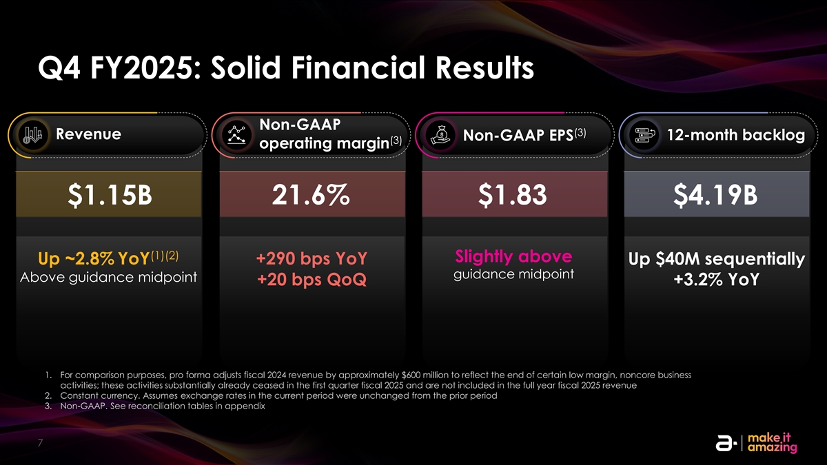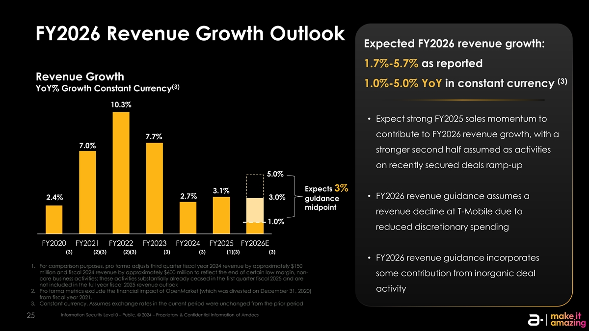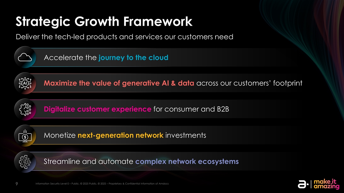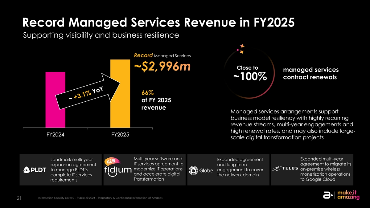 本演示文稿中包含的或在本演示文稿期间交付或将交付给您的信息并不构成对Amdocs Limited证券或其关联公司或子公司的任何证券进行任何交易的明示或暗示的要约或建议。本演示文稿以及Amdocs管理层成员与其一起发表的评论可在我们网站的投资者关系部分找到,并且与往常一样,今天准备好的评论的副本也将在本次电话会议结束后立即发布。该演示文稿包含的信息构成了根据1995年《私人证券诉讼改革法案》的安全港条款所作的前瞻性陈述,包括有关AmDOCs在未来几个季度和几年的增长和业务结果的陈述。尽管我们认为此类前瞻性陈述中反映的预期是基于合理的假设,但我们不能保证我们的预期将会获得,或者任何偏差都不会是重大的。此类陈述涉及可能导致未来结果与预期结果不同的风险和不确定性。这些风险包括但不限于一般宏观经济条件、宏观经济普遍水平、商业和运营不确定性的影响,包括地缘政治事件或其他区域事件或流行病的结果、包括关税和贸易限制在内的贸易政策变化,以及当前的通货膨胀环境,以及这些条件对公司客户的业务和商业活动水平的影响,包括当前经济不确定性和行业压力对公司客户的支出决策的影响。AMDOCs在其所服务的业务市场的增长能力、AMDOCs成功整合收购业务的能力、市场竞争的不利影响、可能导致公司产品和服务过时的快速技术转变、安全事件,包括对我们的系统和网络以及我们的合作伙伴或客户的系统和网络的破坏和网络攻击、主要客户的潜在损失、我们与客户发展长期关系的能力、我们在公司产品和运营中成功有效地实施人工智能和生成式人工智能的能力,以及与在国际市场经营业务相关的风险。Amdocs可能会选择在未来某个时候更新这些前瞻性陈述;然而,Amdocs明确表示不承担这样做的任何义务。这些风险和其他风险在AMDOCs提交给美国证券交易委员会的文件中有更详细的讨论,包括我们在2024年12月17日提交的截至2024年9月30日的财政年度的20-F表格年度报告,以及我们在2025年2月18日提供的2025财年第一季度、2025年5月19日提供的2025财年第二季度和2025年8月18日提供的2025财年第三季度的6-K表格。该演示文稿包括非GAAP财务指标,包括非GAAP营业利润率、自由现金流、以固定货币为基础的收入、非GAAP净收入、归属于Amdocs Limited的非GAAP净利润以及非GAAP每股收益。自由现金流等于经营活动产生的现金减去净资本支出。虽然在前几年,Amdocs使用了标准化自由现金流,这是衡量我们经营业绩的一个指标,但进一步调整以排除与新校区开发相关的净资本支出、支付非经常性和不寻常的费用(例如与剥离OpenMarket相关的资本利得税)以及支付收购相关负债,Amdocs不再报告标准化自由现金流。正常化的自由现金流不能与自由现金流相比。这些非GAAP财务指标不符合或替代公认会计原则,可能与其他公司使用的非GAAP财务指标不同。此外,这些非美国通用会计准则财务指标并非基于任何一套全面的会计规则或原则。Amdocs认为,非GAAP财务指标存在局限性,因为它们并未反映根据GAAP确定的与Amdocs经营业绩相关的所有金额,这些指标应仅用于结合相应的GAAP指标评估Amdocs的经营业绩。请参阅附录,了解这些指标与最具可比性的GAAP规定的对账情况。该演示文稿还包括不包括OpenMarket(于2020年12月31日剥离)对2021财年的财务影响的备考指标。还请查阅AmDOCs于2025年11月11日发布的新闻稿中包含的信息, 关于2025财年第四季度的收益。新闻稿包含有关AmDOCs对2025财年的展望以及某些非GAAP指标及其对账的更多信息。信息安全等级0–公开。©2025 – AMDOCs信息安全0级的专有&机密信息–公开。©2025年公开。©2025 – AMDOCs的专有和机密信息22