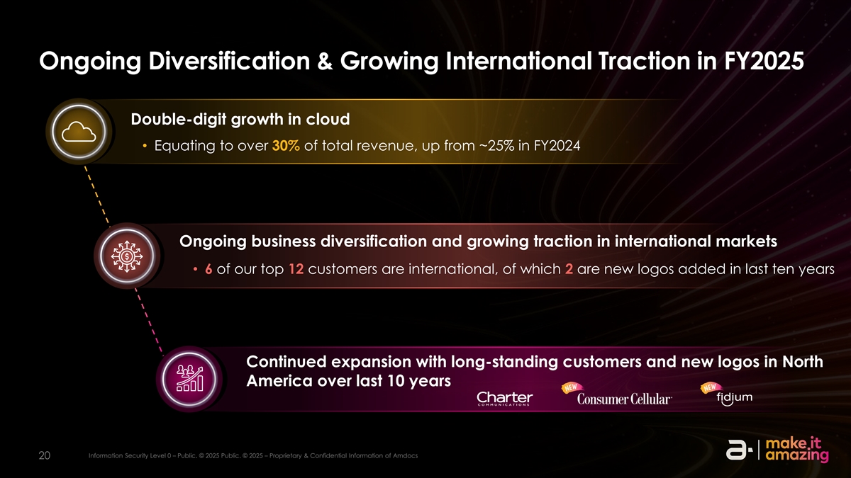 持续的多元化&增长的国际牵引力在2025财年云的两位数增长•相当于总收入的30%以上,高于2024财年的约25%持续的业务多元化和在国际市场的日益增长的牵引力•我们的前12大客户中有6个是国际客户,其中2个是过去十年中增加的新标识,在过去10年中与北美的长期客户和新标识持续扩展信息安全Level 0 – Public。©2024 – AMDOCs信息安全0级的专有和机密信息–公开。©2025年公开。©2025 – AMDOCs的专有和机密信息2020