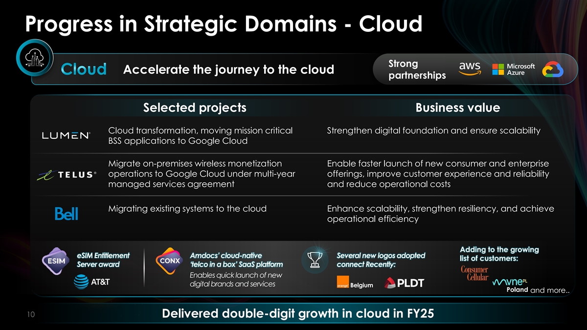 战略领域的进展-Cloud Strong加速向云伙伴关系的旅程选定的项目业务价值云转型,将任务关键化加强数字基础并确保可扩展性BSS应用程序迁移到Google Cloud将本地无线货币化能够在多年产品下更快地将新的消费者和企业运营启动到Google Cloud,改善客户体验和可靠性托管服务协议并降低运营成本将现有系统迁移到云上增强可扩展性,加强弹性,并实现运营效率为不断增长的eSIM权利增添力量AmDOCs的云原生采用了几个新标识的客户名单:Server Award‘Telco in a box’SaaS平台connect最近:能够快速推出新的数字品牌和服务比利时波兰等.。信息安全等级0–公开。©2025年公开。©2025 – AMDOCs 1010的专有和机密信息在25财年实现了两位数的云增长