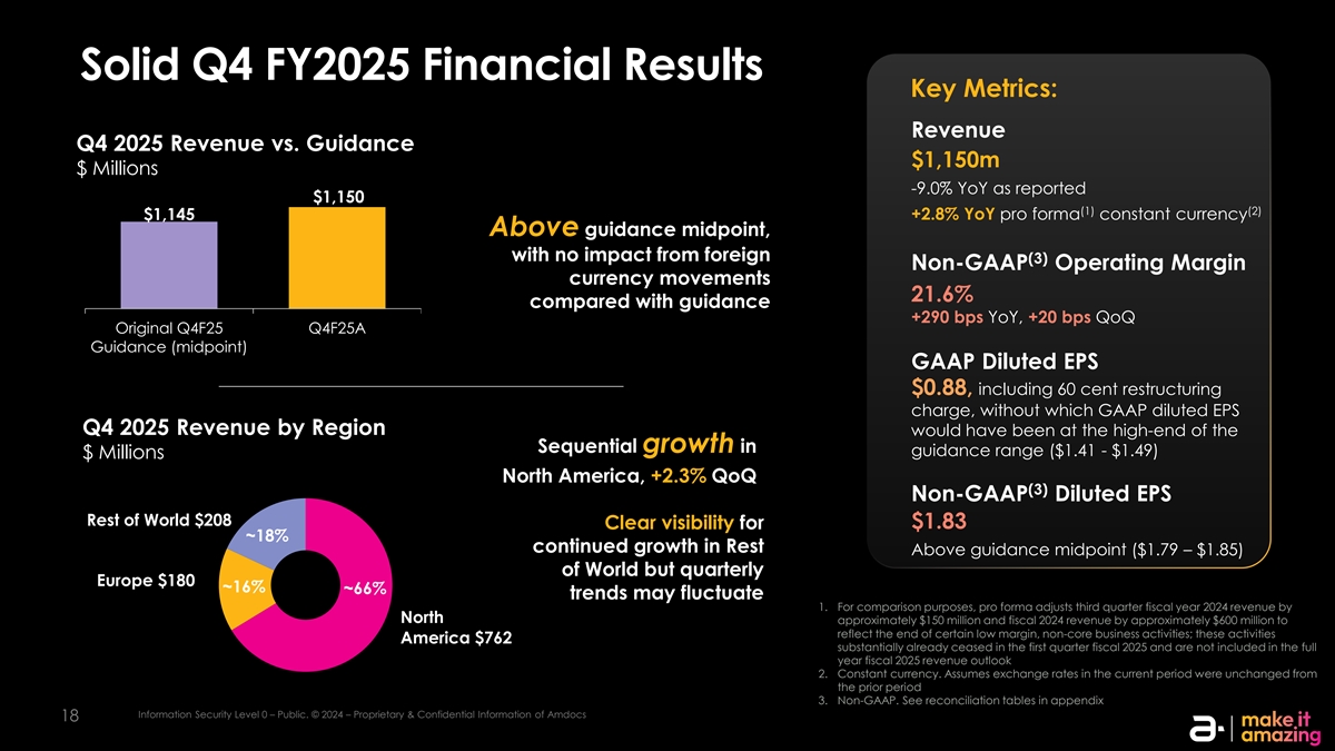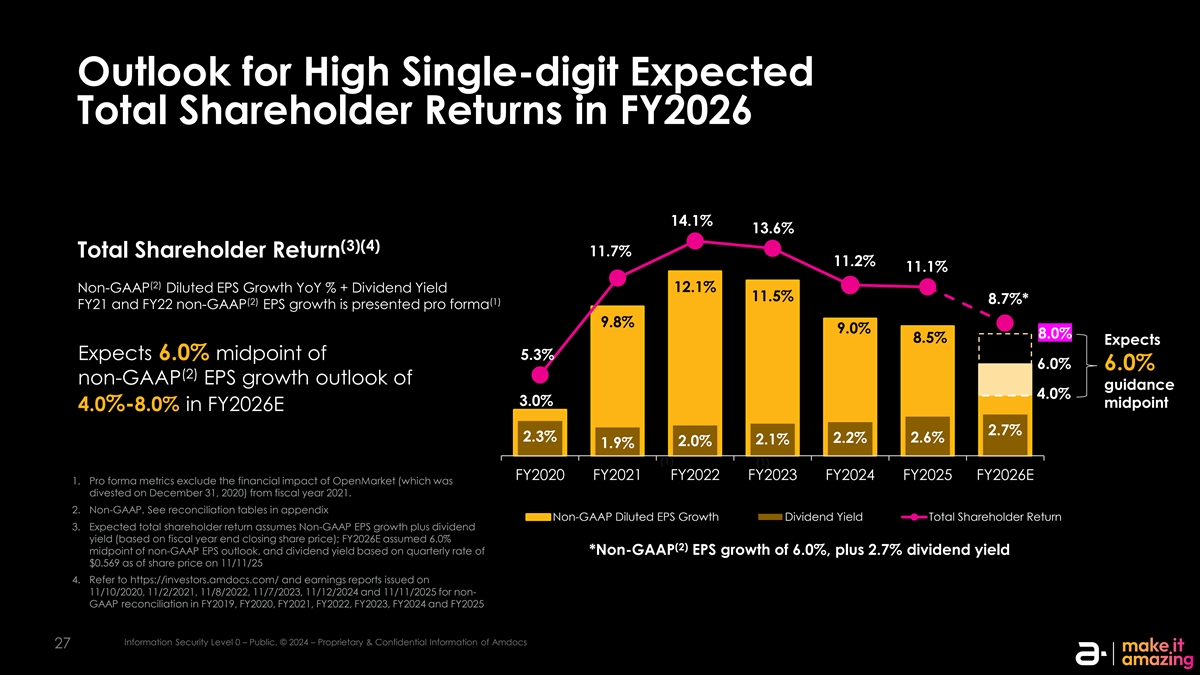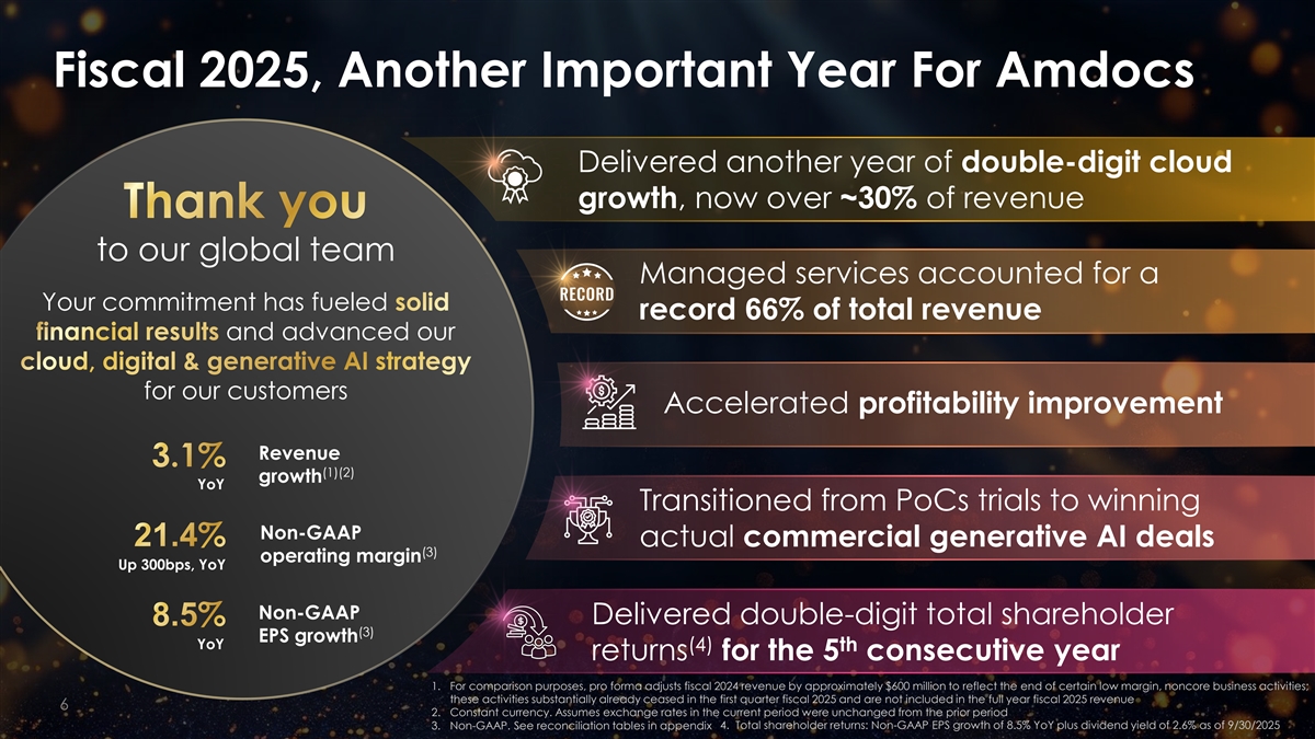 2025财年,AmDOCs又一个重要的一年实现了两位数的云增长,现在超过了我们全球团队约30%的收入托管服务占总收入的创纪录的66%,并推动了我们为客户加速盈利能力改善收入(1)(2)增长YoY从POCs试验过渡到赢得非GAAP实际商业生成AI交易(3)营业利润率上升300个基点,YoY非GAAP实现了两位数的总股东(3)EPS增长YoY(4)连续5年回报1。为便于比较,备考将2024财年的收入调整了约6亿美元,以反映某些低利润率、非核心业务活动的结束;这些活动基本上已经在2025财年第一季度停止,并且不包括在2025财年全年的收入中62。不变的货币。假设本期汇率与上一期持平信息安全等级2 –敏感。©2025 – AmDocs 63的专有和机密信息。非公认会计原则。见附录4中的调节表。股东总回报:截至2025年9月30日非美国通用会计准则每股收益同比增长8.5%加上股息收益率2.6%