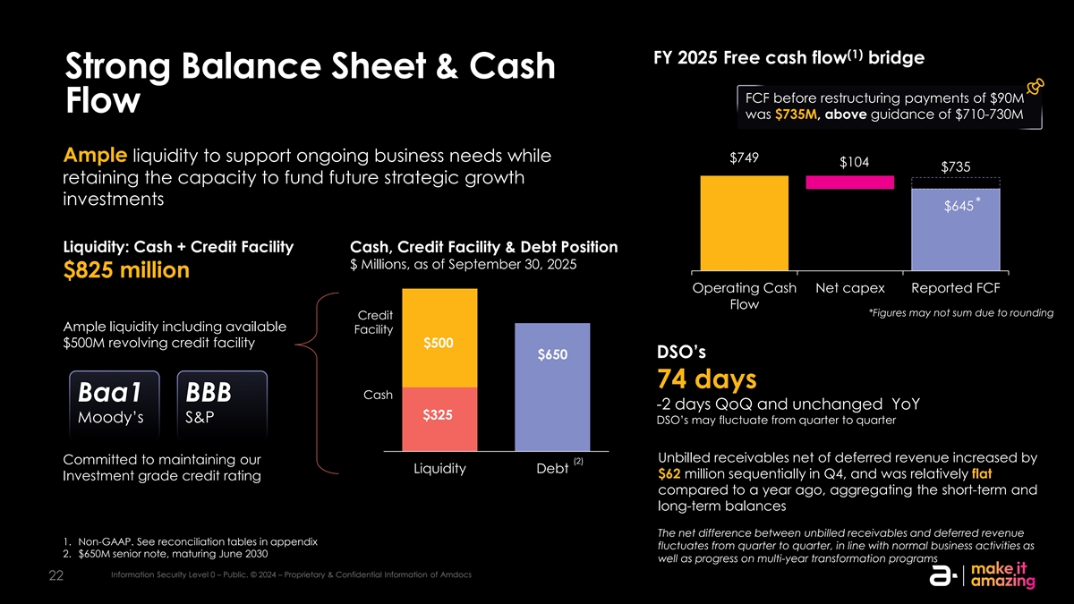 (1)2025财年自由现金流弥合强劲的资产负债表和重组付款前的现金FCF 9000万美元流量为7.35亿美元,高于7.10-7.3亿美元的指引充足的流动性以支持持续的业务需求,同时749美元104美元735美元保留为未来战略增长投资提供资金的能力*645美元流动性:现金+信贷便利现金、信贷便利和债务头寸百万美元,截至9月30日,2025年8.25亿美元经营现金净资本支出报告的FCF流量*由于四舍五入,信贷流动性充裕,包括可用的5亿美元循环信贷额度500美元DSO的650美元74天现金Baa1 BBB-2天环比和325美元同比不变,因此数字可能没有总和,穆迪的标普 DSO可能会因承诺在第四季度连续维持我们的(2)流动性债务6200万美元而增加的未开票应收账款净额而在季度间波动,与一年前相比,投资级信用评级相对持平,汇总短期和长期余额未开票应收款与递延收入的净差额1。非公认会计原则。见附录中的调节表每季度波动,与正常业务活动一致为2。6.5亿美元优先票据,将于2030年6月到期,以及多年转型计划的进展信息安全Level 0 –公开。©2024 – AMDOCs 22的专有和机密信息