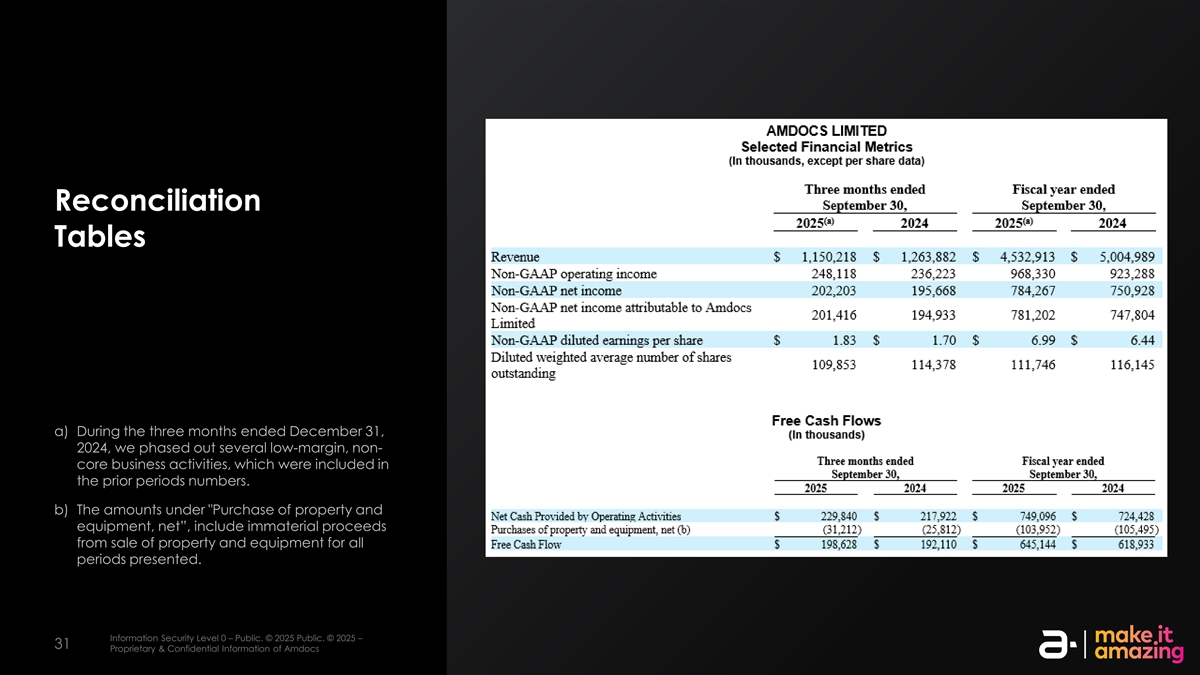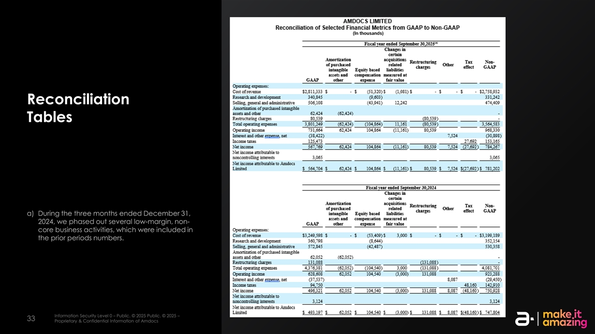 调节表a)在截至2024年12月31日的三个月内,我们逐步取消了几项低利润率、非核心业务活动,这些活动已包含在前期数字中。信息安全等级0–公开。©2025年公开。©2025 –信息安全0级–公。©2025年公开。©2025 – AMDOCs的专有和机密信息3232 AMDOCs的专有和机密信息